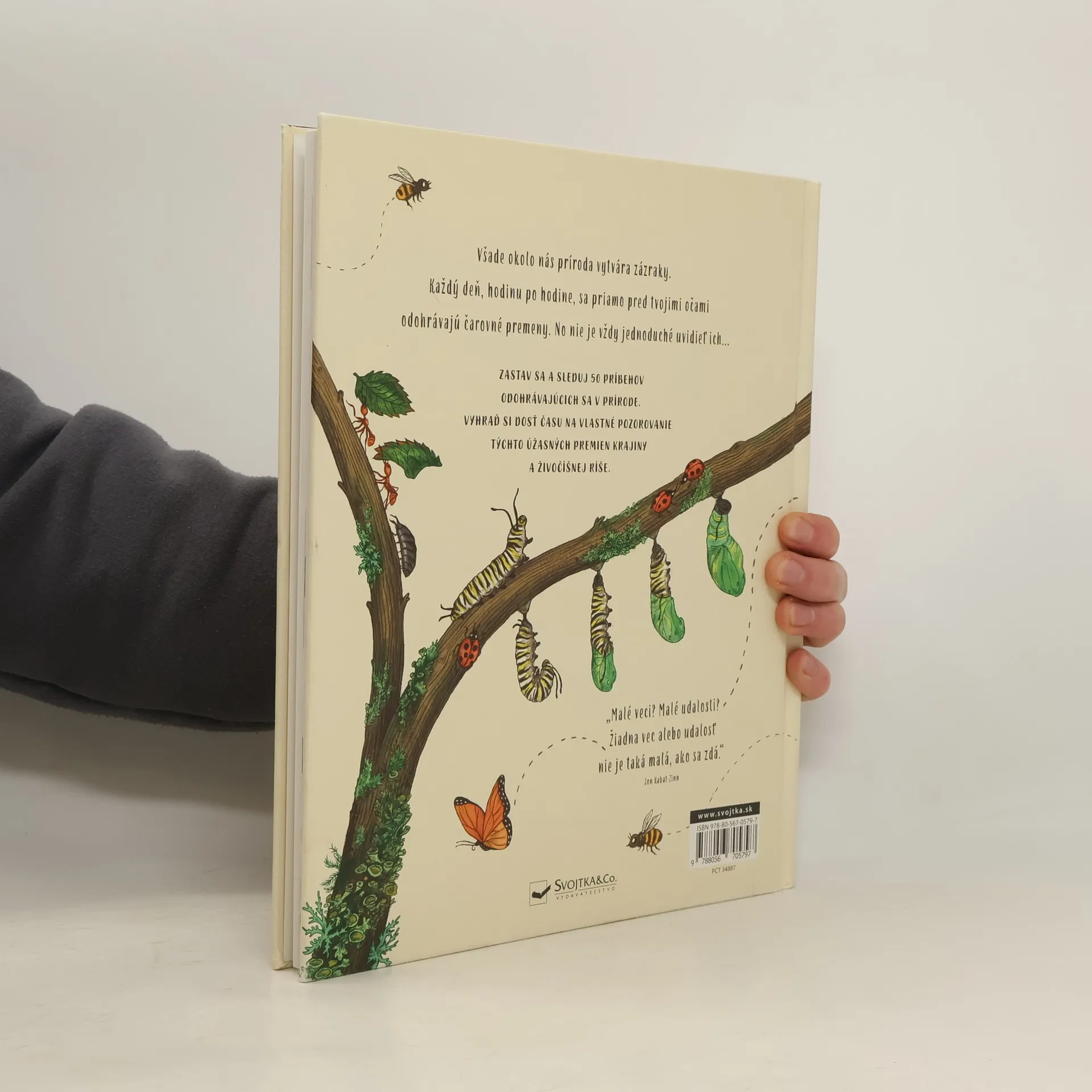 Táto kniha je plná úžasných udalostí, ktoré sa každý deň odohrávajú v prírode. Niektoré z nich trvajú dlho, dni i týždne napríklad húsenica, ktorá sa zakuklila a vyliahne sa ako dospelý motýľ, alebo veverička zahrabávajúca si zásoby žaluďov na zimu. Iné zbadáš iba v okamihu východslnka alebo mraky meniace svoj tvar. 50 príbehov z prírody sprevádzajú farebné ilustrácie. Zastav sa teda, prezeraj si knihu a sleduj tieto ohromné udalosti. Obdivuj prírodu v jej rozmanitosti. Uvidíš, čo všetko objavíš a spoznáš, keď si urobíš na prezeranie knihy a pozorovanie prírody dostatok času.
