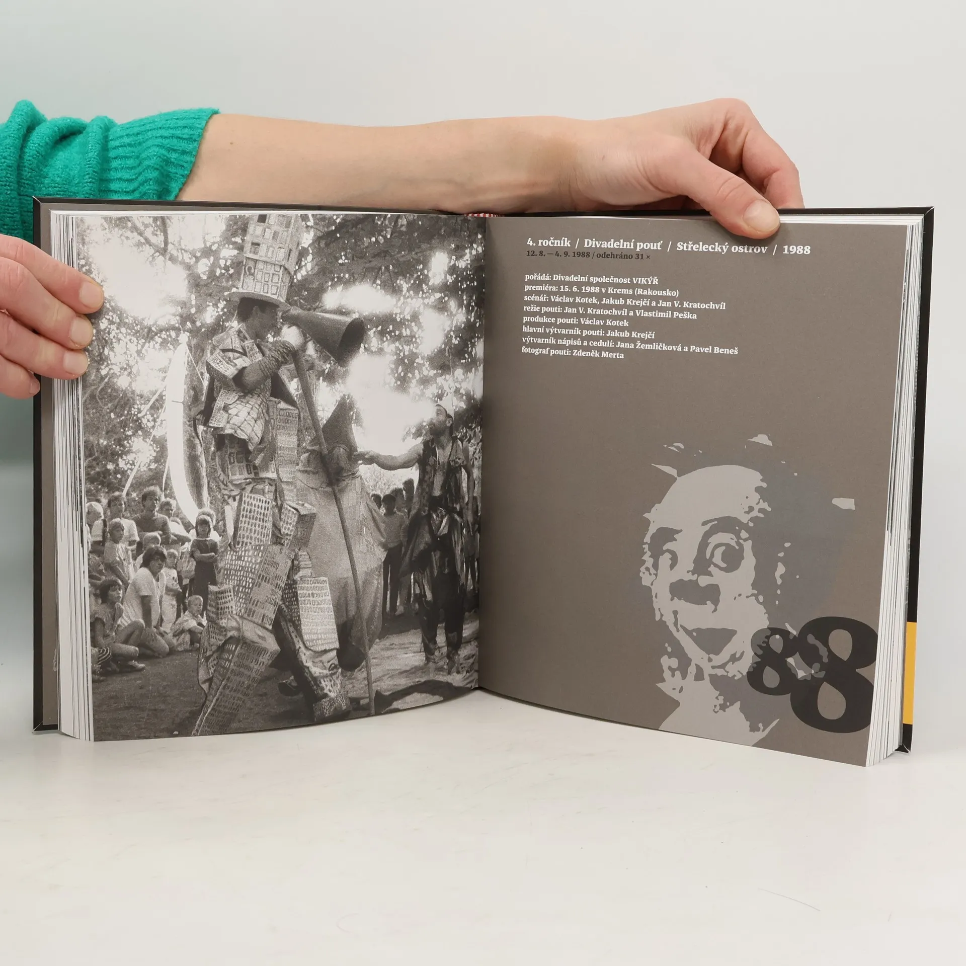 V létě roku 1985 se uskutečnil na Střeleckém ostrově v Praze I. ročník Divadelní pouti, plenérové nabídky z velkého spektra divadelních žánrů s přesahy k hudbě, výtvarnému umění a happeningu. Letní Praha na sklonku minulého režimu měla nulovou kulturní nabídku a pod slogany „tradic staropražské pouti“ se od tohoto roku každoročně v létě konalo jedinečné divadelní setkání mimů, klaunů, loutkářů, muzikantů, artistů a žonglérů, kteří v paralelní nabídce umožňovali prožít krásný podvečer na jindy pustém ostrově v centru města. Setkali se zde skoro všichni ti, kteří ve druhé polovině 80. let odmítali angažmá v tzv. kamenných divadlech, motorem akce byli Václav Kotek, Jan Kratochvíl a loutkář Jakub Krejčí. Zastihli bychom zde i výtvarníka Pavla Beneše, režiséra Karla Makonje, Radima Vašinku s jeho kočovnou trupou, bratry Formany, Boba Klepla, Václava Koubka, Evu Holubovou, Pavla Kočího, Jiřího Reidingera a celou plejádu dalších samorostlých osobností tehdejší divadelní periferie a podzemí, umělců, kteří vesměs odmítli vábení tehdejší moci a rozpočtových kulturních institucí. Kniha v grafické úpravě Jana Zachariáše nabízí 351 černobílých fotografií Zdeňka Merty, který na Divadelních poutích druhé poloviny 80. let po pět let doslova žil a vytvořil seriály tisíců záběrů. Právě za tyto fotografie Zdeněk Merta také získal Cenu Divadelních novin v kategorii Publikační počin v oblasti divadla za rok 2015.