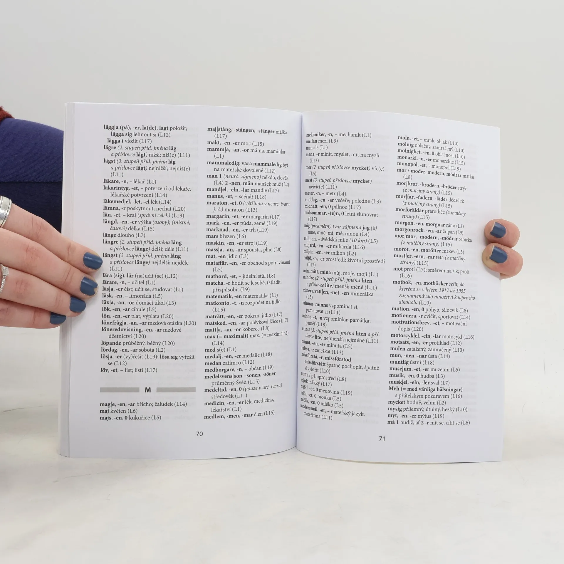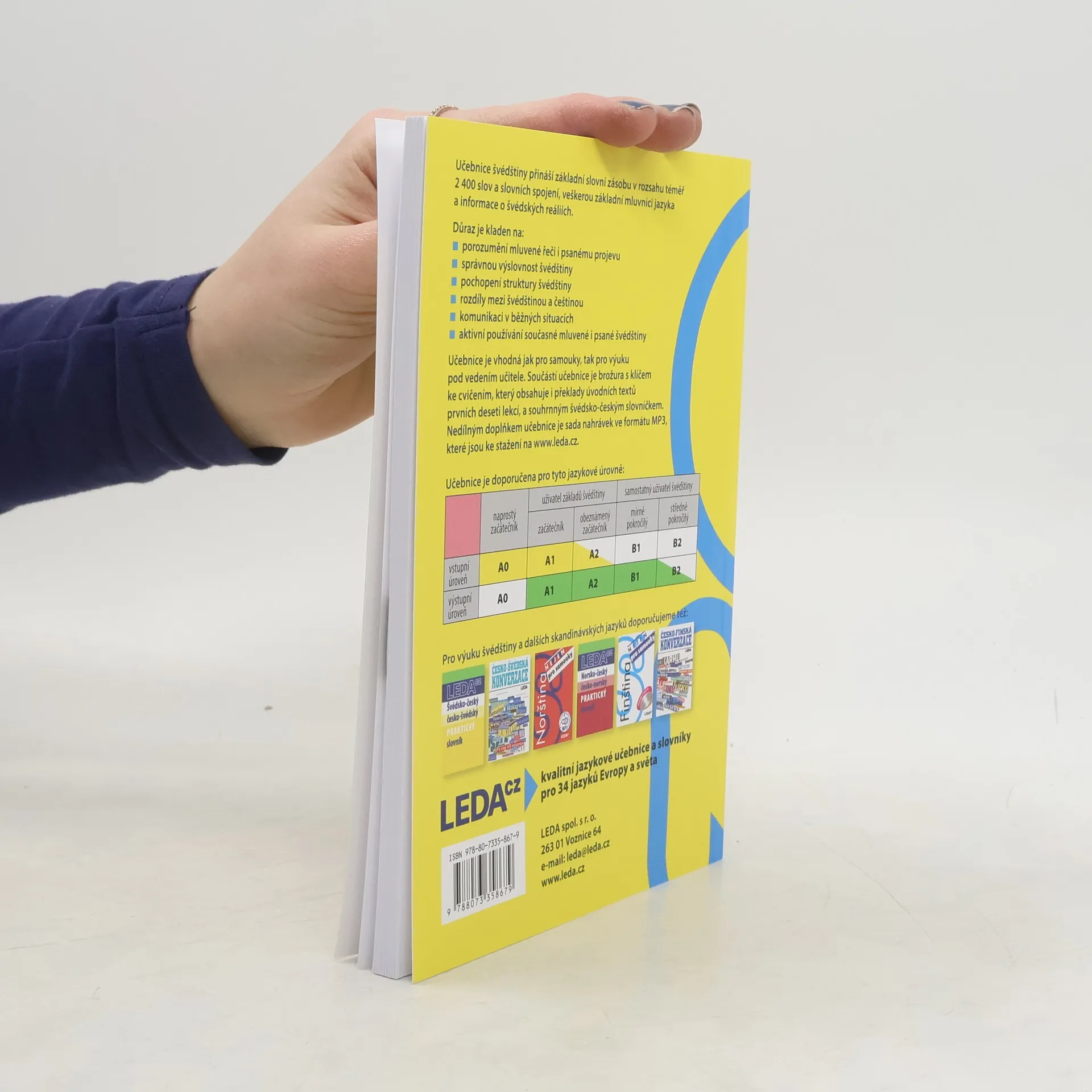 Učebnice švédštiny je určena jak pro samostatné studium, tak pro výuku pod vedením učitele. S její pomocí si osvojíte základní slovní zásobu v rozsahu téměř 2 400 slov, frazeologii, gramatiku a výslovnost švédštiny. Naučíte se komunikovat v běžných situacích a dozvíte se také hodněo švédských reáliích. Samostatná úvodní kapitola je věnována výslovnosti švédštiny. Každá z následujících dvaceti tematicky zaměřených lekcí obsahuje dva úvodní dialogy či texty, slovní zásobu, mluvnickou část, cvičení a doplňkovou část. Součástí učebnice je brožura s klíčem ke cvičením, který uvádí i překlady úvodních textů prvních deseti lekcí, a souhrnným švédsko-českým slovníčkem. Nedílný doplněk učebnice představuje nahrávka výslovnostních a poslechových cvičení, části slovní zásoby a úvodních textů v MP3. K dispozici je ke stažení pod touto anotací.
