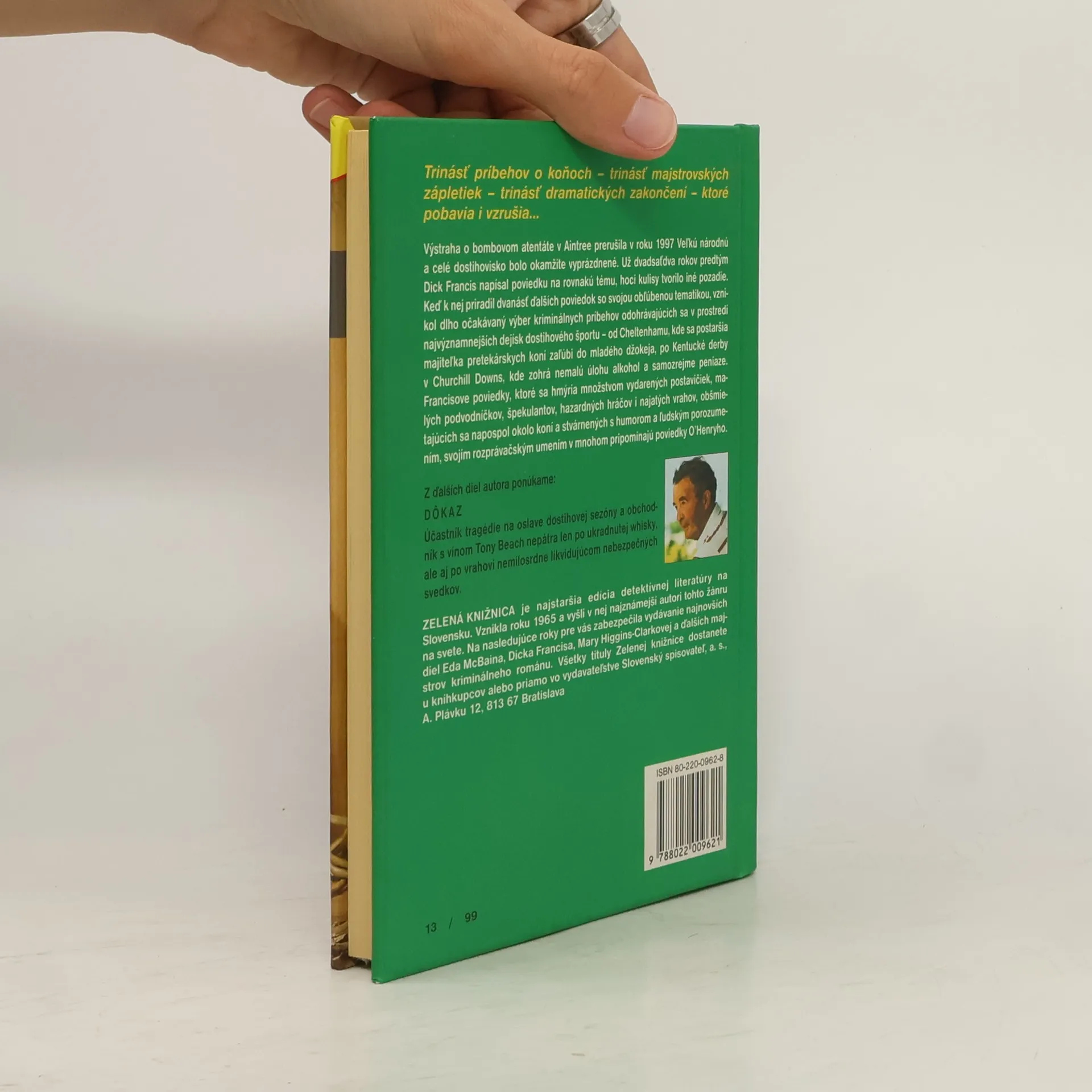 Trinásť príbehov o koňoch-trinásť majstrovských zápletiek-trinásť dramatických zakončení-ktoré pobavia i vzrušia. Výstraha o bombovom atentáte v Aintree prerušila v roku 1997 Veľkú národnú a celé dostihovisko bolo okamžite vyprázdnené. Už dvadsaťdva rokov predtým Dick Francis napísal poviedku na rovnakú tému, hoci kulisy tvorilo iné pozadie. Keď k nej priradil dvanásť ďalších poviedok so svojou obľúbenou tematikou, vznikol dlho očakávaný výber kriminálnych príbehov odohrávajúcich sa v prostredí najvýznamnejších dejísk dostihového športu-od Cheltenhamu, kde sa postaršia majiteľka pretekárskych koní zaľúbi do mladého džokeja, po Kentucké derby v Churchill Downs, kde zohrá nemalú úlohu alkohol a samozrejme peniaze. Francisove poviedky, ktoré sa hmýria množstvom vydarených postavičiek, malých podvodníčkov, špekulantov, hazardných hráčov i najatých vrahov, obšmietajúcich sa napospol okolo koní a stvárnených s humorom a ľudským porozumením, svojím rozprávačským umením v mnohom pripomínajú poviedky O.Henryho. Poviedky: Hrozba v Kingdom Hille, Červená je farba smrti, Pieseň pre Monu, Jasná biela hviezda, Kolízia na trati, Nočná mora, Mrkva pre gaštanového koňa, Dar, Jarná horúčka, Šanca naslepo, Cesta k spravodlivosti, Deň porazených, Haigova smrť.