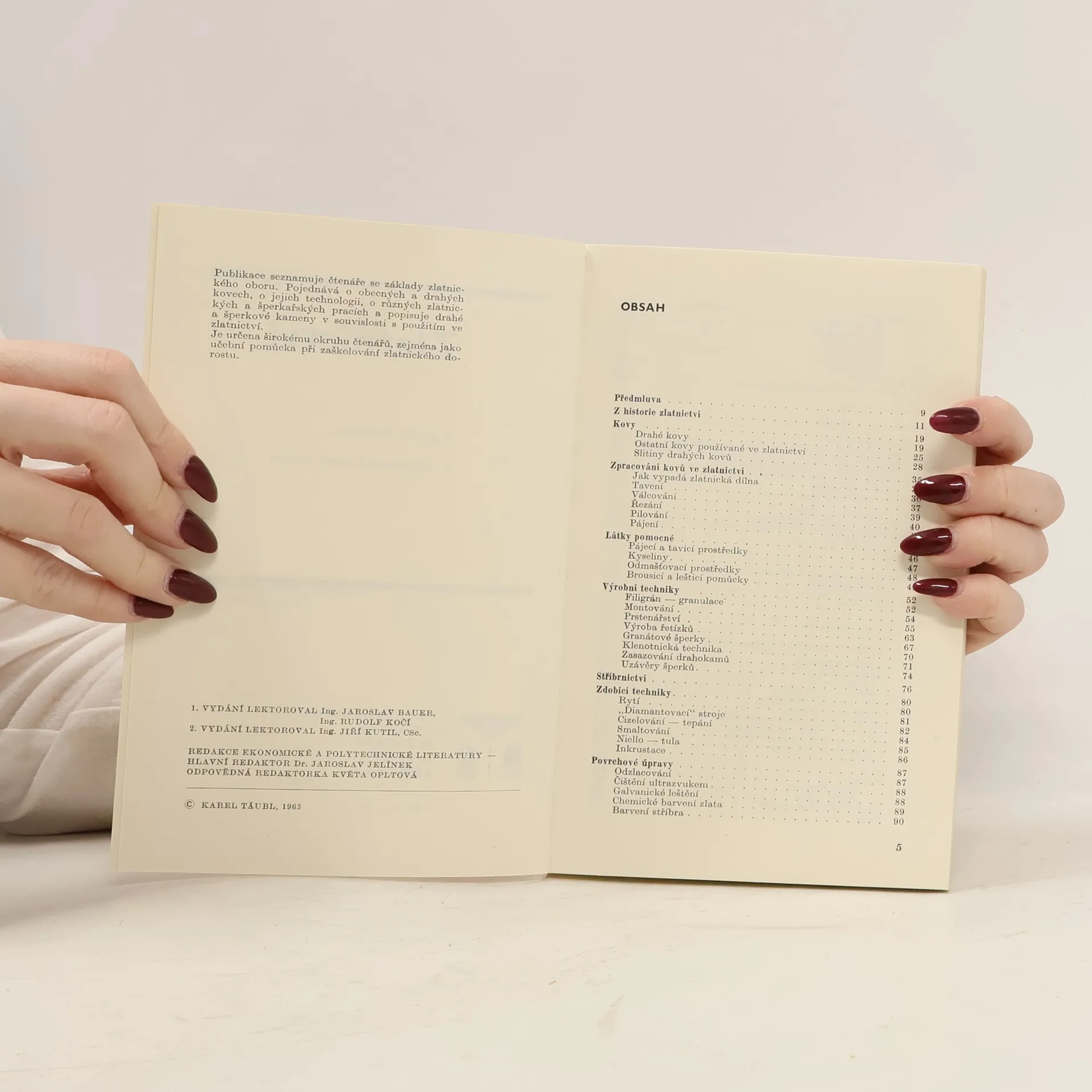 Ve stručném souhrnném přehledu uvádí autor základní informace o materiálech, speciálních pracích a pracovních postupech ve zlatnickém a stříbrnickém řemesle. Druhé vydání doplnil novými technologickými poznatky, stručnou rekapitulací vývoje zlatnictví v českých zemích od dob Velké Moravy a opatřil je převážně novými ilustracemi. 2. přepracované vydání.