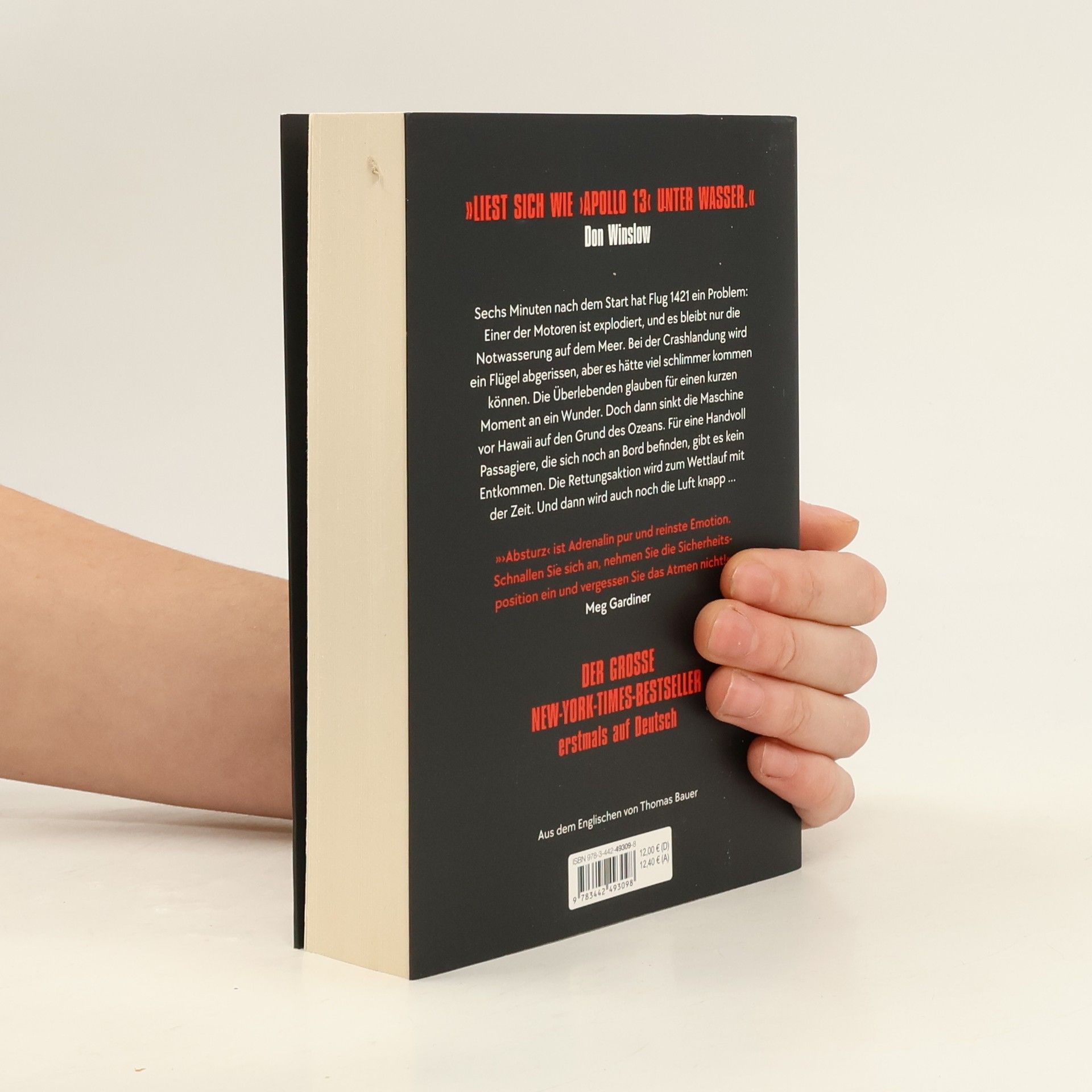 »Liest sich wie ›Apollo 13‹ unter Wasser.« Don Winslow Ein gesunkenes Flugzeug, eingeschlossene Passagiere und eine fast aussichtslose Rettungsaktion ... Sechs Minuten nach dem Start stürzt Flug 1421 ins Meer. Die Überlebenden des Crashs glauben für einen kurzen Moment an ein Wunder – sie haben es geschafft! Dann sinkt die Maschine vor Hawaii auf den Grund des Ozeans. Und es gibt es kein Entkommen. Obwohl die Chancen auf Rettung minimal sind, wird sofort ein Großeinsatz geplant. Doch die Zeit läuft gegen die im Flugzeug eingeschlossenen Passagiere. Denn bald wird auch die Luft knapp ... »›Absturz‹ ist Adrenalin pur und reinste Emotion. Man ist von der ersten Seite an gebannt, wenn Crew und Passagiere eines gesunkenen Flugzeugs um ihr Überleben kämpfen und Rettungskräfte einen Wettlauf gegen die Zeit gewinnen müssen. Schnallen Sie sich an, nehmen Sie die Sicherheitsposition ein, und vergessen Sie das Atmen nicht!« Meg Gardiner