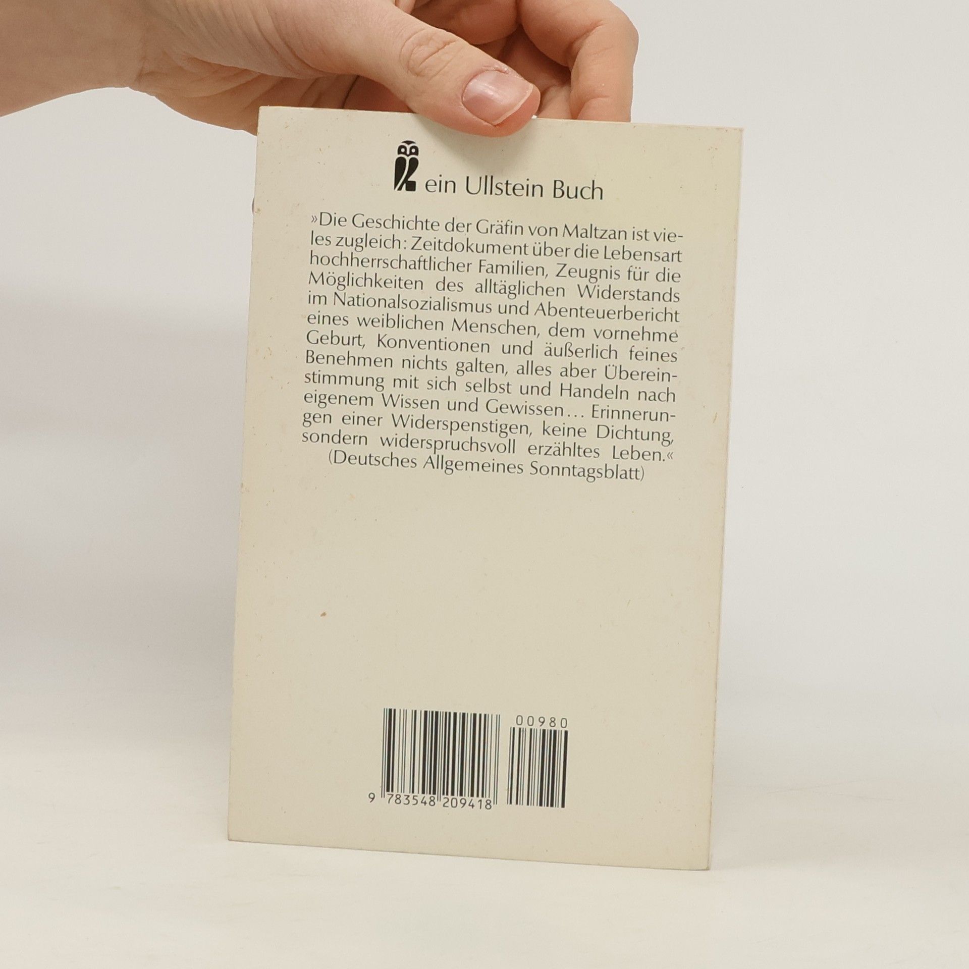 Die Geschichte der Gräfin von Maltzan is vieles zugleich: Zeitdokument über die Lebensart hochherrschaftlicher Familien, Zeugnis für die Möglichkeiten des alltäglichen Widerstands im Nationalsozialismus und Abenteuerbericht einer Frau, der vornehme Geburt und Konventionen nichts galten, alles aber Übereinstimmung mit sich selbst und handeln nach eigenem Wissen und Gewissen.