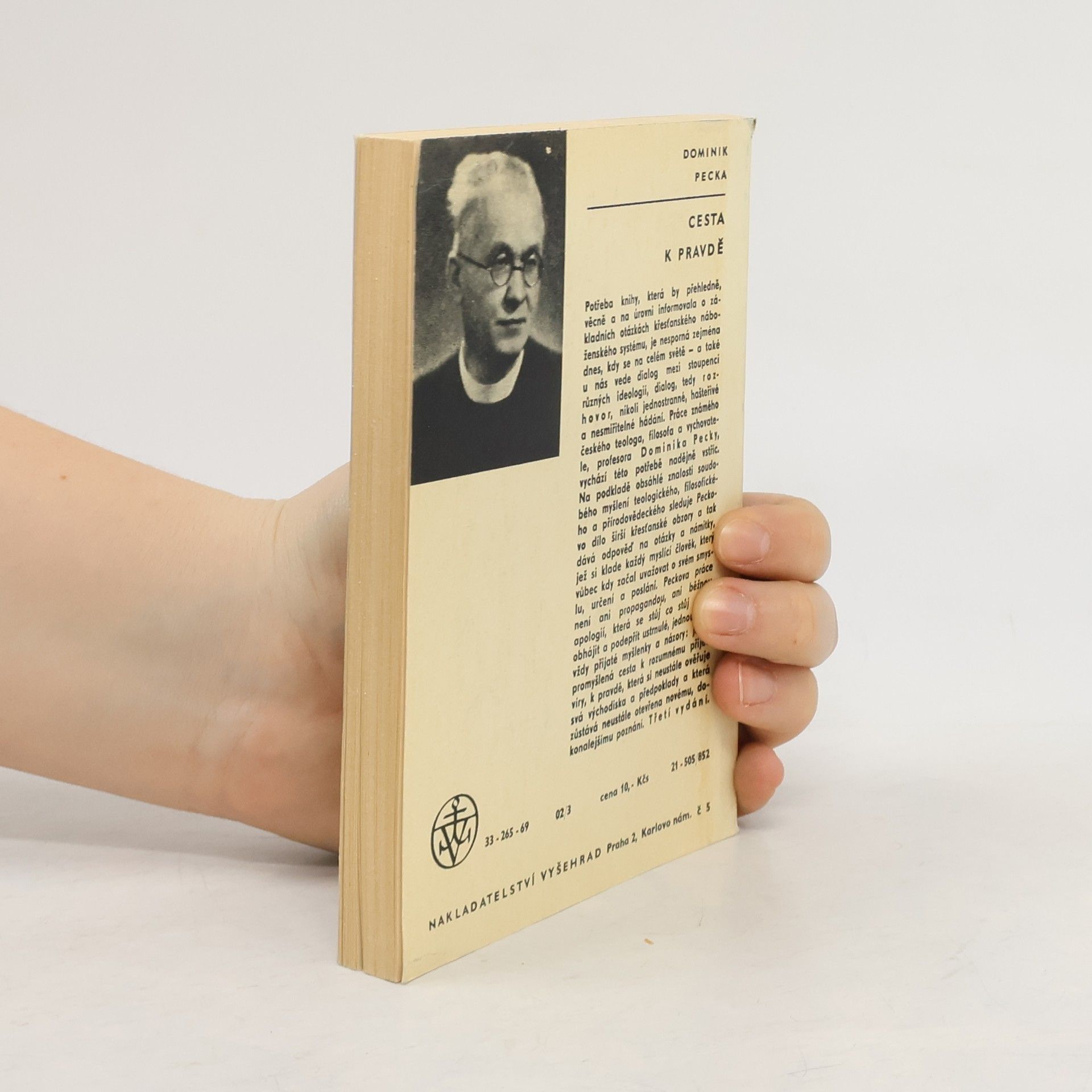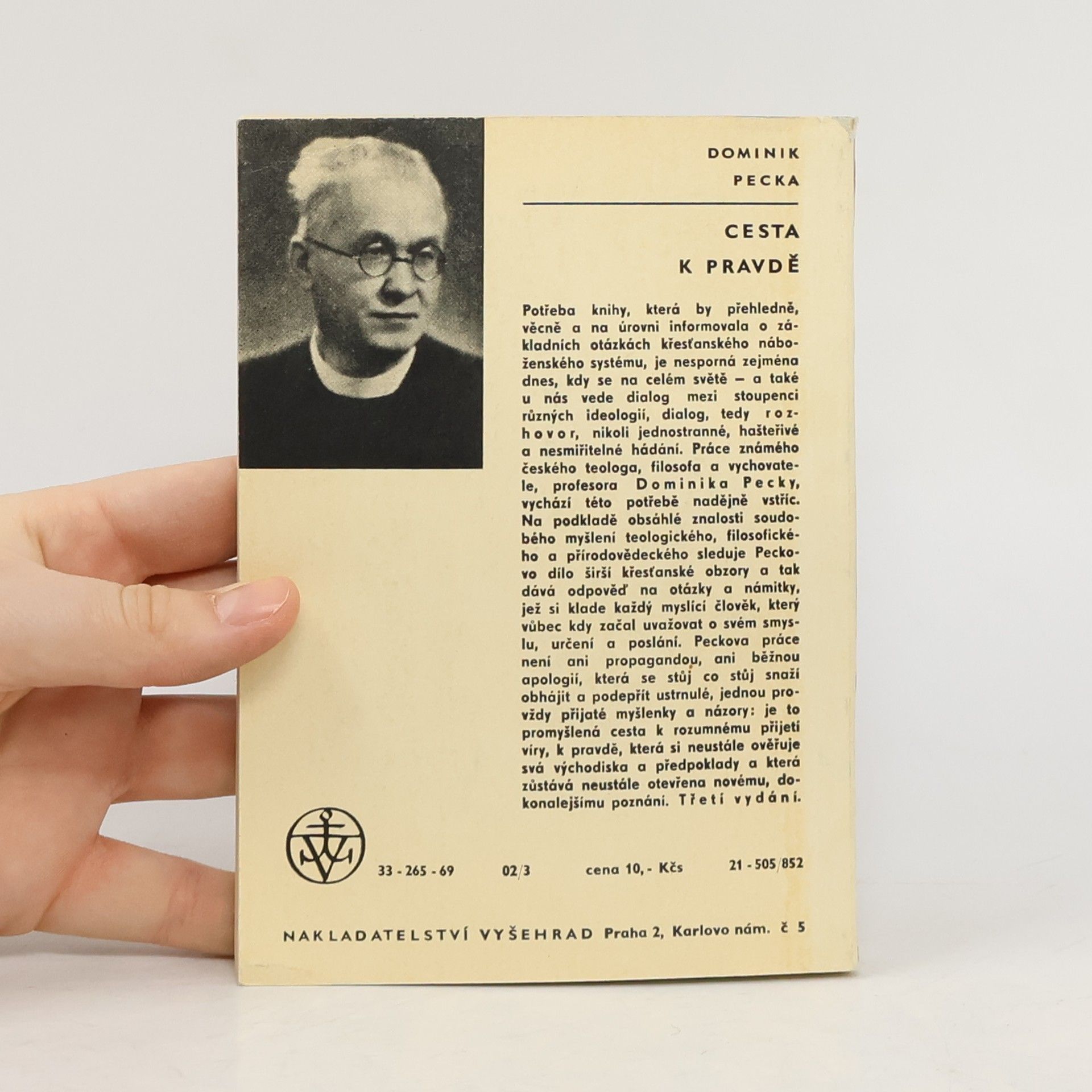 "Potřeba knihy, která by přehledně, věcně a na úrovni informovala o základních otázkách křesťanského náboženského systému, je nesporná zejména dnes, kdy se na celém světě - a také u nás vede dialog mezi stoupenci různých ideologií, dialog, tedy r o z h o v o r, nikoli jednostranné, hašteřivé a nesmiřitelné hádání. Práce známého českého teologa, filosofa a vychovatele Dominika Pecky, vychází této potřebě nadějně vstříc. Na podkladě obsáhlé znalosti soudobého myšlení teologického, filosofického a přírodovědeckého sleduje Peckovo dílo širší křesťanské obzory a tak dává odpověď na otázky a námitky, jež si klade každý myslící člověk, který vůbec kdy začal uvažovat o svém smyslu, určení a poslání. Peckova práce není ani propagandou, ani běžnou apologií, která se stůj co stůj snaží obhájit a podepřít ustrnulé, jednou provždy přijaté myšlenky a názory: je to promyšlená cesta k rozumnému přijetí víry, k pravdě, která si neustále ověřuje svá východiska a předpoklady a která zůstává neustále otevřena novému, dokonalejšímu poznání." Vydání třetí.