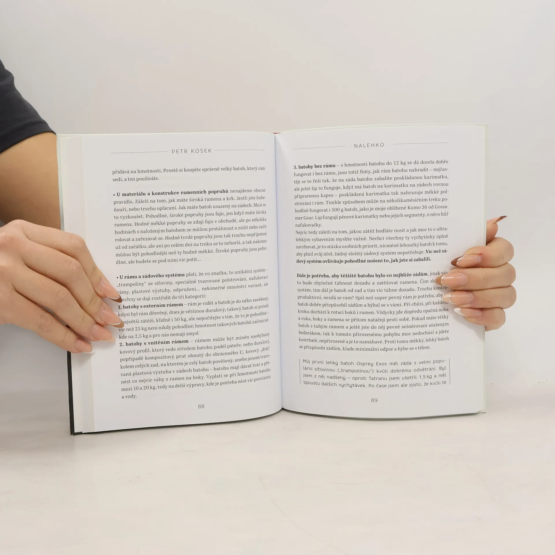 Pokud se Vám zdá nereálné zredukovat svou základní výbavu třeba i na měsíční trek maximálně do 7 kg, právě pro vás je určena tato publikace. Petr Kosek je držitelem ocenění Triple Crown, což znamená, že přešel všechny tři dálkové americké treky. Díky přípravám na ně objevil kouzlo ultralehkého vybavení. Autor v knize představí veškeré ozkoušené tipy a ukáže vám, jak je nesmírně osvobozující pohybovat se krajinou s hlavou vzpřímenou, bez bolesti zad, ramen a kolen. Jednotlivé tematické okruhy se dotknout bezpečnosti, oblečení, spaní, batohů, vaření, vody, jídla, map, navigace a taky základních návyků pro fungování na treku. Vše doplněno o zajímavosti, vlastní zážitky z cest, ilustrace a fotografie.