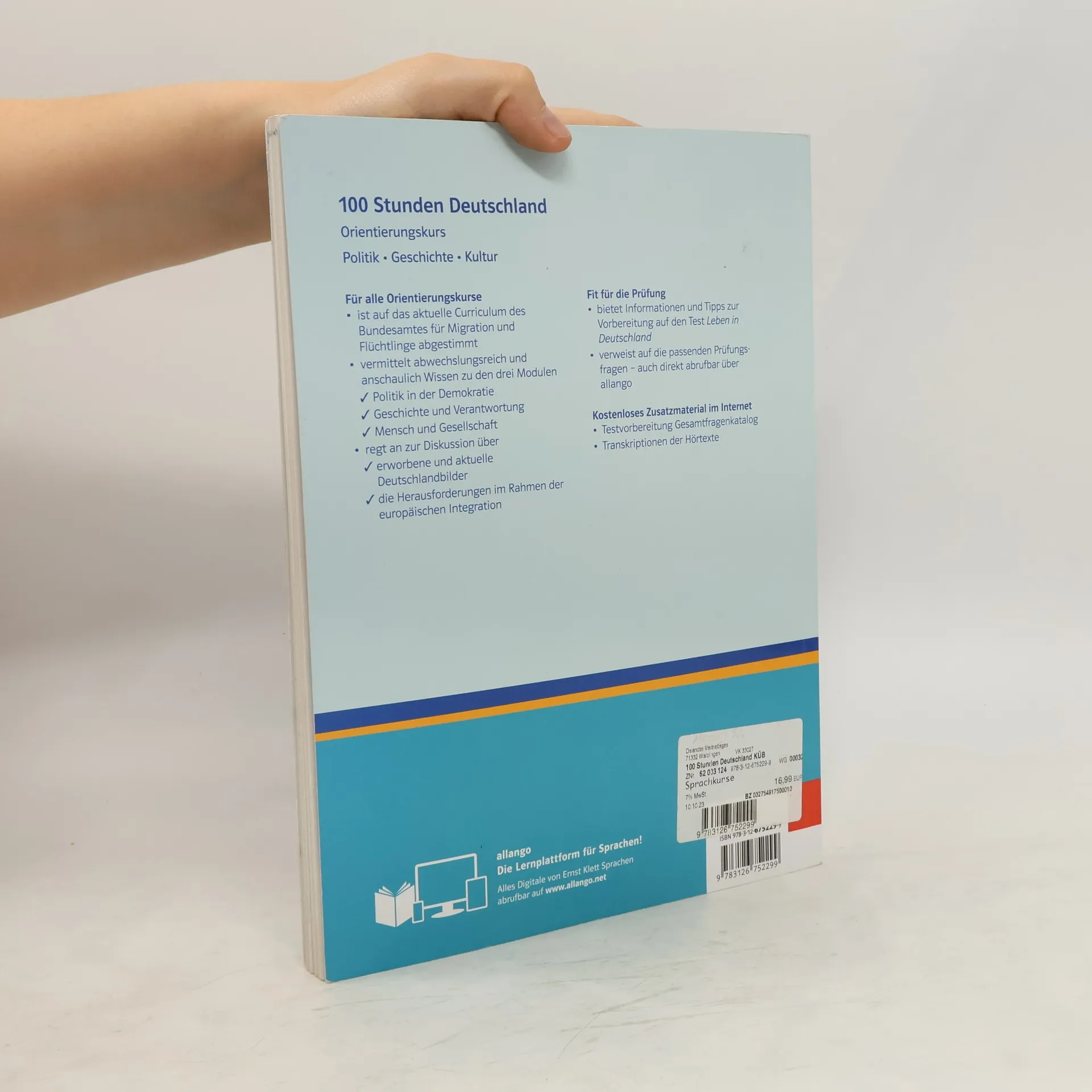 Der Orientierungskurs 100 Stunden Deutschland ist für alle Orientierungskurse geeignet und kurstragend einsetzbar. Er ist auf das aktuelle Curriculum des Bundesamtes für Migration und Flüchtlinge abgestimmt. Der Kurs vermittelt abwechslungsreich und anschaulich Wissen zu den drei Modulen: Politik in der Demokratie, Geschichte und Verantwortung, Mensch und Gesellschaft. Außerdem regt er zur Diskussion über erworbene und aktuelle Deutschlandbilder sowie über die Herausforderungen im Rahmen der europäischen Integration an. 100 Stunden Deutschland bietet Informationen und Tipps zur Vorbereitung auf den Test Leben in Deutschland . Im Buch wird auf die passenden Prüfungsfragen verwiesen.