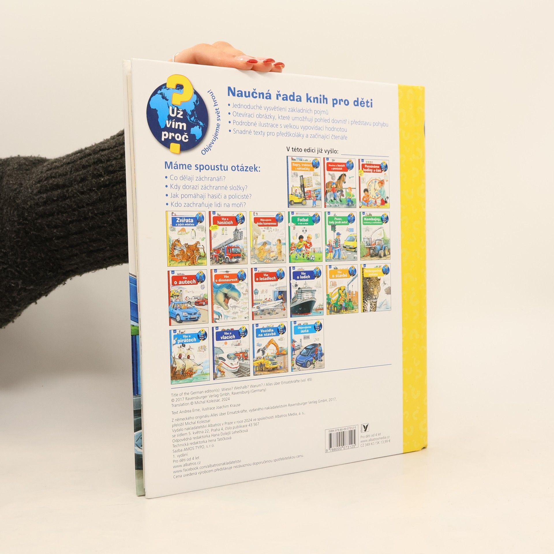 Co dělá záchranář a jaké má vybavení? To se dozvíš v další knize z edice Už vím proč. Jémine! Nákladní cisterna se srazila s těžařským vozem. Ale záchrana už je nadosah. Hasiči, technici a policie zajišťují místo nehody, zatímco lékař záchranné služby a jeho kolegové ošetřují zraněné. Ať už jde o povodeň, zemětřesení nebo bankovní loupež, mnoho žen a mužů je vždy připraveno pomoci! Tato kniha představuje kromě samotných záchranářů také jejich zásahová vozidla i speciální vybavení.