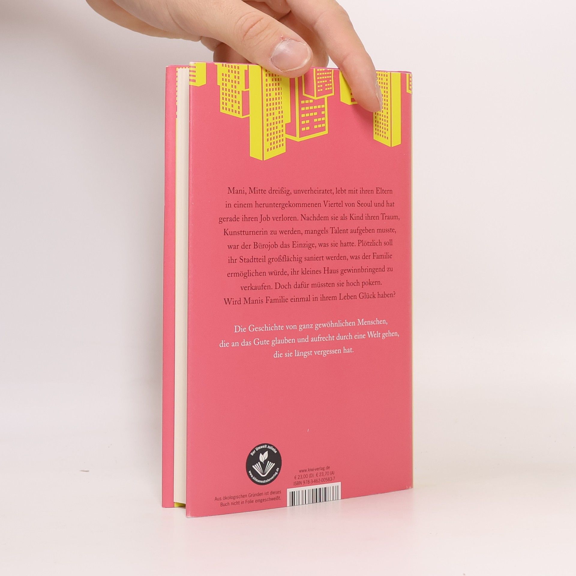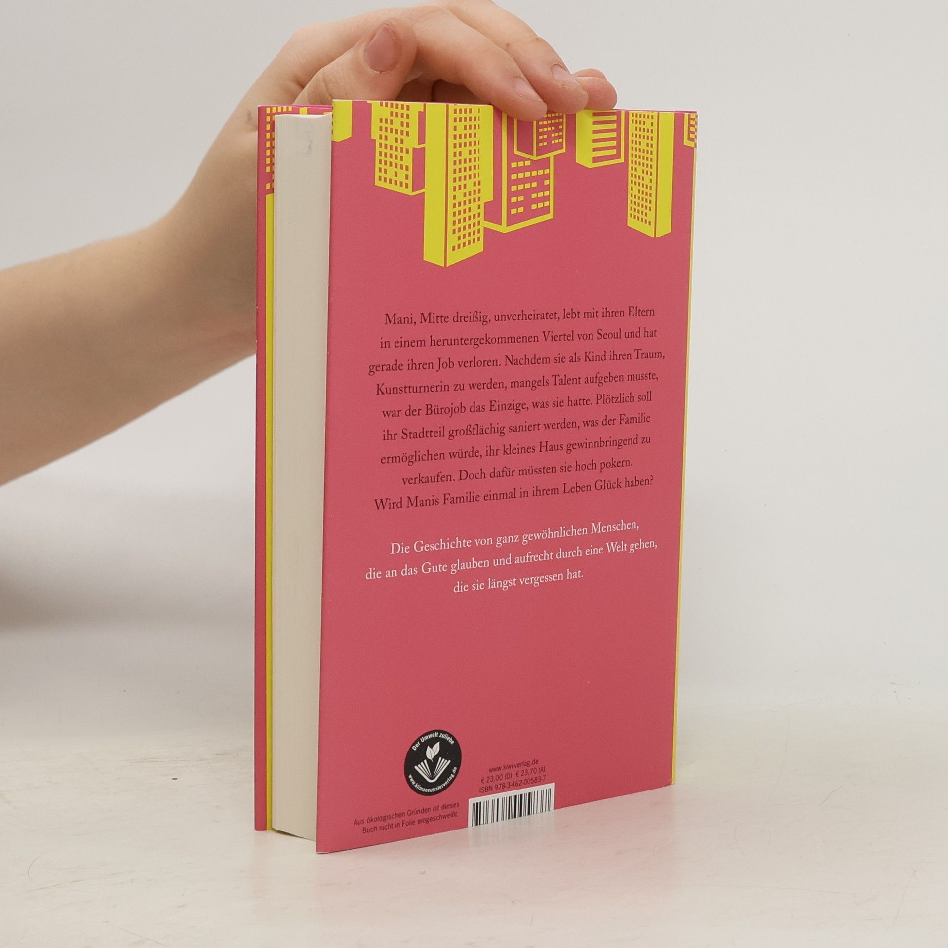 Die koreanische Bestsellerautorin Cho Nam-Joo widmet sich in diesem Entwicklungsroman einem Frauenleben, das geprägt ist von Armut und der immensen Scham, mit Mitte 30 noch unverheiratet zu sein. Manis Familie lebt in einem der ärmsten Stadtteile von Seoul. Ihr Vater arbeitet in einem Imbiss und ihre Mutter ist erwerbslos. Als kleines Mädchen träumte Mani davon, rhythmische Sportgymnastin zu werden, inspiriert durch Fernsehbilder der Olympischen Spiele 1988 in Seoul. Als Kind fängt sie mit dem Turnen an, muss aber schnell einsehen, dass sie im Vergleich zu anderen kein Talent hat. Sie wird ein einfaches, unerfülltes Leben führen, auch geprägt von der Demütigung, mit Mitte dreißig noch keine eigene Familie zu haben. Die Nachricht von der Stadtteilsanierung lässt die Immobilienpreise in die Höhe schießen, gleichzeitig erfährt Manis Familie zufällig, dass die Sanierung abgeblasen werden solle. Als ein Fremder ihr Haus kaufen will, ist die Familie uneins darüber, ob sie diesem gutmütigen Mann die Wahrheit sagen oder ihn täuschen soll. Ihr ganzes Leben lang haben sie sich an das Prinzip der Ehrlichkeit gehalten. Welche Entscheidung werden sie treffen, wenn sie vor dem größten Dilemma ihres Lebens stehen?