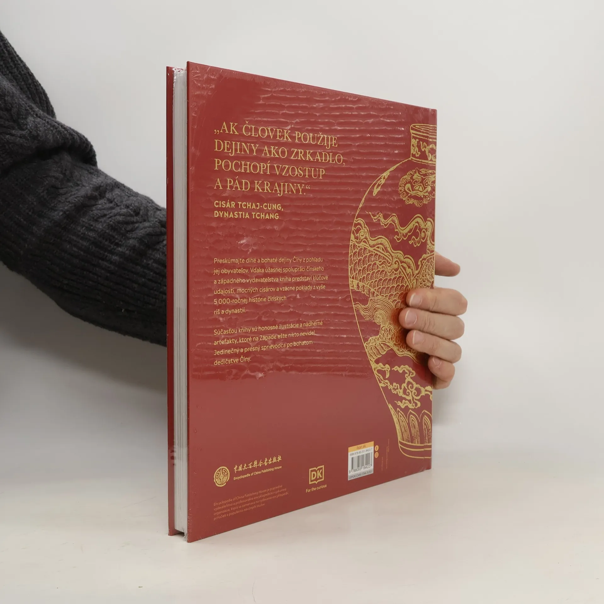 Kniha vďaka jedinečnej spolupráci popredných svetových vydavateľstiev Dorling Kindersley (DK) a Encyclopedia of China Publishing House poskytuje vyvážený opis dejín Číny. Prináša jedinečné nahliadnutie do čínskej kultúry a spoločnosti a slúži ako úžasná vizuálna kronika minulosti Číny od mýtických panovníkov, ktorí vládli asi pred 5 000 rokmi, až po posledného cisára dynastie. Zároveň dáva odpovede na mnohé otázky, napríklad ako sa dynastiám Tchang a Sung darilo riadiť obrovské ríše, kedy ľudia vynašli písmo a peniaze a prečo postavili Čínsky múr. Skúma kľúčové čínske predstavy a mapuje široký rozsah histórie počas tisícročí, opisuje stovky významných konfliktov a vyzdvihuje príbehy výnimočných jednotlivcov. Publikácia predstavuje pokladnicu portrétov, malieb, fotografií a artefaktov, ktoré na Západe ešte nikto nevidel. Súčasťou rozprávania sú aj príbehy o legendárnej technickej zručnosti a o čínskych inováciách siahajúcich od výroby hodvábu cez tlač a objav železa až po vynájdenie kompasu a strelného prachu.