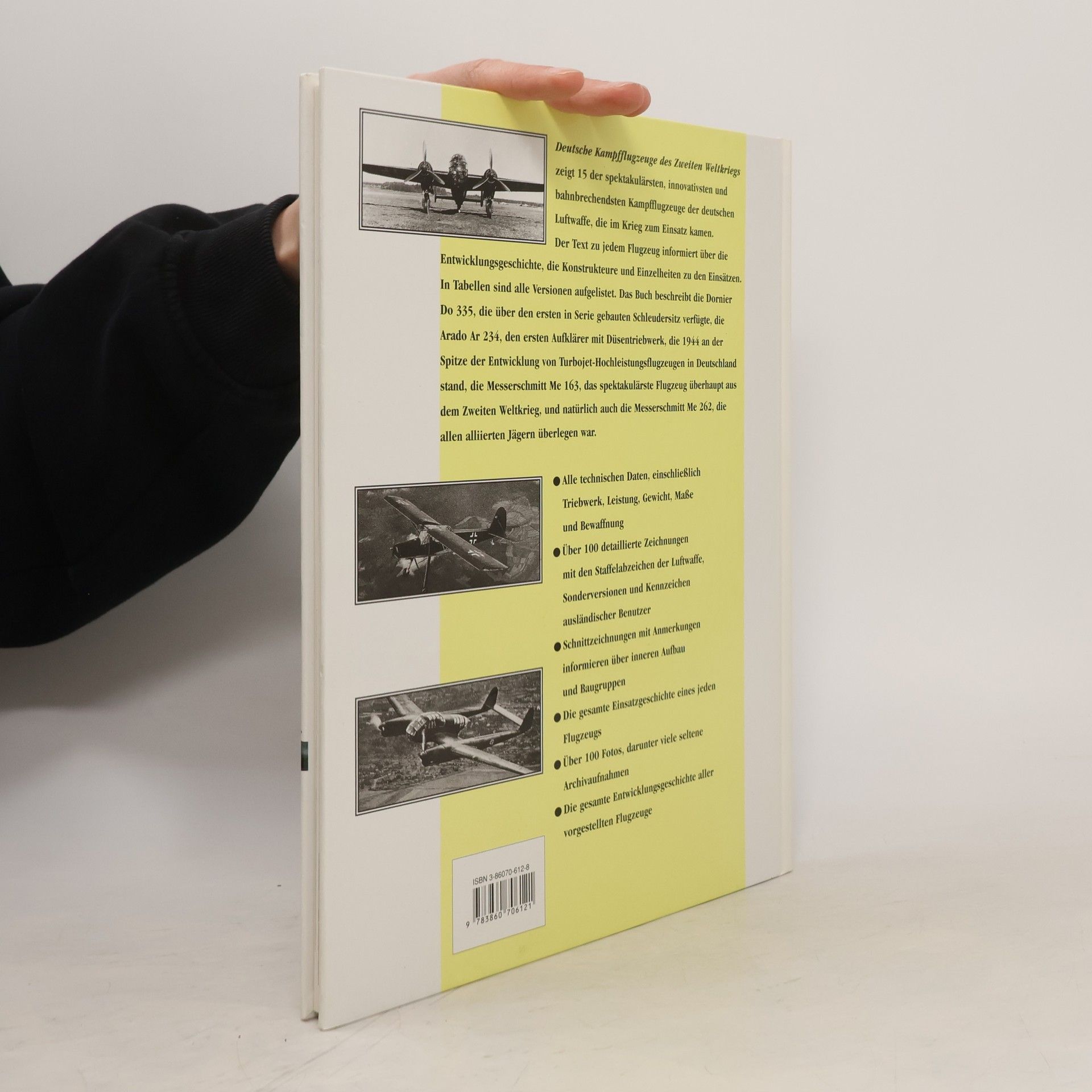 Bilddokumentation über bekannte deutsche Militärflugzeuge (Vorkriegsmodelle), darunter die Me 163, der Fieseler Storch, der Arado Blitz, die Fw 189 u.a. Keine systematische Darstellung, sondern eine Sammlung ausführlicher Porträts einzelner Modelle mit technischen Beschreibungen, Schnittzeichnungen, Fotos und Texten zu Bau, Entwicklung, Einsatz. Preiswerte, breit einsetzbare Ergänzung zur Gesamtdarstellung von R. Kosin (ID 29/83). (2) (LK/N: Pleuß)