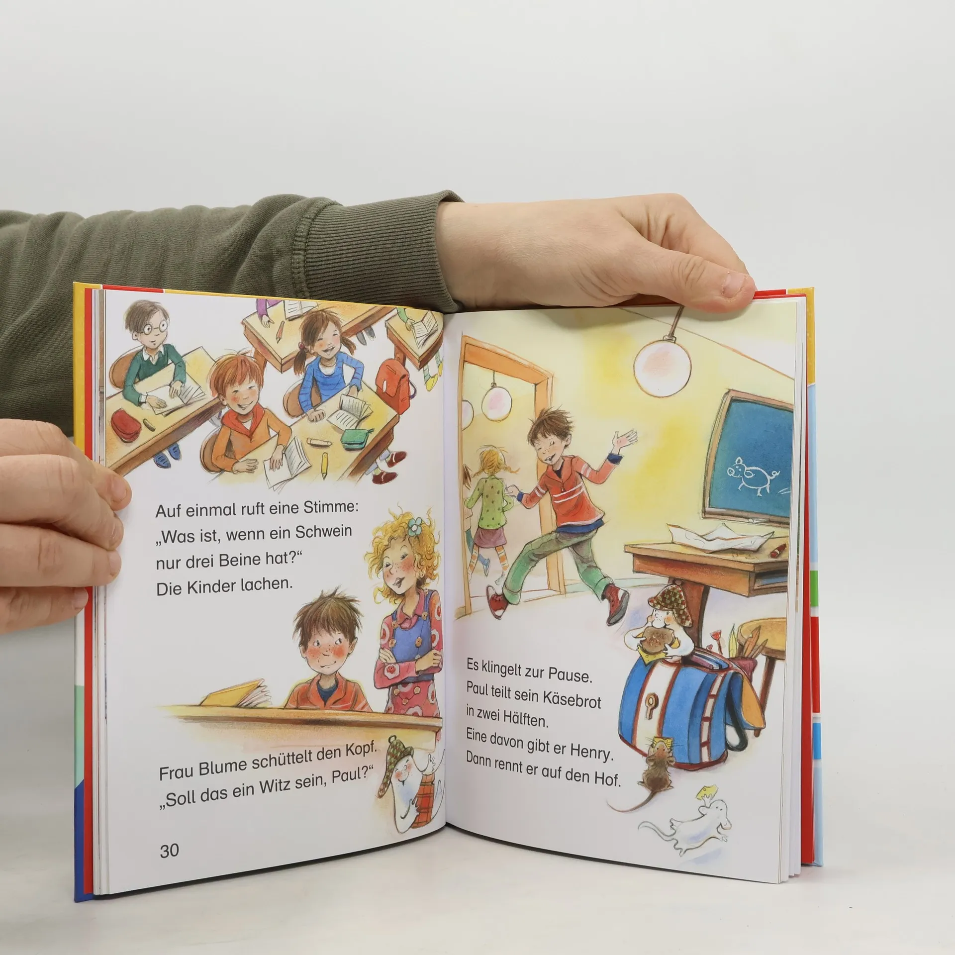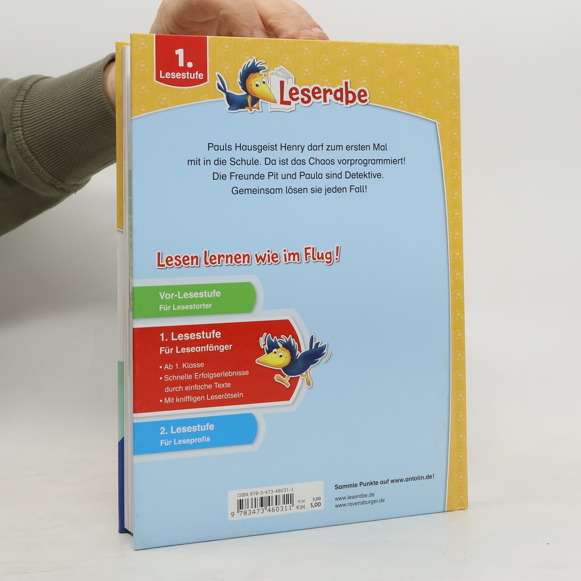 Paul nimmt seinen Freund, den schottischen Hausgeist Henry, mit in die Schule. Zur Feier des Tages fällt sogar das Diktat aus. Pit und Paula sind Detektive. Ob ein geklauter Ohrring oder ein fehlendes Stück Geburtstagstorte – Zusammen lösen sie die aufregendsten Fälle. Zwei Leseraben-Geschichten in einem Band mit großer Fibelschrift und einfachem Wortschatz, die sich perfekt zum Lesenlernen eignen. Lesen lernen mit dem Ravensburger LeserabenDie 1. Lesestufe spricht Kinder an, die mit dem Leselern-Prozess begonnen haben, und bietet ideale Bücher für Leseanfänger. Kurze Textabschnitte, einfacher Wortschatz sowie die extragroße Fibelschrift erleichtern Kindern das Lesen. Leserätsel für Leseanfänger und spannende Geschichten machen das Lesenlernen zu einem echten Vergnügen.