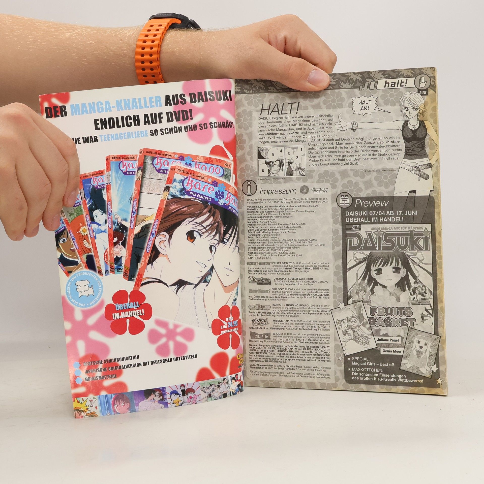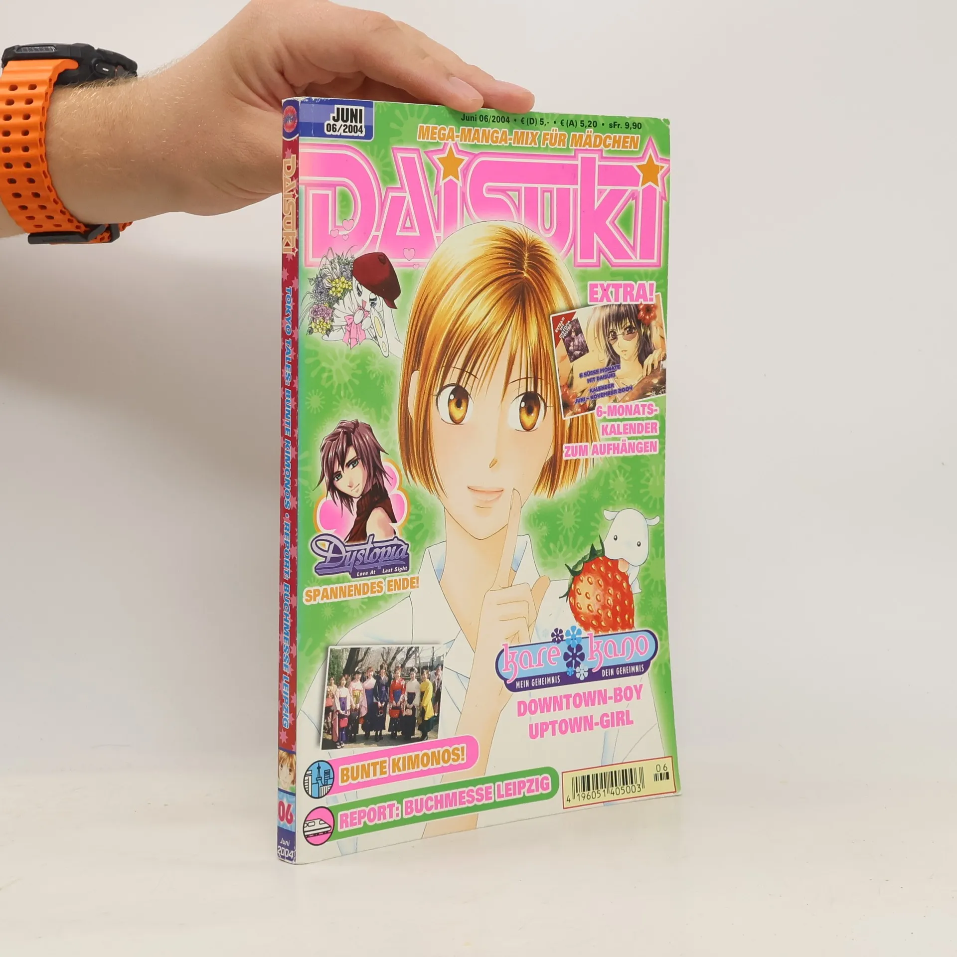 Im Juni ist es draußen meist schöner als drinnen - ideal also, um mit einem blumigen Kimono an die frische Luft zu gehen. Wie und wo das japanische Traditionsgewand getragen wird, erzählt euch Hitomi in den "Tokyo Tales". In der "DAISUKI Lounge" blitzen die wunderbaren Frühlingsbilder des zweiten Copic Ciao Marker-Wettbewerbs, in "On Tour" lassen wir noch einmal die spannende Leipziger Buchmesse und den Besuch von Dragonball-Erfinder Akira Toriyama Revue passieren. Eine ausführliche Vorstellung des spannenden Shojo Manga "Please Save My Earth" wartet auf vier bunten Seiten "Close Up", und auch in den Serien "W Juliet", "Kare Kano", "Fruits Basket" und "Skip Beat!" geht es wieder heiß her. Das sechste Kapitel von "Dystopia" ist gleichzeitig der Schluss dieses melancholisch-schönen Mangas und auch "Missile Happy!" verabschiedet sich vorerst von uns - aber kein Grund zur Sorge, denn Judith und Miki Kiritani kommen wieder! Für alle Fans des Textildrucks gibt es ein tolles Gewinnspiel und natürlich ist es wieder an der Zeit für ein besonders schönes Extra - ganz exklusiv in diesem Heft: Der DAISUKI-Kalender!