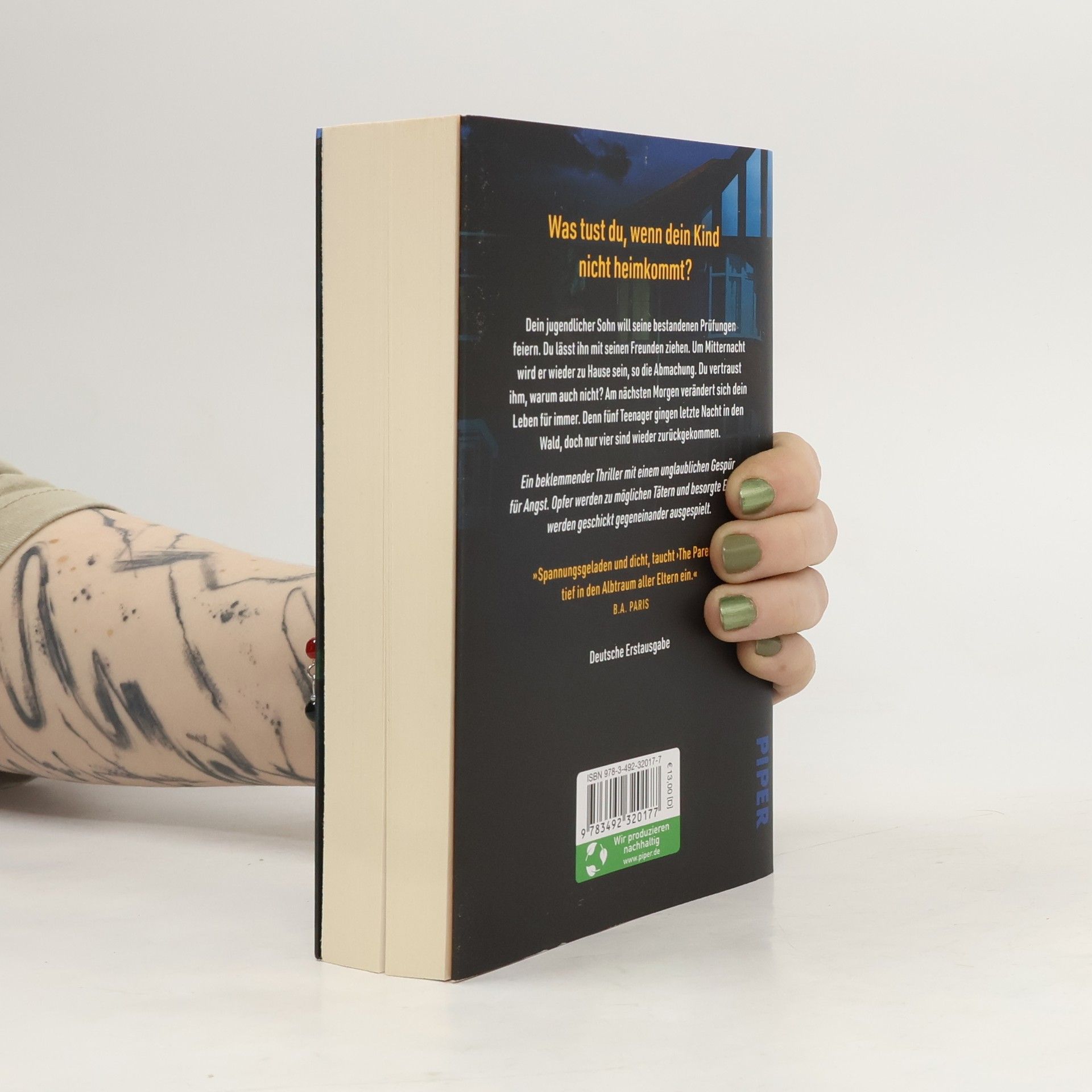 »Dieser Thriller wird Ihnen den Schlaf rauben!« KARIN SLAUGHTER ----- Was tust du, wenn dein Kind nicht heimkommt? Dein jugendlicher Sohn will seine bestandenen Prüfungen feiern. Du lässt ihn mit seinen Freunden ziehen. Um Mitternacht wird er wieder zu Hause sein, so die Abmachung. Du vertraust ihm, warum auch nicht? Am nächsten Morgen verändert sich dein Leben für immer. Denn fünf Teenager sind letzte Nacht in den Wald gegangen, doch nur vier sind wieder herausgekommen. Und die Wahrheit zu sagen, könnte bedeuten, alles zu verlieren ... Ein dichter und beklemmender Thriller mit einem unglaublichen Gespür für Angst. Opfer werden zu möglichen Tätern und besorgte Eltern geschickt gegeneinander ausgespielt. ----- »Dieses Buch ist vollgepackt mit Wendungen, die Sie wachhalten werden.« Heat Magazine »Ein Thriller, der genau auf den Punkt bringt, was es bedeutet, eine Familie zu sein.« Gillian McAllister »Beklemmung hoch drei.« Linwood Barclay »Spannungsgeladen und dicht, taucht ›The Parents‹ tief in den Albtraum aller Eltern ein.« BA Paris »Verzwickt und scharfsinnig, mit einem überwältigenden Gespür für das Grauen.« KL Slater »Fesselnd!« Bella