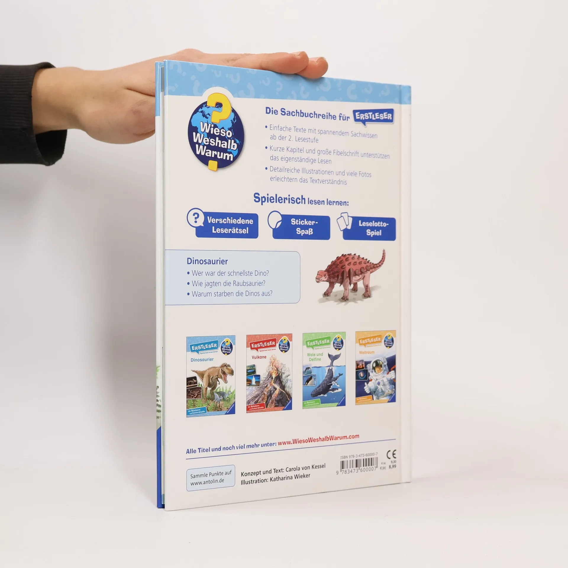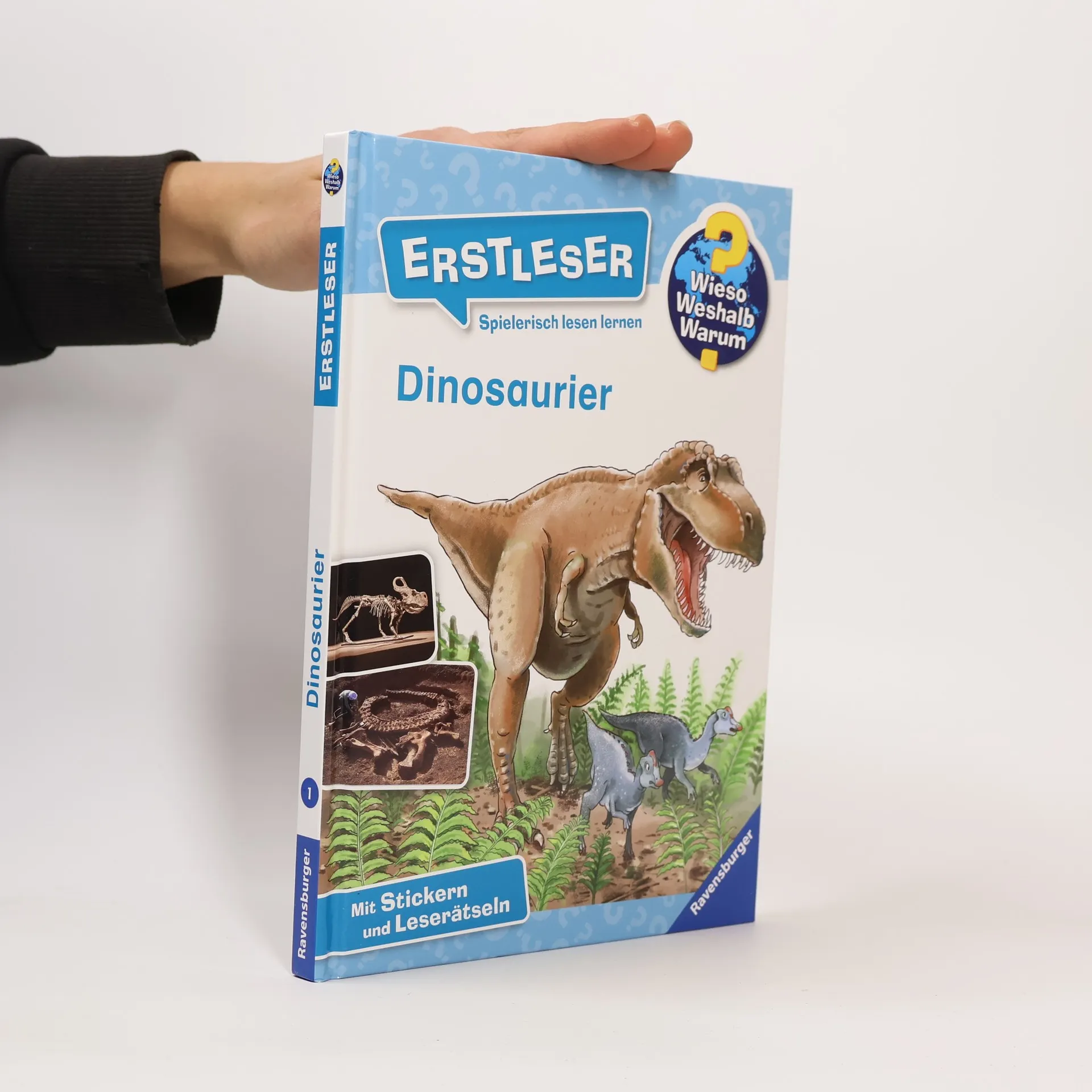 Viele Jahrmillionen waren sie die Herrscher unseres Planeten: die Dinos. Ob T-Rex, Triceratops oder Stegosaurus – hier können Erstleser die Welt der gigantischen Echsen selbständig entdecken. Sie erfahren, wie die Urzeitriesen lebten, warum sie ausstarben und wie man Fossilien erforscht. Leicht verständliche Texte, anschauliche Illustrationen und Fotos helfen beim Lesen lernen. Und für jede Menge Spaß sorgen Sticker, ein Spiel und viele Rätsel. Wieso? Weshalb? Warum? Erstleser Die Sachbuchreihe für Kinder ab der 2. Lesestufe Lesetraining, Sachwissen und Spielspaß in einem! Mit der Reihe Wieso? Weshalb? Warum? Erstleser erschließen sich Kinder ihre Lieblingsthemen selbst. In vier Kapiteln beantworten die Bücher brennende Kinderfragen in kurzen, leicht verständlichen Sätzen. Wie lebt man auf einer Raumstation? Welche Sprache sprechen Wale? Wie gefährlich ist ein Vulkan? Illustrationen und Fotos helfen den Kindern dabei, das Gelesene zu verstehen. Zusätzlich gibt es am Ende jedes Kapitels Buchstaben- und Kreuzworträtsel, Suchbilder, Sudokus und vieles mehr. Ganze acht Seiten mit unterschiedlichsten Rätseln und ein Lesequiz laden zum Knobeln ein. Ein Leselotto-Spiel hilft beim Verständnis schwieriger Wörter. Auf einer Stickerseite zeigen Texte, wo welcher Aufkleber hingehört. Spielerisch lesen lernen wird hier großgeschrieben.