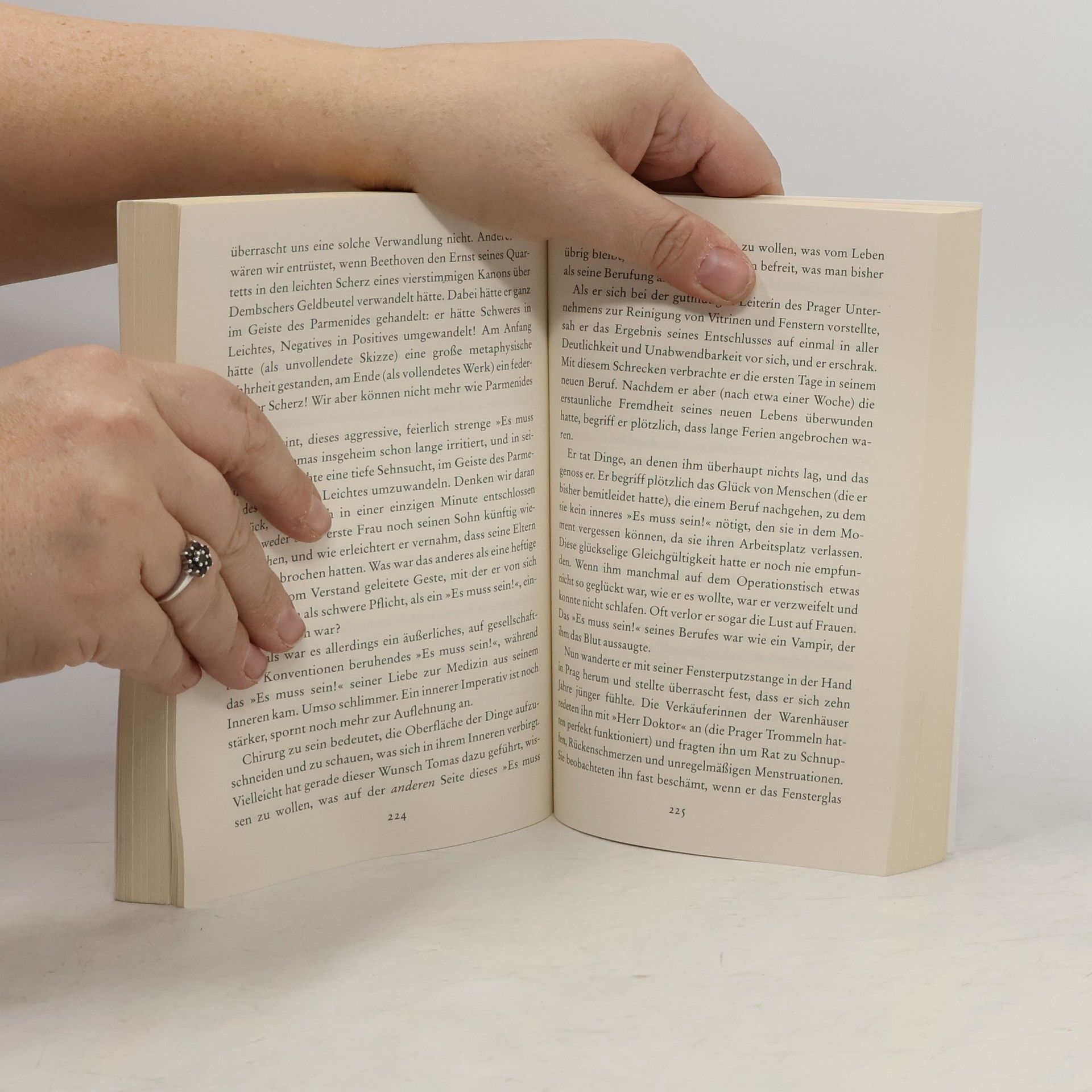 Sie kam ihm vor wie ein Kind, das jemand in ein pechbestrichenes Körbchen gelegt und auf dem Fluß ausgesetzt hatte, damit er es am Ufer seines Bettes barg. Der Prager Chirurg Tomas, der die Frauen begehrt und zugleich fürchtet, ein Erotomane, der seine Scheidung wie eine Hochzeit feierte und fortan der Liebe aus dem Weg ging, bricht für die Kellnerin Teresa mit einigen seiner Grundsätze. Seine erotischen Freundschaften, wie jene mit der Malerin Sabina, führt er aber weiter. Teresa verläßt ihn in Zürich, wo sich die beiden, inzwischen verheiratet, nach dem russischen Einmarsch in Prag, niedergelassen haben. Sie kehrt in ihr Heimatland zurück...
