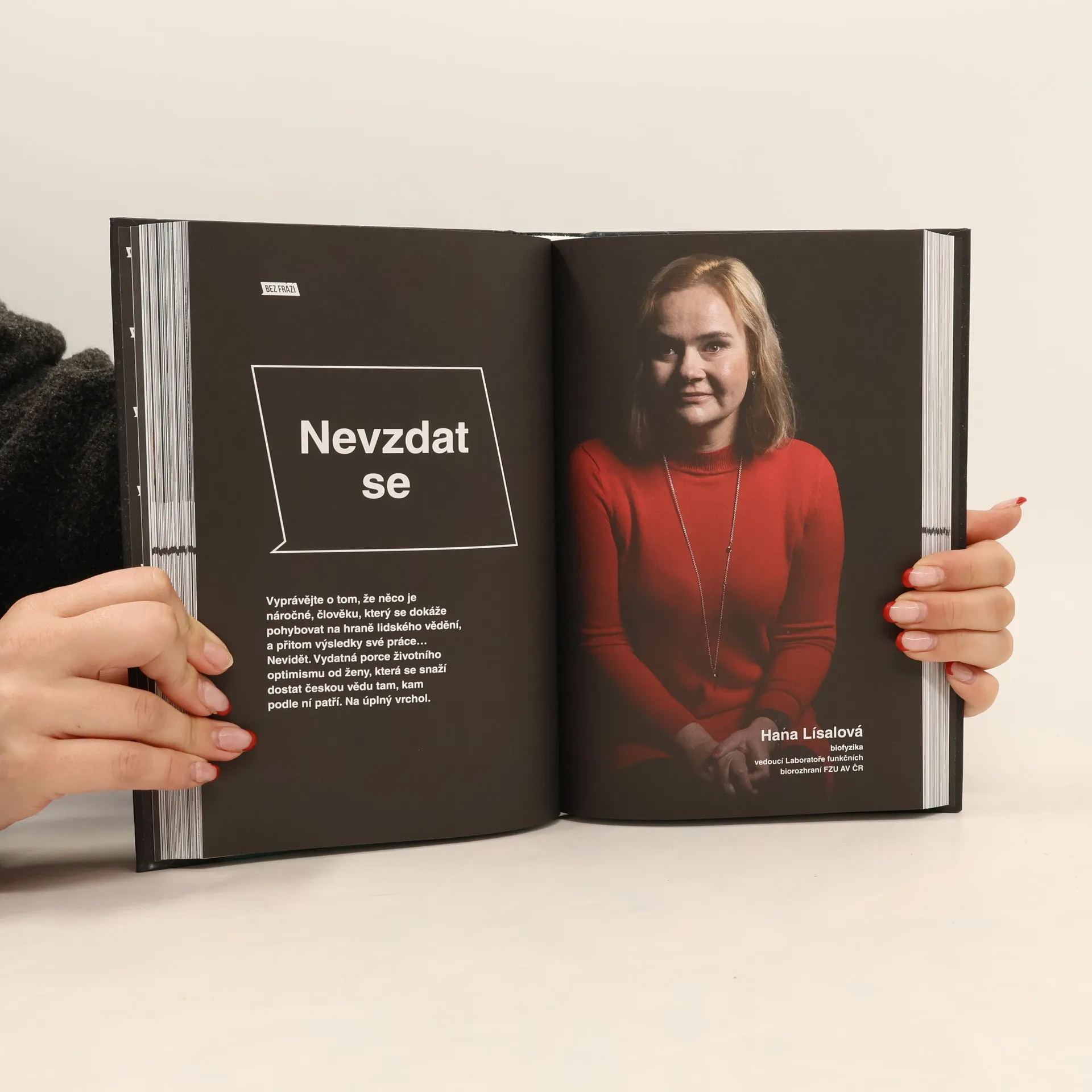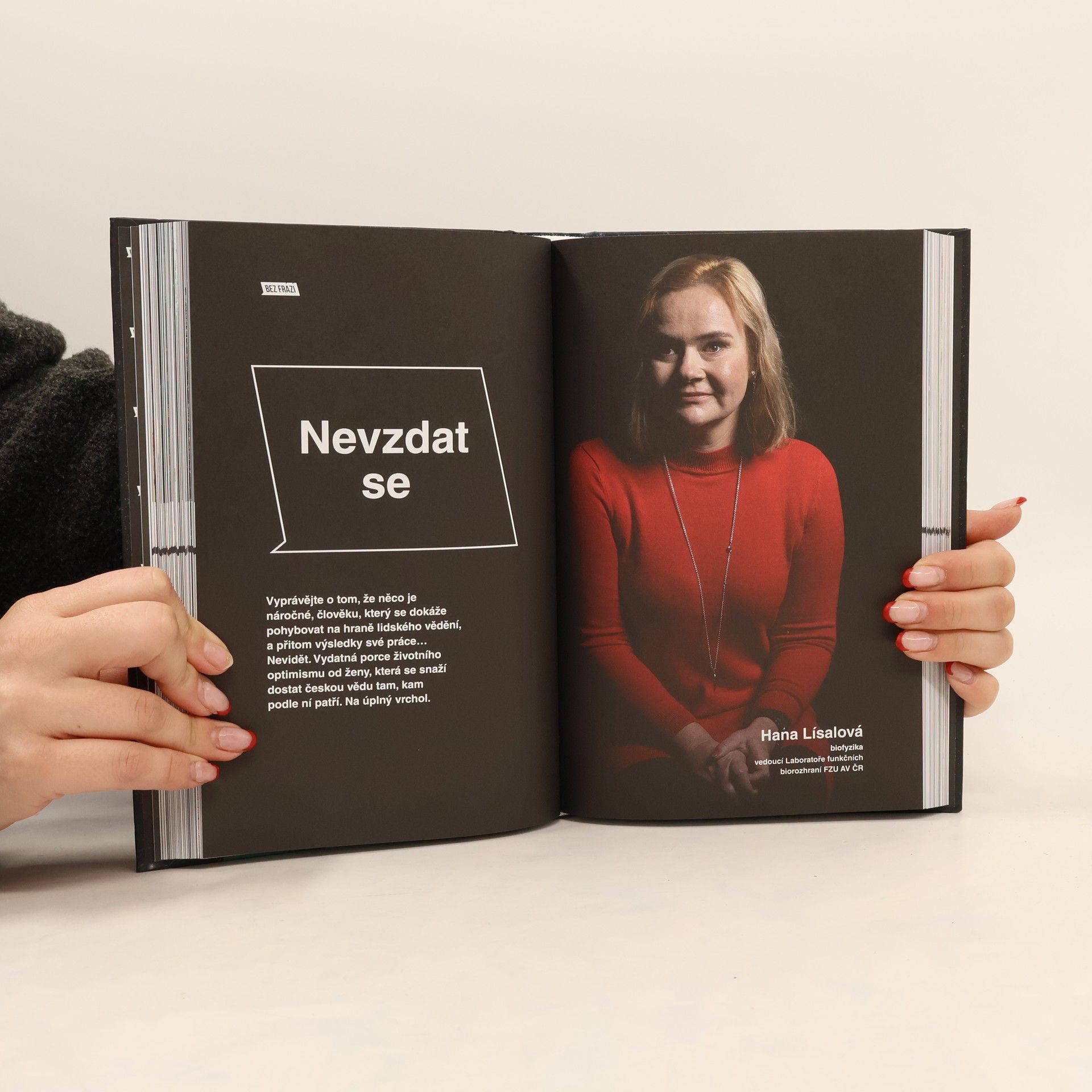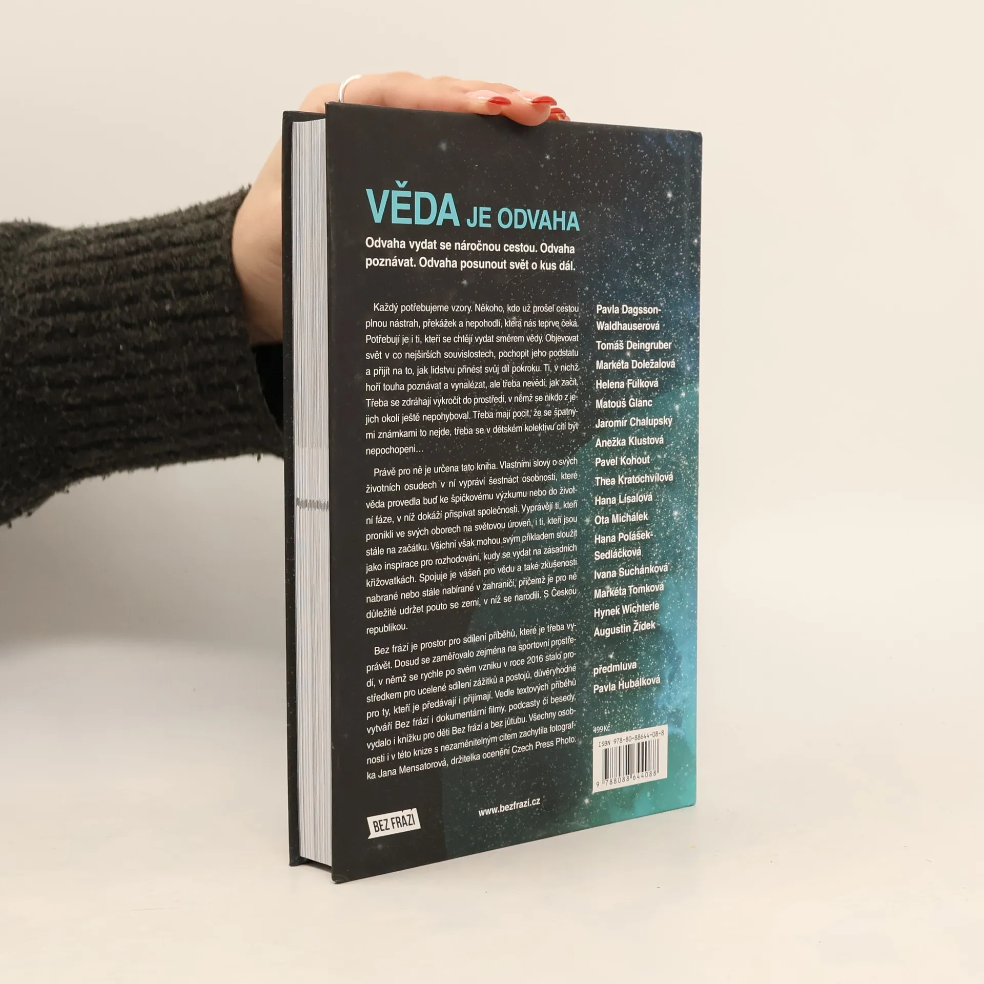 Prostor Bez frází se poprvé rozšířil mimo svět sportu. Rovnou do světa, který se zdá být komplikovaný, stereotypy svázaný. Do světa vědy. I tady jsme ale našli příběhy lidí, kteří mají sílu inspirovat svou vlastní zkušeností. A také předat odvahu pustit se do velkých dobrodružství, podpořit víru v sebe sama i v to, že každý neúspěšný pokus nakonec vede k tomu správnému řešení. Budete chtít stavět rakety, ponořit se do AI, zkoumat sopky na Islandu. Zjistíte, že k tomu nejsou potřeba ty nejlepší známky. Naopak i tady je nezbytná vášeň, zápal pro vlastní věc. A také lidé, kteří vás podpoří a vy je budete chtít následovat. Tady je šestnáct takových. V knize najdete příběhy těchto osobností: Pavla Dagsson-Waldhauserová Tomáš Deingruber Markéta Doležalová Helena Fulková Matouš Glanc Jaromír Chalupský Anežka Klustová Pavel Kohout Thea Kratochvílová Hana Lísalová Ota Michálek Hana Polášek-Sedláčková Ivana Suchánková Markéta Tomková Hynek Wichterle Augustin Žídek
