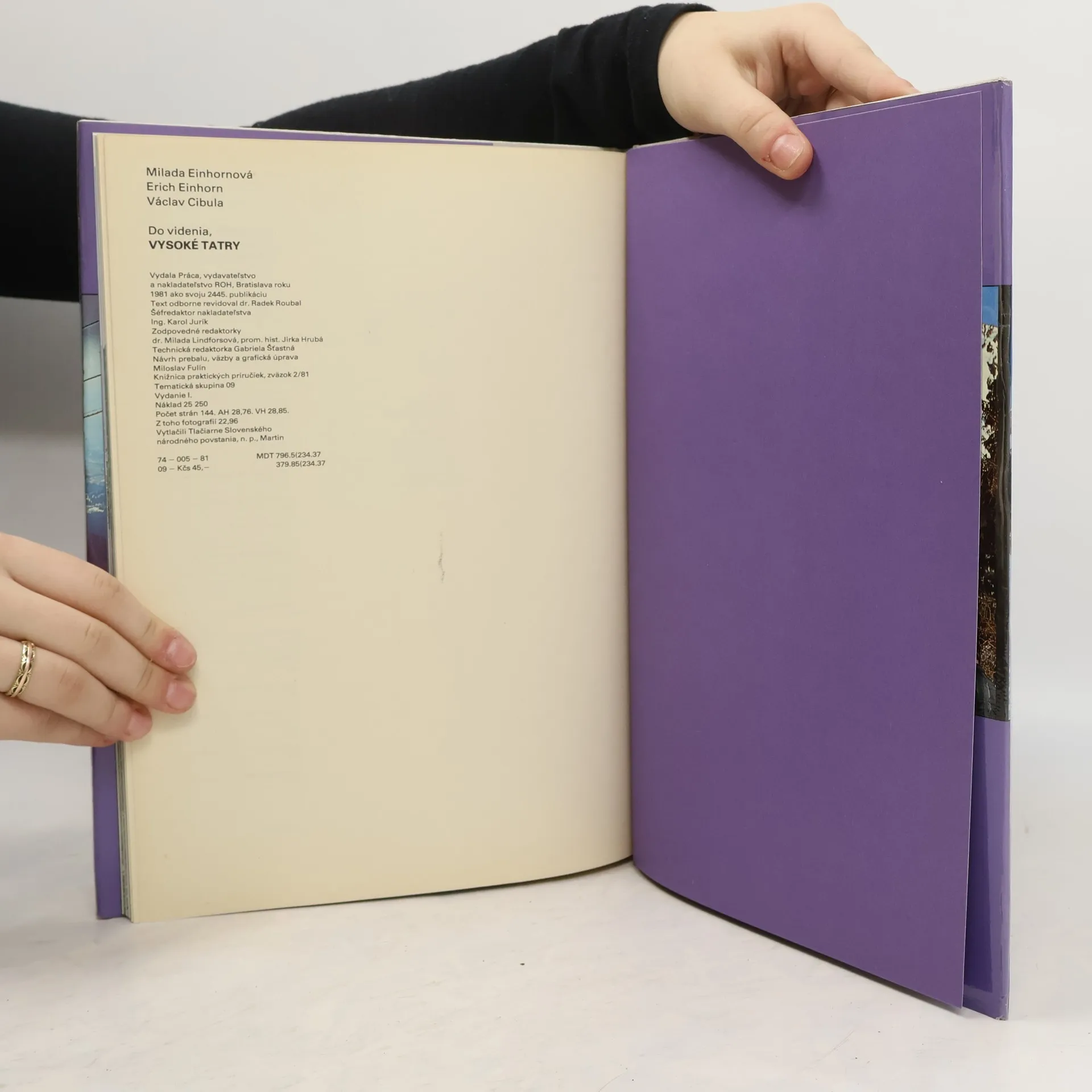 Václav Cibula, autor textovej časti tejto knihy, sa priznal: keď prišiel do Tatier po prvý raz, videl predovšetkým skaly, štíty, strmé steny, prekrásne vysokohorské jazierka, teda to, čo očarí turistu a každého, kto prichádza do našich najvyšších hôr hoci len na krátky pobyt. Dnes vidí v týchto veľhorách čosi viac. Nikdy nezatvára oči pred krásou hôr, ale dnes hľadá predovšetkým ľudí, ktorí v týchto horách žijú; pátra aj po tom, akí boli, ako žili a čo po sebe zanechali ich predchodcovia. Tak sa povodí asi každému, kto znovu a znovu prichádza na miesta už známe, dôverne blízke, z roka na rok milšie. Tak sa povodilo aj Milade Einhornovej a Erichovi Einhornovi, keď s fotoaparátmi chodili po Tatrách a čítali ich pradávnu históriu nielen z obrovitých skalných velikánov, z horských lúk a fantastických vodopádov, ale aj z vráskavých tvárí starých ľudí i z bezstarostných, veselých úsmevov dnešnej mládeže. Takto vznikla kniha, ktorá nie je len súborom fotografií so sprievodným textom, ale predovšetkým sa pokúša zachytiť slovom aj obrazom, aký je duch tohto prekrásneho kúta našej vlasti a tamojšieho ľudu. Kniha, ku ktorej sa budú radi vracať všetci, čo mali šťastie stráviť kus alebo hoci len kúsoček svojho života vo Vysokých Tatrách.