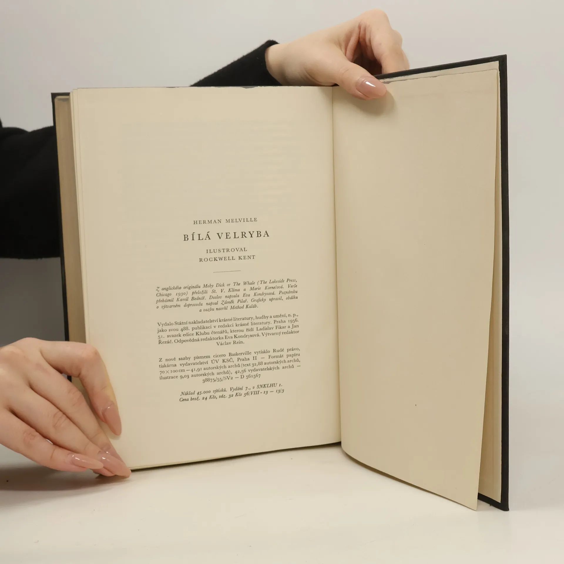 Román amerického spisovatele (1819-1891), známý i z filmového přepisu. Mohutný epos o vášnivém až fatálním pronásledování ojedinělé velryby kapitánem velícím velrybářské výpravě. Příběh, který ve filosofickém podtextu symbolizuje neklid věčně hledajícího člověka, který útočí na to, co je v přírodě nepřemožitelné a člověku nepřístupné. Dílo provázejí jako jeho nedílná součást ilustrace R. Kenta, významného amerického umělce a veřejného pracovníka, ilustrace, které se ve spojení s tímto dílem staly klasickými. Verše přebásnil Kamil Bednář; doslov Zdeněk Vančura, text o ilustrátorovi Zd. Pilař.