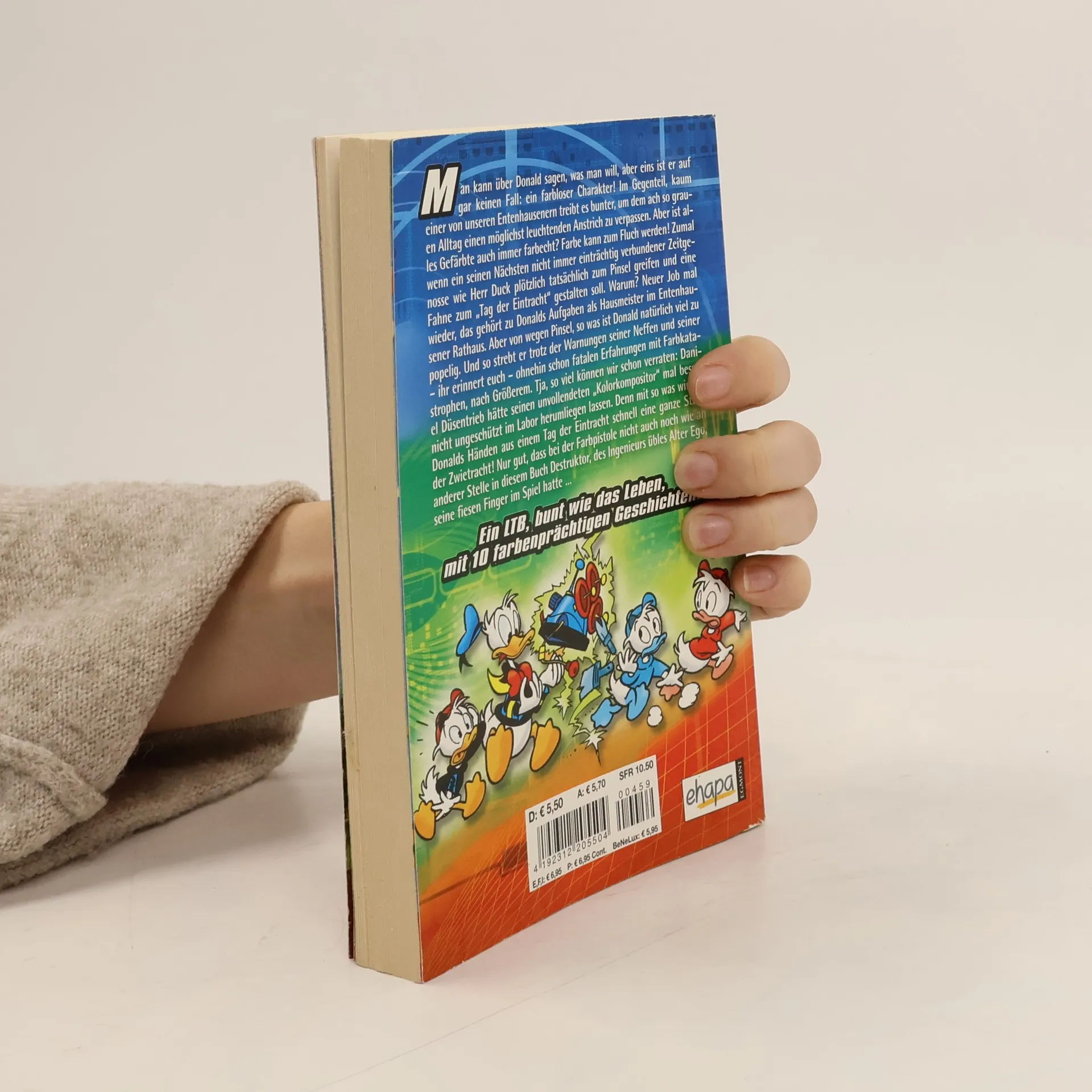 Man kann über Donald sagen, was man will, aber eins ist er auf gar keinen Fall: ein farbloser Charakter! Im Gegenteil, kaum einer von unseren Entenhausenern treibt es bunter, um dem ach so grauen Alltag einen möglichst leuchtenden Anstrich zu verpassen. Aber ist alles Gefärbte auch immer farbecht? Farbe kann zum Fluch werden! Zumal wenn ein seinen Nächsten nicht immer einträchtig verbundener Zeitgenosse wie Herr Duck plötzlich tatsächlich zum Pinsel greifen und eine Fahne zum „Tag der Eintracht“ gestalten soll. Warum? Neuer Job mal wieder, das gehört zu Donalds Aufgaben als Hausmeister im Entenhausener Rathaus. Aber von wegen Pinsel, so was ist Donald natürlich viel zu popelig. Und so strebt er trotz der Warnungen seiner Neffen und seiner – ihr erinnert euch – ohnehin schon fatalen Erfahrungen mit Farbkatastrophen, nach Größerem. Tja, so viel können wir schon verraten: Daniel Düsentrieb hätte seinen unvollendeten „Kolorkompositor“ mal besser nicht ungeschützt im Labor herumliegen lassen. Denn mit so was wird in Donalds Händen aus einem Tag der Eintracht schnell eine ganze Stadt der Zwietracht! Nur gut, dass bei der Farbpistole nicht auch noch wie an anderer Stelle in diesem Buch Destruktor, des Ingenieurs übles Alter Ego, seine fiesen Finger im Spiel hatte …Ein LTB, bunt wie das Leben, mit 10 farbenprächtigen Geschichten!