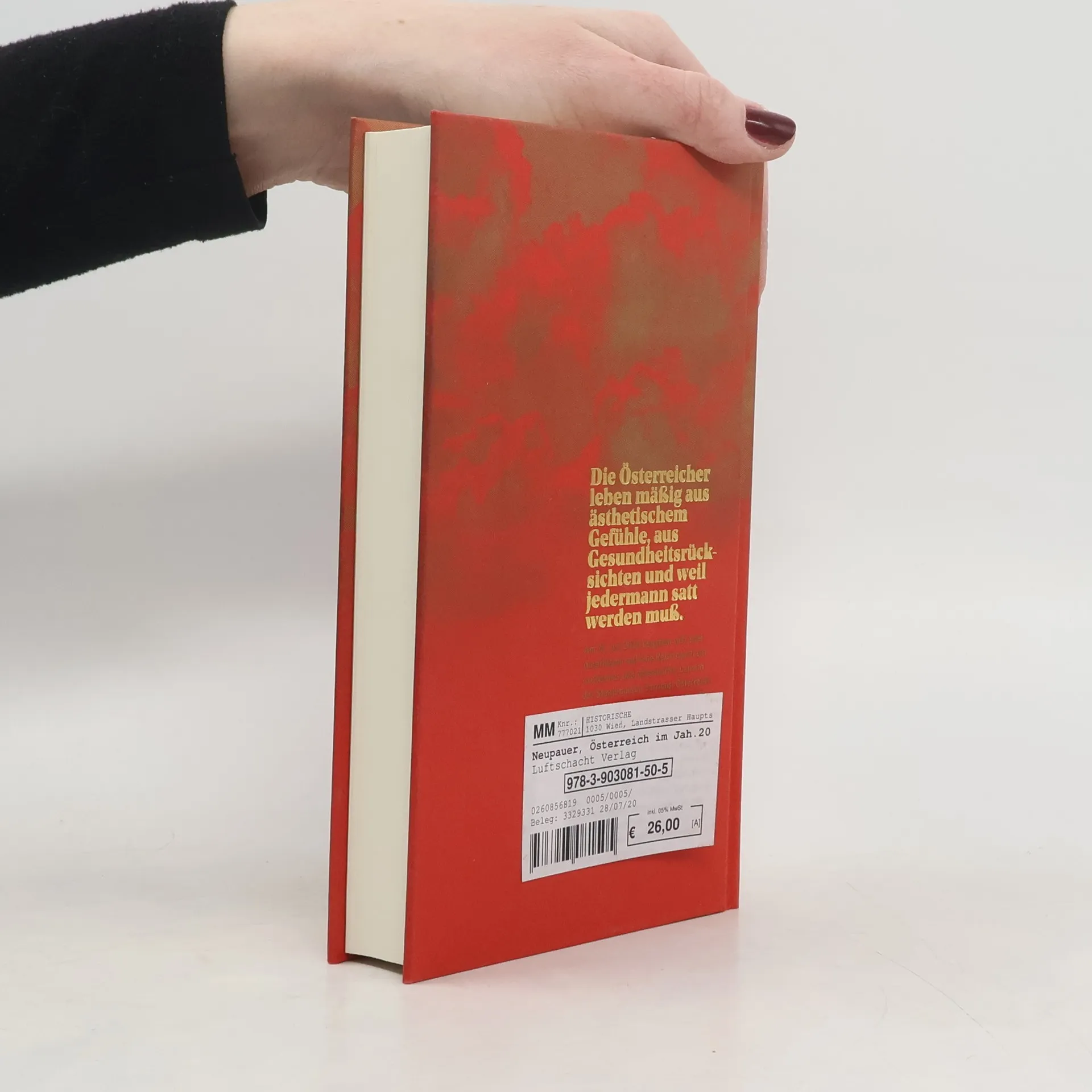 Am 13. Juli 2020 begeben sich zwei Amerikaner auf eine Reise durch ein exotisches und rätselhaftes Land in der Staatenunion Europas: Österreich. Das Land hat keine Armee und in Wien stehen nur noch drei Kirchen. Es gibt kein Geld und keinen Privatbesitz mehr, es herrscht Wohlstand. Die Gütergemeinschaft ist friedlich und sanft. Kaiser und Adel sind glitzernde Statisten einer klassenlosen Gesellschaft. In Österreich herrscht utopischer Kommunismus mit Monarchie. Die beiden Amerikaner kommen aus dem Staunen nicht heraus. Die Reisenden, ihre wechselnden Reiseleiter und Urlaubsbekanntschaften machen Ausflüge in der Umgebung Wiens, durchstreifen Stadt und Natur, besuchen Feste, Kultur- und Sportereignisse, und lassen sich Schritt für Schritt Österreich erklären. Wir erhalten Einblicke in eine datumsgenau jetzige und völlig fremde Welt. Die Rolle der Frau, die Aufgabe des Künstlers, das Leben und der Wert der Menschen überhaupt – das Panorama, das sich entfaltet, ist so skurril, umständlich und schrullig, wie sonst nur die Wirklichkeit selbst. Und eine plüschig-schmalzige Liebesgeschichte fehlt in diesem Buch natürlich auch nicht. Josef von Neupauers Roman „Österreich im Jahre 2020“ erschien 1893 im Verlag E. Pierson, Dresden und Leipzig. Eine bizarre Entdeckung, die an der Zeit ist.
