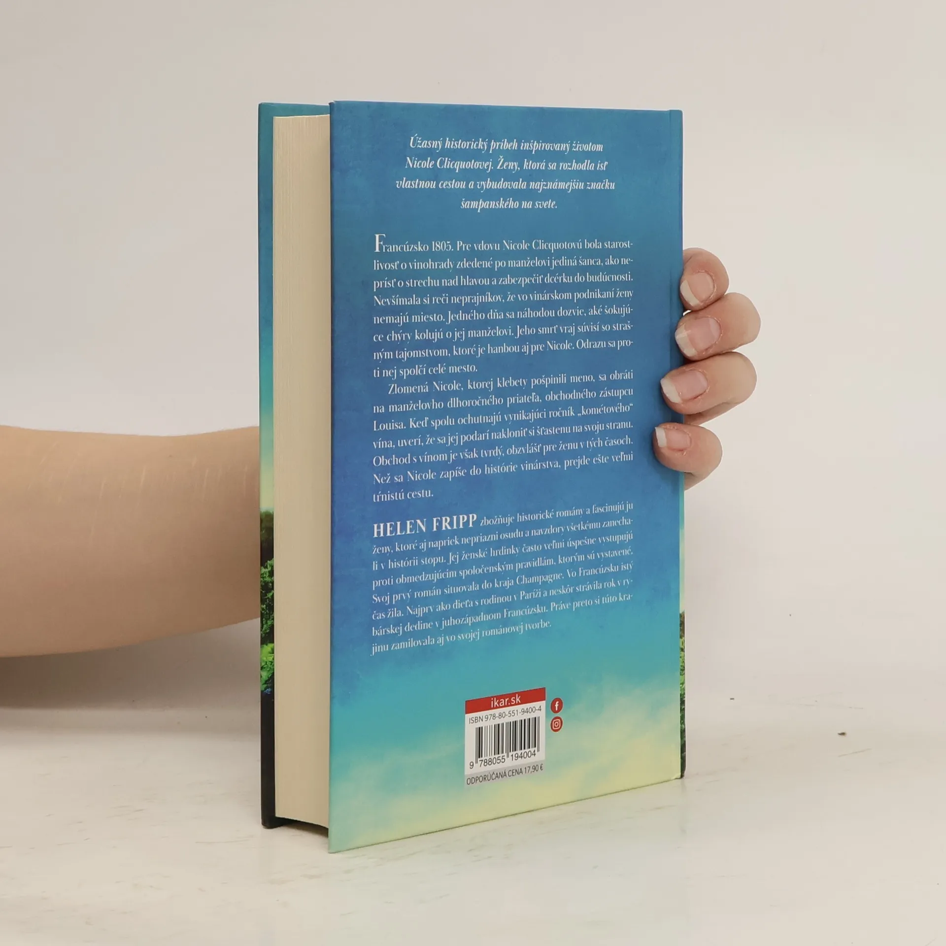 Úžasný historický príbeh inšpirovaný životom Nicole Clicquotovej. Ženy, ktorá sa rozhodla ísť vlastnou cestou a vybudovala najznámejšiu značku šampanského vo svete. Francúzsko, 1805. Pre vdovu Nicole Clicquotovú bola starostlivosť o vinohrady zdedené po manželovi jediná šanca ako neprísť o strechu nad hlavou a zabezpečiť dcérku do budúcnosti. Nevšímala si reči neprajníkov, že vo vinárskom podnikaní ženy nemajú miesto. Jedného dňa sa nechtiac dozvie, aké šokujúce klebety kolujú o jej manželovi. Vraj jeho smrť je spojená so strašným tajomstvom, ktoré je hanbou aj pre Nicole. Odrazu sa proti nej spojí celé mesto. Zlomená Nicole, ktorej klebety pošpinili meno, sa obráti na dlhoročného priateľa svojho manžela, obchodného zástupcu Louisa. Zdá sa, že jeho milý úsmev a láskavé rady jej pomôžu vyrovnať sa s problémami. Keď spolu ochutnajú vynikajúci ročník jej „kométového“ vína, uverí, že sa jej podarí nakloniť si šťastenu na svoju stranu. Obchod s vínom je však tvrdý, obzvlášť pre ženu v tých časoch. Než sa Nicole zapíše do histórie vinárstva, prejde ešte veľmi tŕnistú cestu.