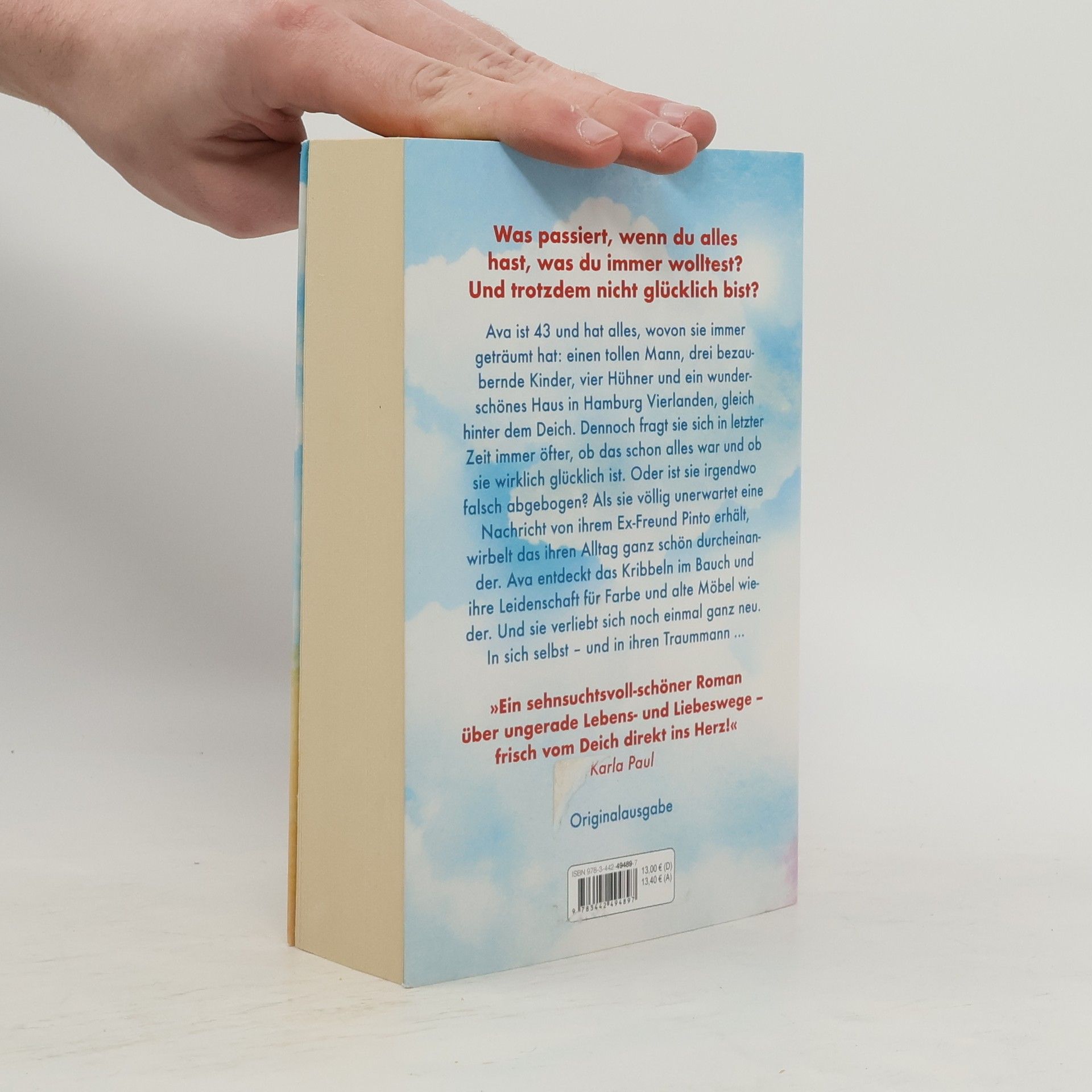 Was passiert, wenn du alles hast, was du immer wolltest? Und trotzdem nicht glücklich bist? Ava ist 43 und hat alles, wovon sie immer geträumt hat: einen tollen Mann, drei bezaubernde Kinder, drei Hühner und ein wunderschönes Haus in Hamburg Vierlanden, gleich hinter dem Deich. Dennoch fragt sie sich in letzter Zeit immer öfter, ob das schon alles war und ob sie wirklich glücklich ist. Oder ist sie irgendwo falsch abgebogen? Als sie völlig unerwartet eine Nachricht von ihrem Ex-Freund Pinto erhält, wirbelt das ihren Alltag ganz schön durcheinander. Ava entdeckt das Kribbeln im Bauch und ihre Leidenschaft für Farbe und alte Möbel wieder. Und verliebt sich noch einmal ganz neu. In sich selbst – und in ihren Traummann ... Das humorvoll-turbulente Romandebüt der SPIEGEL-Bestsellerautorin und erfolgreichen Bloggerin und Instagrammerin (»wasfuermich«). »Ein sehnsuchtsvoll-schöner Roman über ungerade Lebens- und Liebeswege – frisch vom Deich direkt ins Herz!« Karla Paul »Die Gefühlsachterbahn einer Frau, die vermeintlich alles im Leben hat und trotzdem mehr will – ich habe so mit Ava mitgefiebert!« Alexa von Heyden