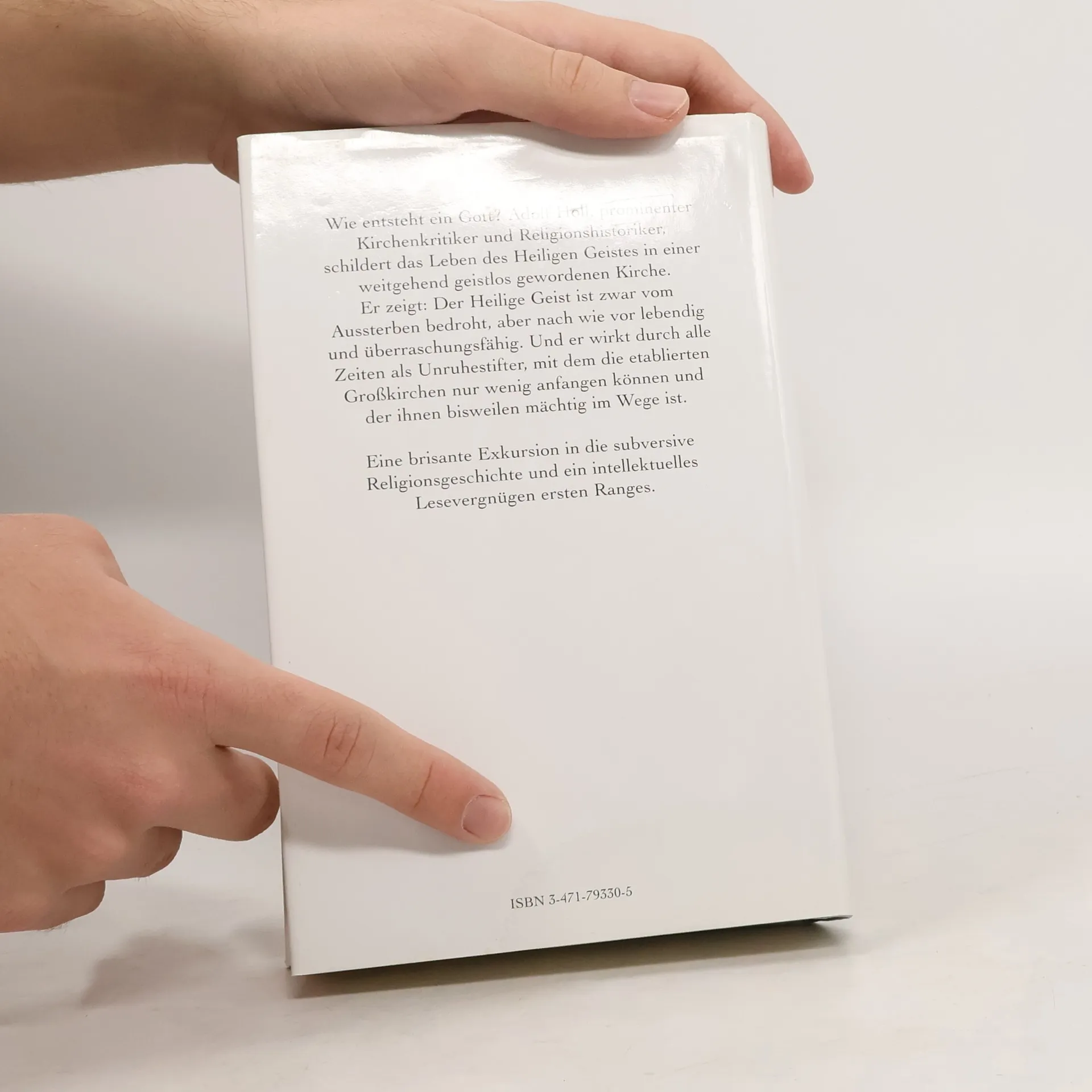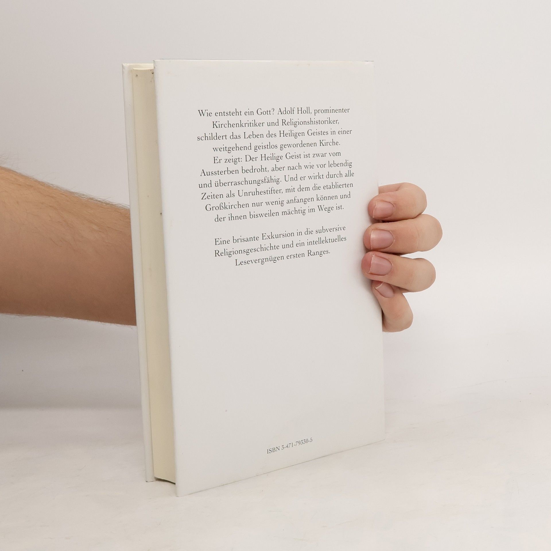 Der Kirchenkritiker und Religionshistoriker Adolf Holl befaßt sich mit dem Begriff des "Heiligen Geistes", mit seiner Entstehung und auch damit, wie die Kirche in heutiger Zeit damit umgeht. Er unternimmt einen Exkurs durch die Religionsgeschichte und kommt zu dem Schluß: "Der Heilige Geist wirkt durch alle Zeiten als Unruhestifter, mit dem die offiziellen und etablierten Großkirchen nur wenig anfangen können und der ihnen bisweilen mächtig im Weg ist. Deshalb muß auch dieses Buch als heftiges Plädoyer für das Nicht-Angepaßte einer dissidenten Glaubenshaltung gelesen werden."