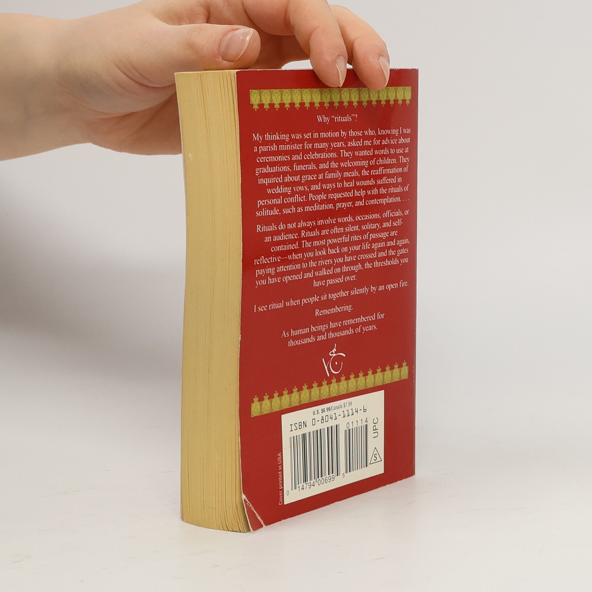 FROM BEGINNING TO END Why "rituals"? My thinking was set in motion by those who, knowing I was a parish minister for many years, have asked me for advice about ceremonies and celebrations. They wanted words to use at graduations, funerals, and the welcoming of children. They inquired about grace at family meals, the reaffirmation of wedding vows, and ways to heal wounds suffered in personal conflict. People requested help with the rituals of solitude, such as meditation, prayer, and contemplation. . . . Rituals do not always involve words, occasions, officials, or an audience. Rituals are often silent, solitary, and self-contained. The most powerful rites of passage are reflective--when you look back on your life again and again, paying attention to the rivers you have crossed and the gates you have opened and walked on through, the thresholds you have passed over. I see ritual when people sit together silently by an open fire. Remembering. As human beings have remembered for thousands and thousands of years. FULGHUM