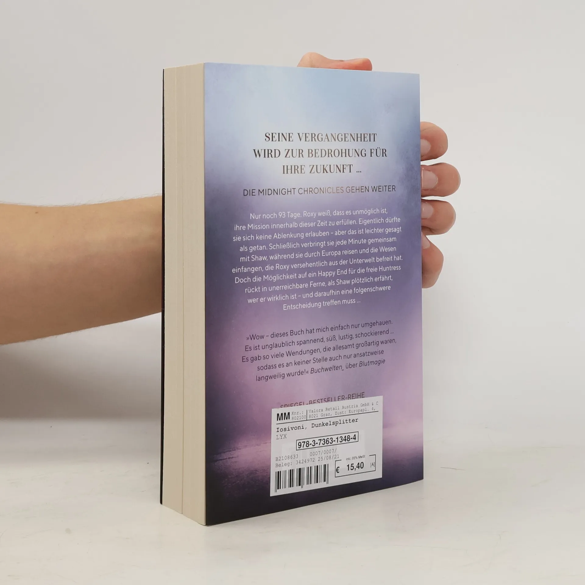 Seine Vergangenheit wird zur Bedrohung für ihre Zukunft ... Nur noch 93 Tage. Roxy weiß, dass es unmöglich ist, ihre Mission innerhalb dieser Zeit zu erfüllen. Eigentlich dürfte sie sich keine Ablenkung erlauben - aber das ist leichter gesagt als getan. Schließlich verbringt sie jede Minute gemeinsam mit Shaw, während sie durch Europa reisen und die Wesen einfangen, die Roxy versehentlich aus der Unterwelt befreit hat. Doch die Möglichkeit auf ein Happy End für die freie Huntress rückt in unerreichbare Ferne, als Shaw plötzlich erfährt, wer er wirklich ist - und daraufhin eine folgenschwere Entscheidung treffen muss ... „Wow - dieses Buch hat mich einfach nur umgehauen. Es ist unglaublich spannend, süß, lustig, schockierend ... Es gab so viele Wendungen, die allesamt großartig waren, sodass es an keiner Stelle auch nur ansatzweise langweilig wurde!“ BUCHWELTEN_ über BLUTMAGIE Band 3 der Reihe trägt den Titel DUNKELSPLITTER und erzählt die Geschichte von Roxy und Shaw weiter.
