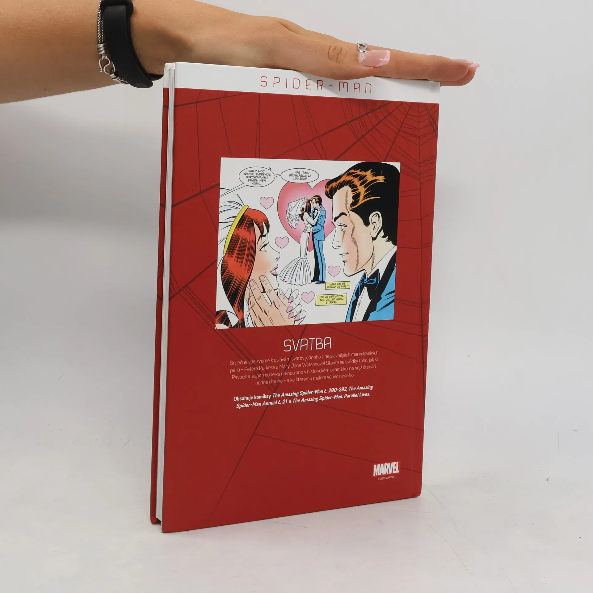 Srdečně vás zveme k oslavám svatby jednoho z nejslavnějších marvelovských párů - Petera Parkera a Mary Jane Watsonové. Staňte se svědky toho, jak si Pavouk a supermodelka řeknou ano v historickém okamžiku, na nějž čtenáři hodně dlouho čekali - a ke kterému málem vůbec nedošlo. Obsahuje komiksy The Amazing Spider-Man č. 290-292, The Amazing Spider-Man Annual č. 21 a The Amazing Spider-Man: Parallel Lives.