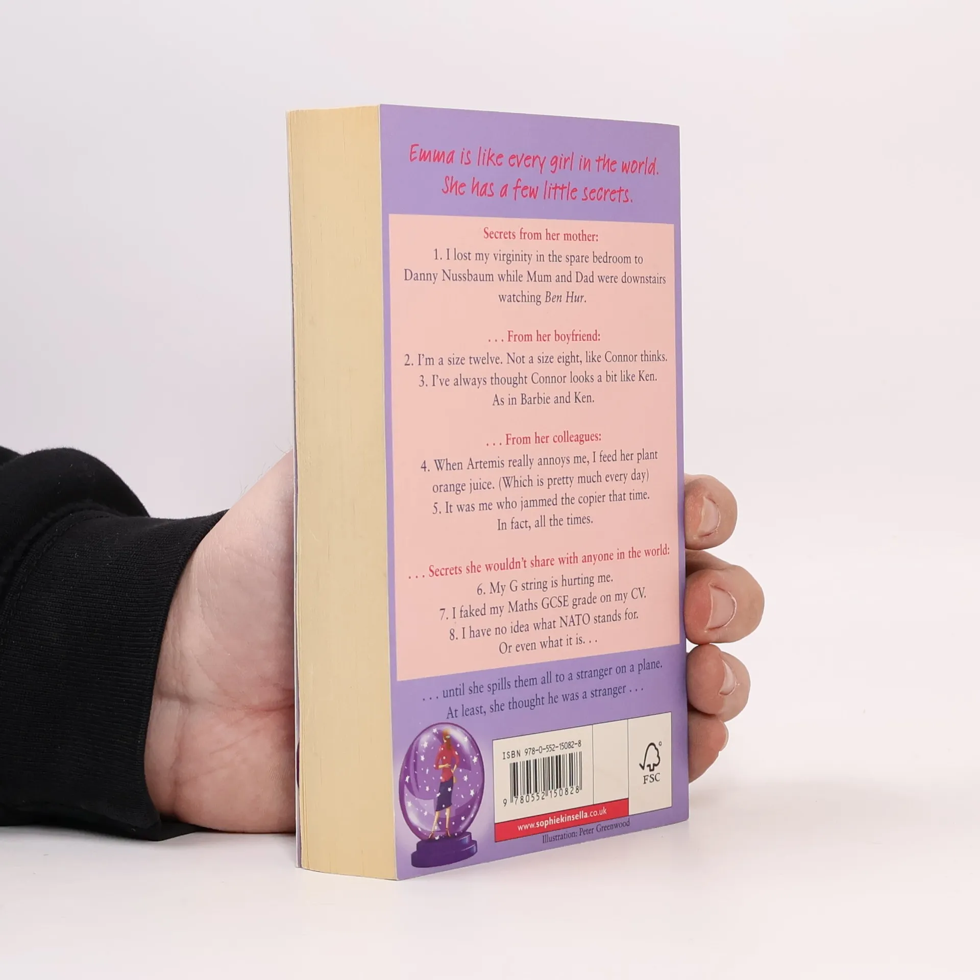 Emma is like every girl in the world. She has a few little secrets. I lost my virginity in the spare bedroom to Danny Nussbaum while Mum and Dad were downstairs watching Ben Hur. I'm a size twelve. Not a size eight, like Connor thinks. I've always thought Connor looks a bit like Ken. As in Barbie and Ken. When Artemis really annoys me, I feed her plant orange juice. (Which is pretty much every day). It was me who jammed the copier that time. In fart, all the times. My G string is hurting me. I faked my Maths GCSE grade on my CV. I have no idea what NATO stands for. Or even what it is... ... until she spills them all to a stranger on a plane. At least, she thought he was a stranger...