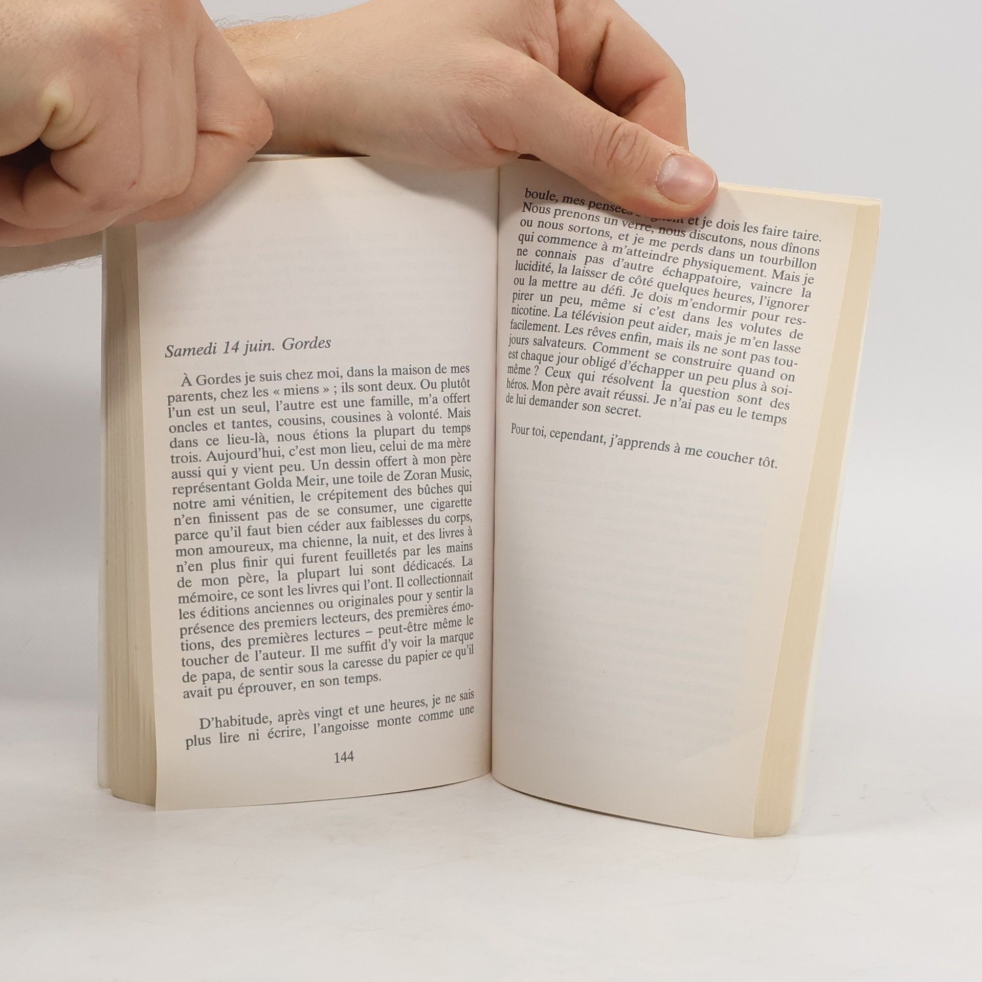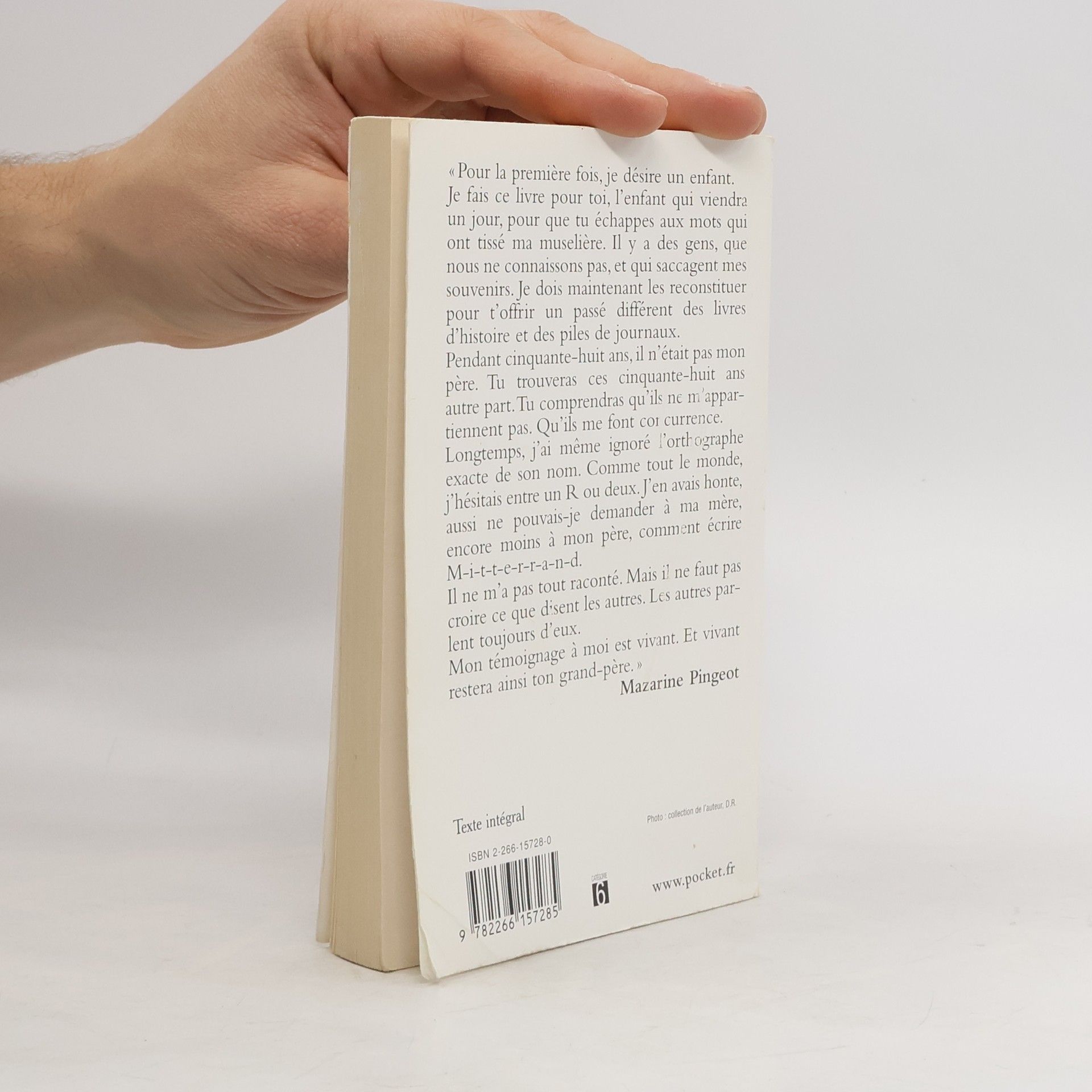 " Pour la première fois, je désire un enfant. Je fais ce livre pour toi, l'enfant qui viendra un jour, pour que tu échappes aux mots qui ont tissé ma muselière. Il y a des gens, que nous ne connaissons pas, et qui saccagent mes souvenirs. Je dois maintenant les reconstituer pour t'offrir un passé différent des livres d'histoire et des piles de journaux. Pendant cinquante-huit ans, il n'était pas mon père. Tu trouveras ces cinquante-huit ans autre part. Tu comprendras qu'ils ne m'appartiennent pas. Qu'ils me font concurrence. Longtemps, j'ai même ignoré l'orthographe exacte de son nom. Comme tout le monde, j'hésitais entre un R ou deux. J'en avais honte, aussi ne pouvais-je demander à ma mère, encore moins à mon père, comment écrire M-i-t-t-e-r-r-a-n-d. Il ne m'a pas tout raconté. Mais il ne faut pas croire ce que disent les autres. Les autres parlent toujours d'eux. Mon témoignage à moi est vivant. Et vivant restera ainsi ton grand-père. "