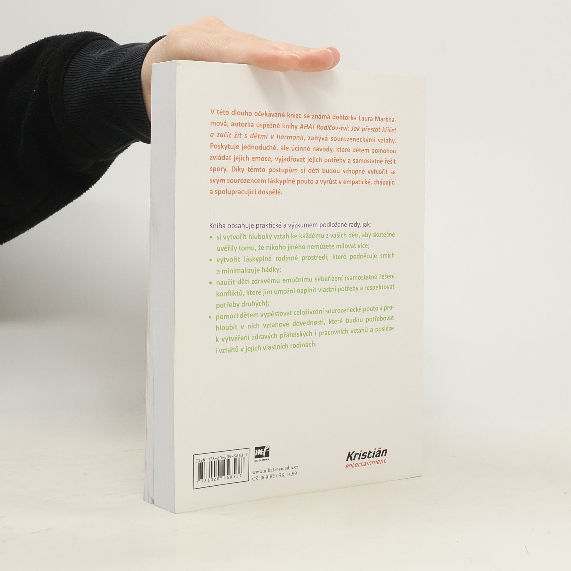 Jak zabránit sporům mezi sourozenci a vychovat z nich přátele na celý život. V této dlouho očekávané knize se známá doktorka Laura Markhamová, autorka úspěšné knihy AHA! Rodičovství: Jak přestat křičet a začít s dětmi žít v harmonii, zabývá sourozeneckými vztahy. Poskytuje jednoduché, ale účinné návody, které dětem pomohou zvládat jejich emoce, vyjadřovat jejich potřeby a samostatně řešit spory. Díky těmto postupům si děti budou schopné vytvořit se svým sourozencem láskyplné pouto a vyrůst v empatické, chápající a spolupracující dospělé. Kniha obsahuje praktické a výzkumem podložené rady, jak: - si vytvořit hluboký vztah ke každému z vašich dětí, aby skutečně uvěřily tomu, že nikoho jiného nemůžete milovat více; - vytvořit láskyplné rodinné prostředí, které podněcuje smích a minimalizuje hádky; - naučit děti zdravému emočnímu sebeřízení (samostatné řešení konfliktů, které jim umožní naplnit vlastní potřeby a respektovat potřeby druhých); - pomoci dětem vypěstovat celoživotní sourozenecké pouto a prohloubit v nich vztahové dovednosti, které budou potřebovat k vytváření zdravých přátelských i pracovních vztahů a posléze i vztahů v jejich vlastních rodinách.