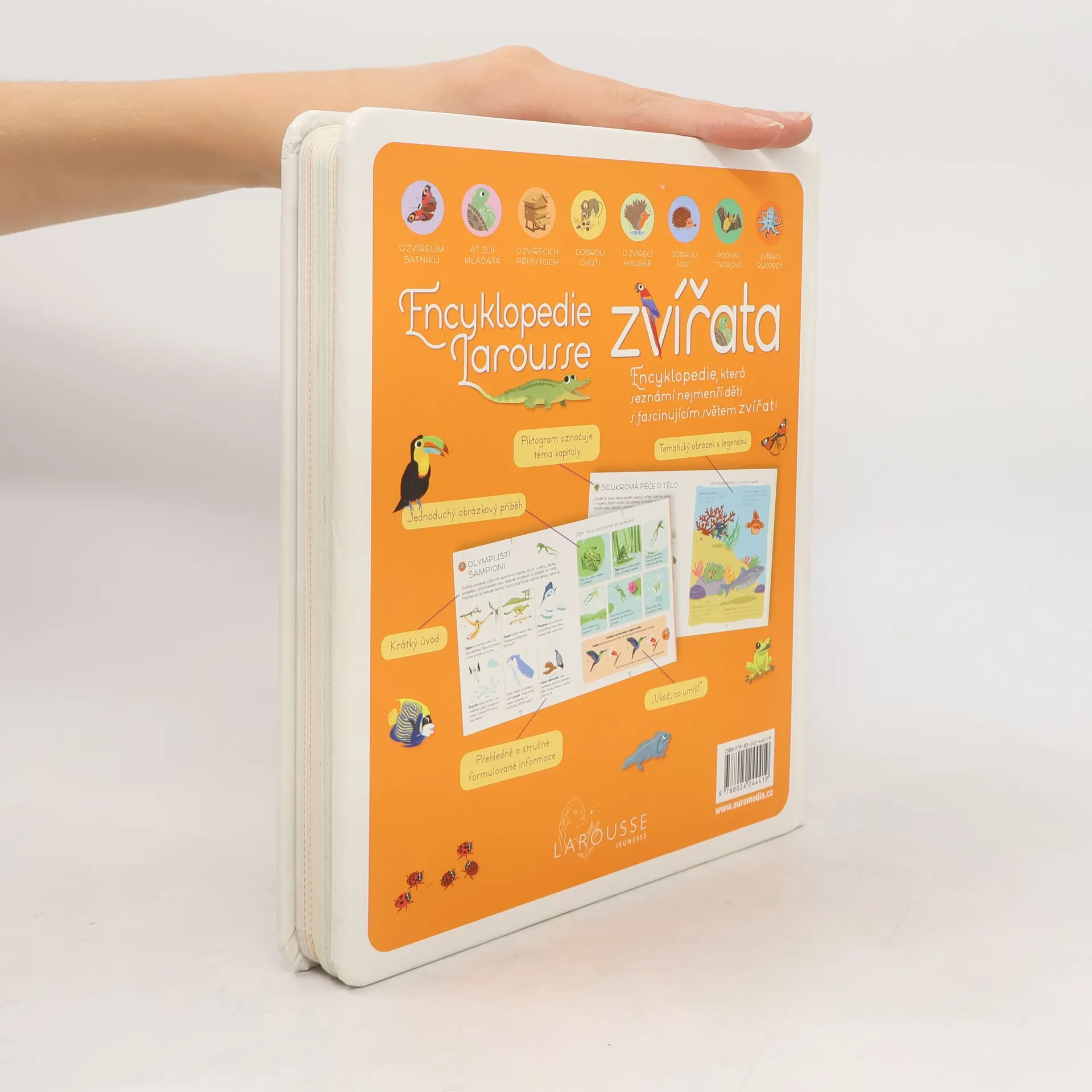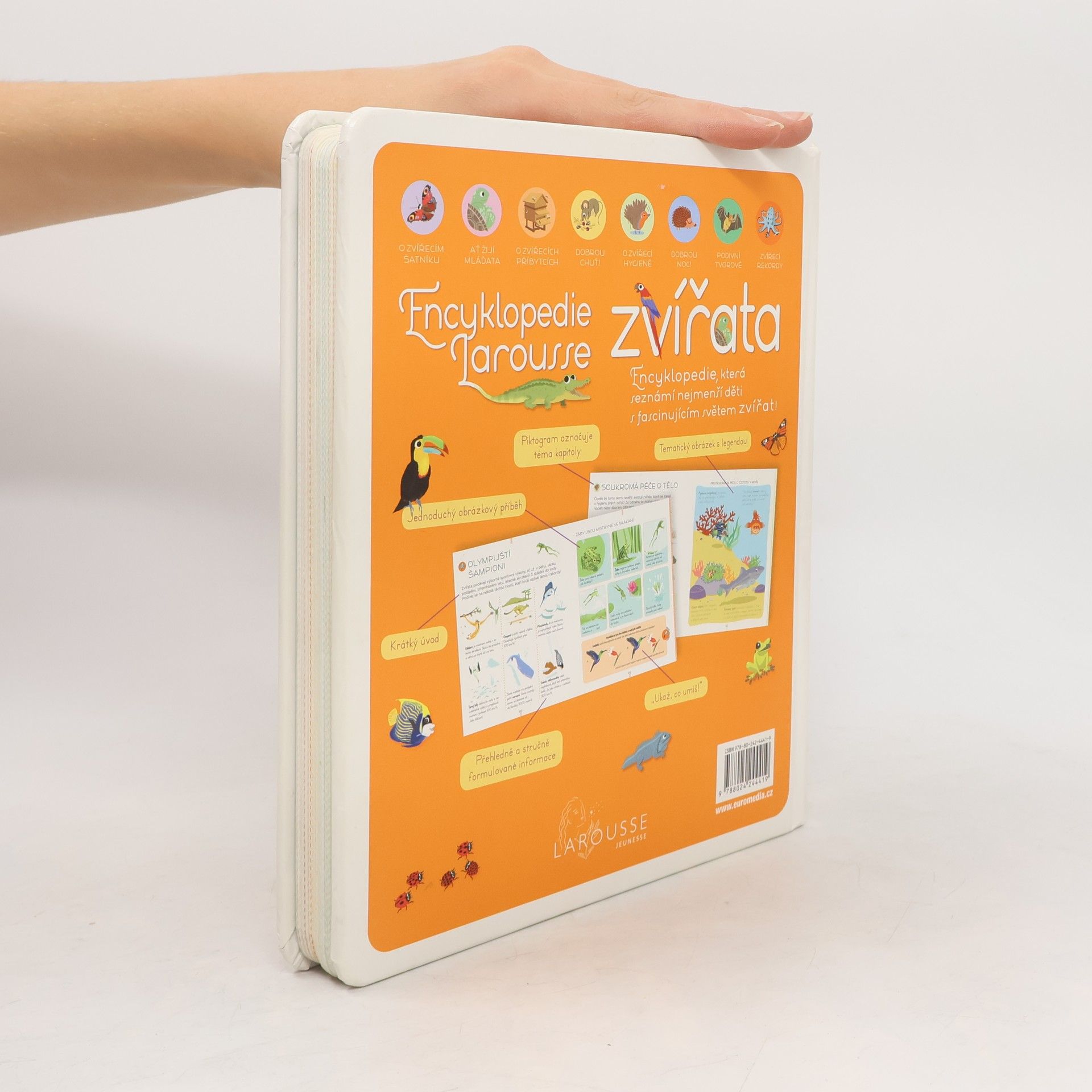 Encyklopedie pro nejmenší hravou a zábavnou formou seznamuje ty nejmenší s rozmanitostí světa zvířat. Tematicky rozčleněné kapitoly zahrnují vzhled rozmanitých živočichů, jejich zvyky, stravu, výchovu mláďat, výskyt i způsob života. Bohaté ilustrace a jednoduché obrázkové příběhy usnadňují dětem pochopení a knihu zpestřují mimo jiné zábavné úkoly a zajímavosti.