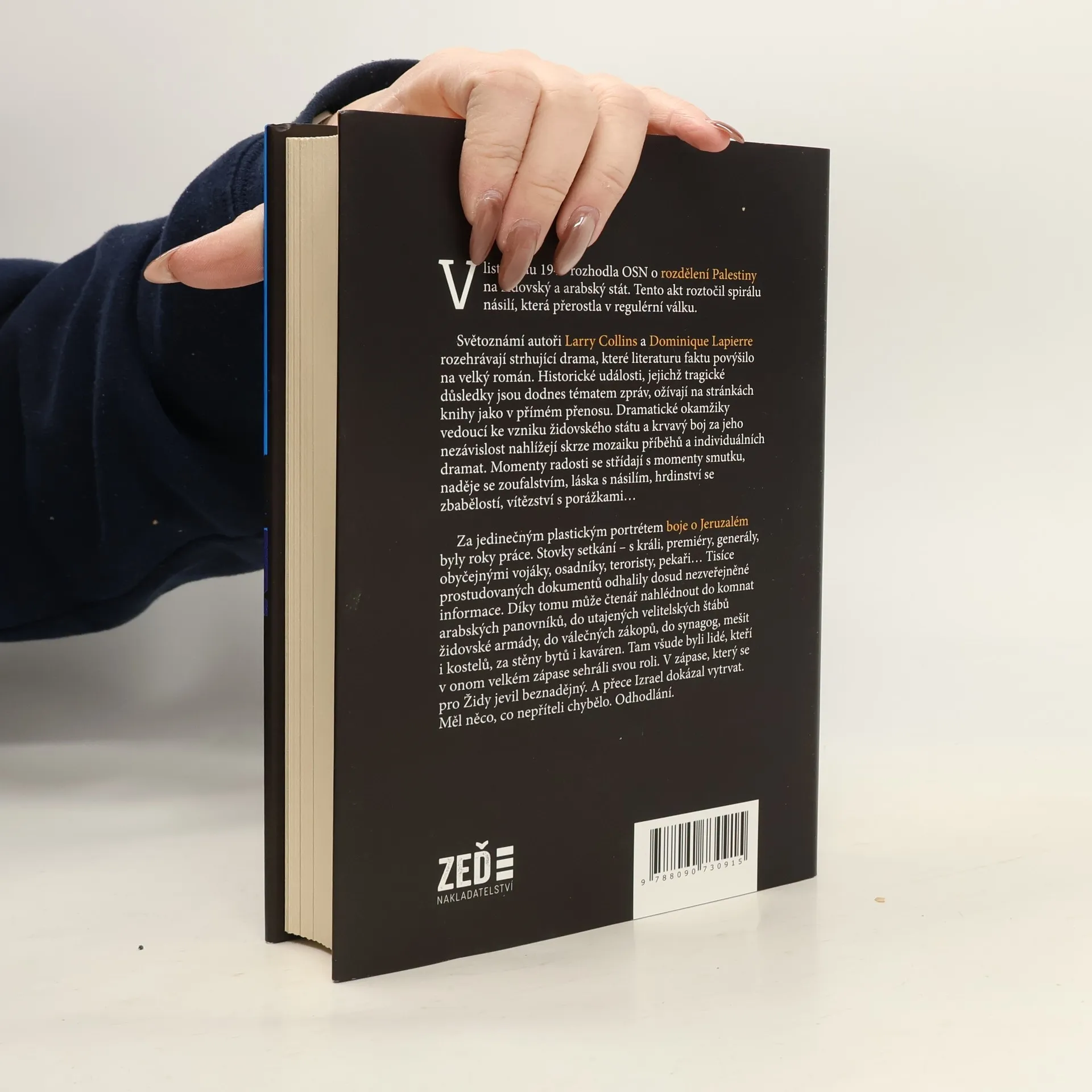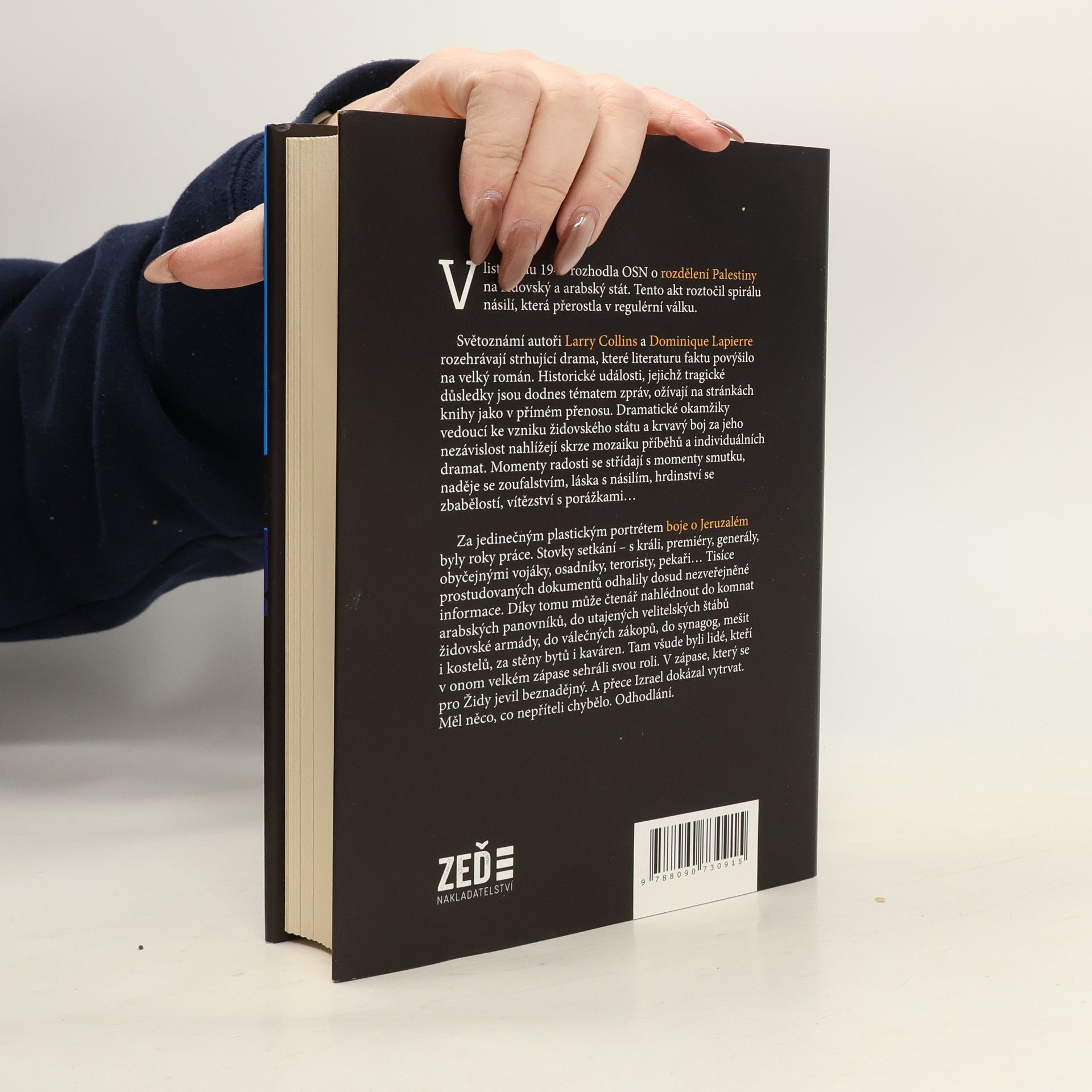 V listopadu 1947 rozhodla OSN o rozdělení Palestiny na židovský a arabský stát. Tento akt roztočil spirálu násilí, která přerostla v regulérní válku. Světoznámí autoři Larry Collins a Dominique Lapierre rozehrávají strhující drama, které literaturu faktu povýšilo na velký román. Historické události, jejichž tragické důsledky jsou dodnes tématem zpráv, ožívají na stránkách knihy jako v přímém přenosu. Dramatické okamžiky vedoucí ke vzniku židovského státu a krvavý boj za jeho nezávislost nahlížejí skrze mozaiku příběhů a individuálních dramat. Momenty radosti se střídají s momenty smutku, naděje se zoufalstvím, láska s násilím, hrdinství se zbabělostí, vítězství s porážkami… Za jedinečným plastickým portrétem boje o Jeruzalém byly roky práce. Stovky setkání – s králi, premiéry, generály, obyčejnými vojáky, osadníky, teroristy, pekaři… Tisíce prostudovaných dokumentů odhalily dosud nezveřejněné informace. Díky tomu může čtenář nahlédnout do komnat arabských panovníků, do utajených velitelských štábů židovské armády, do válečných zákopů, do synagóg, mešit i kostelů, za stěny bytů i kaváren. Tam všude byli lidé, kteří v onom velkém zápase sehráli svou roli. V zápase, který se pro Židy jevil beznadějný. A přece Izrael dokázal vytrvat. Měl něco, co nepříteli chybělo. Odhodlání.