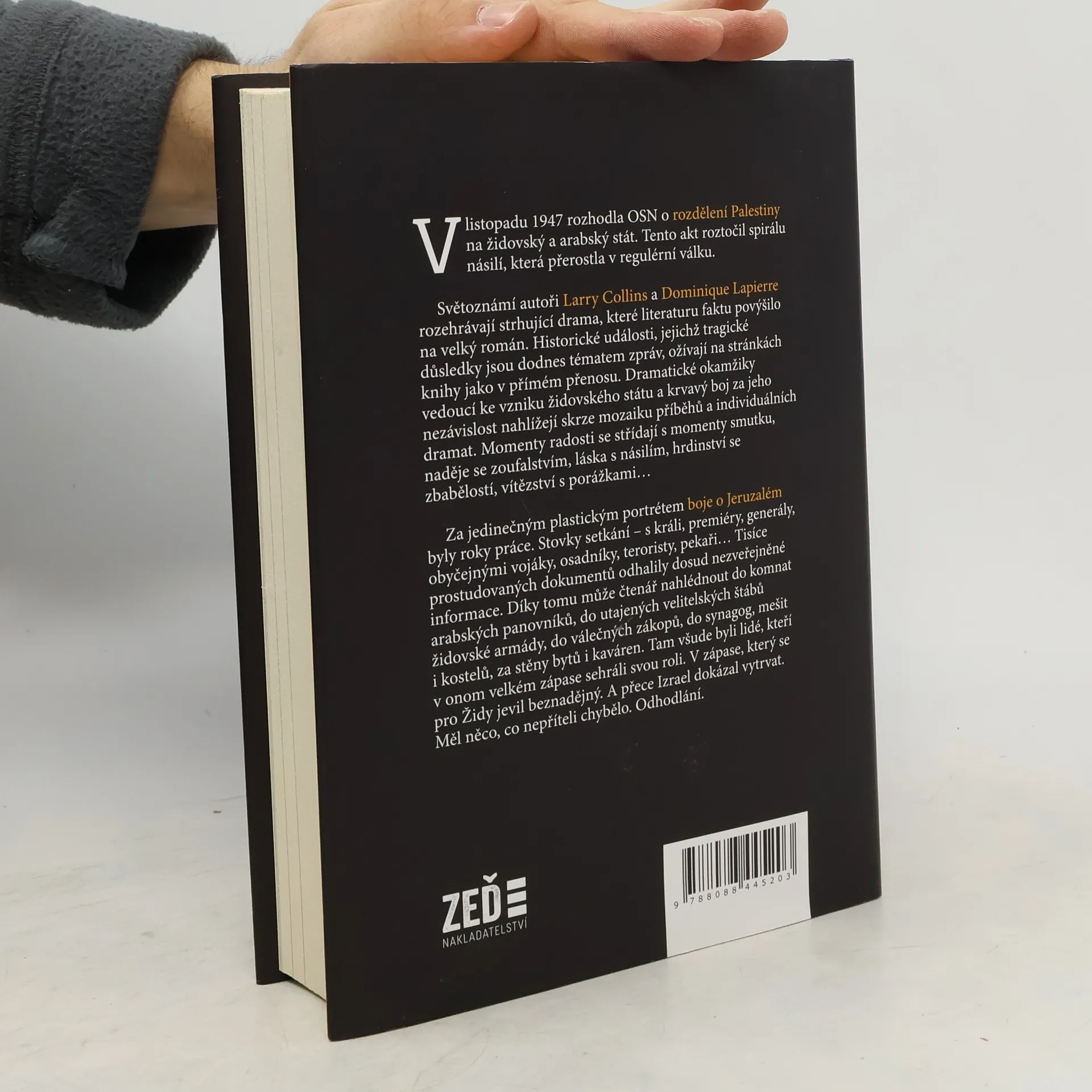 V listopadu 1947 rozhodla OSN o rozdělení Palestiny na židovský a arabský stát. Tento akt roztočil spirálu násilí, která přerostla v regulérní válku. Světoznámí autoři Larry Collins a Dominique Lapierre rozehrávají strhující drama, které literaturu faktu povýšilo na velký román. Historické události, jejichž tragické důsledky jsou dodnes tématem zpráv, ožívají na stránkách knihy jako v přímém přenosu. Dramatické okamžiky vedoucí ke vzniku židovského státu a krvavý boj za jeho nezávislost nahlížejí skrze mozaiku příběhů a individuálních dramat. Momenty radosti se střídají s momenty smutku, naděje se zoufalstvím, láska s násilím, hrdinství se zbabělostí, vítězství s porážkami Za jedinečným plastickým portrétem boje o Jeruzalém byly roky práce. Stovky setkání – s králi, premiéry, generály, obyčejnými vojáky, osadníky, teroristy, pekaři Tisíce prostudovaných dokumentů odhalily dosud nezveřejněné informace. Díky tomu může čtenář nahlédnout do komnat arabských panovníků, do utajených velitelských štábů židovské armády, do válečných zákopů, do synagóg, mešit i kostelů, za stěny bytů i kaváren. Tam všude byli lidé, kteří v onom velkém zápase sehráli svou roli. V zápase, který se pro Židy jevil beznadějný. A přece Izrael dokázal vytrvat. Měl něco, co nepříteli chybělo. Odhodlání.