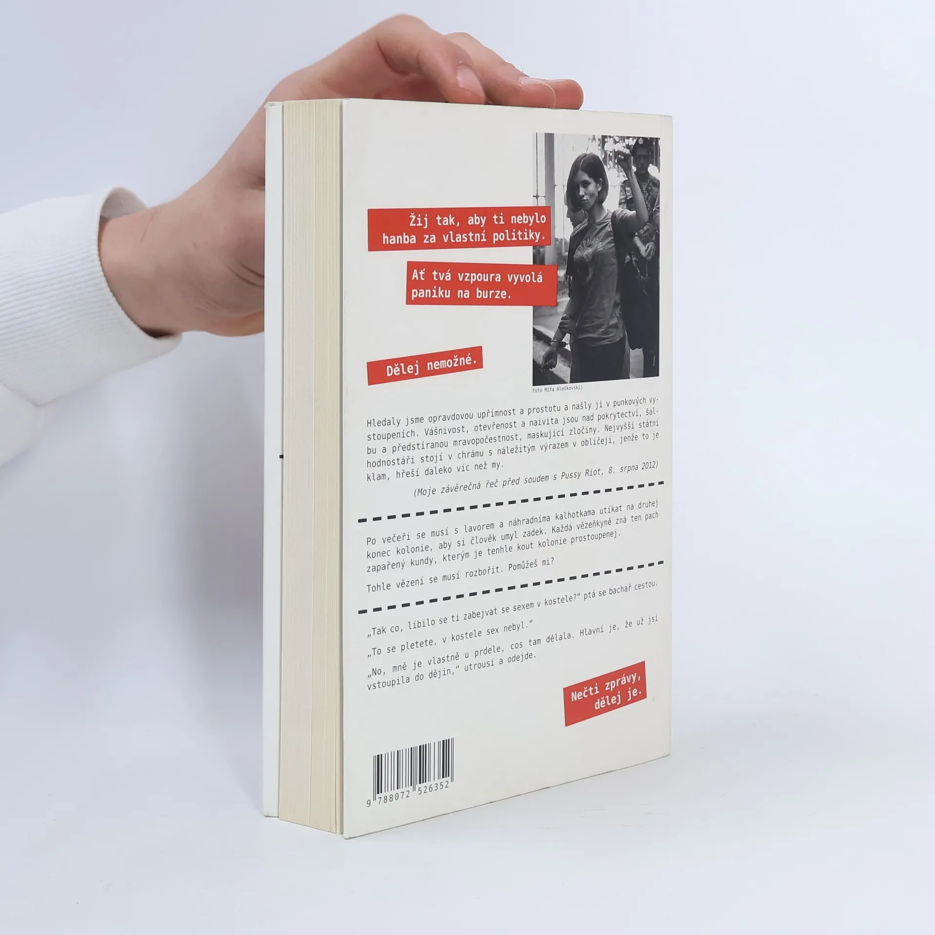 Naděžda Tolokinnikovová (odsouzená členka skupiny Pussy Riot) „Žij tak, aby ti nebylo hanba za vlastní politiky.“ Struhující, burcující a šokující vzpomínky členky skupiny Pussi Riot, jinak též studentky filozofie a aktivistky za lidská práva v Rusku. Obdržela několik mezinárodních cen. Nad vydáním v ČR vezme záštitu řada osobností veřejného života, například Michael Kocáb, Roman Týc (skupina Ztohoven) a další. Kniha je velkým protestem proti V. Putinovi, ale v našich podmínkách se může stát i protestem proti M. Zemanovi a veškeré měšťácké netoleranci.
