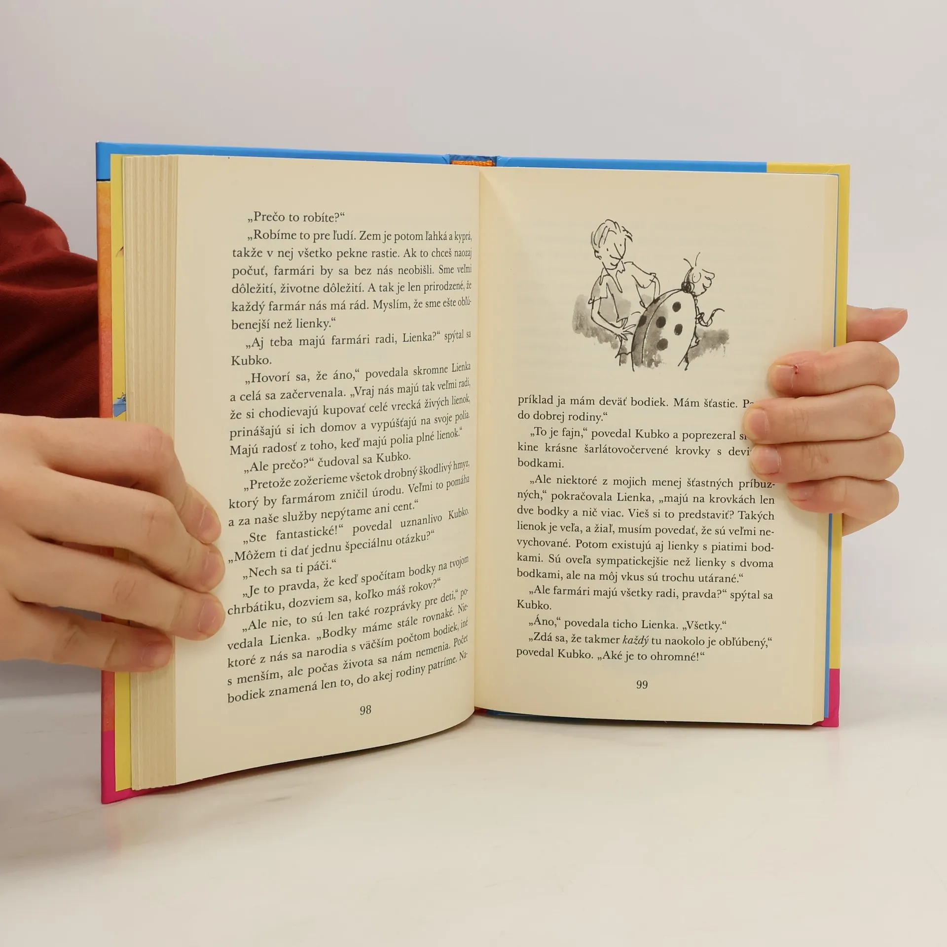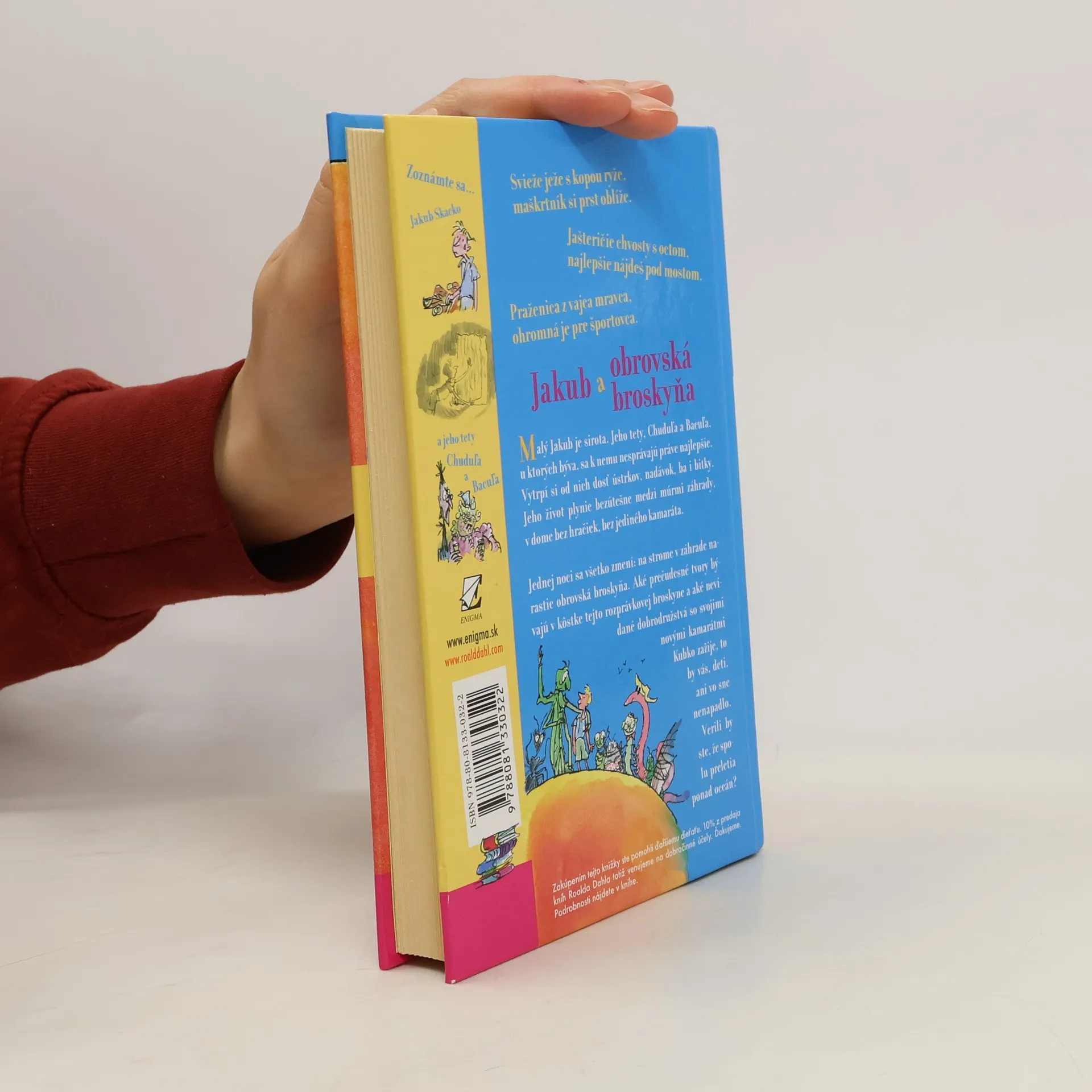 Malý Jakub je sirota. Jeho dve tety, Chuduľa a Bacuľa, s ktorými žije, sa k nemu veru nesprávajú práve najlepšie - vytrpí si od nich dosť ústrkov, nadávok ba i bitky. Jeho život plynie bezútešne, plný tvrdej práce medzi múrmi záhrady a domu, bez jediného priateľa. Jednej noci sa však všetko zmení: v záhrade vyrastie broskyňa obrovská ako dom. Kto býva v kôstke tejto rozprávkovej broskyne, by vás deti, ani vo sne nenapadlo. Tiež by ste si iste nepomysleli, že tieto prečudesné a na prvý pohľad strašné tvory sa stanú Jakubkovými najlepšími priateľmi, s ktorými prežije fantastickú cestu ponad oceán. Tento čarovný príbeh je ilustrovaný originálnymi kresbičkami Quentina Blaka, jedného z najuznávanejších britských ilustrátorov.