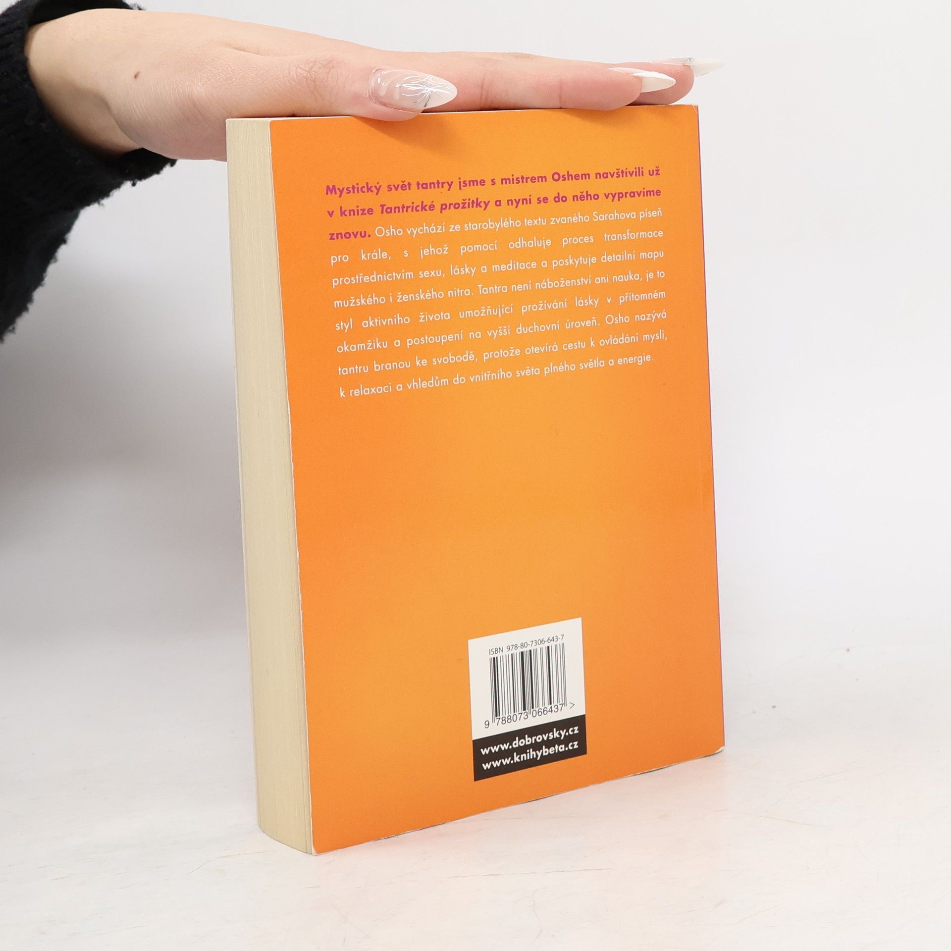 Hledání meditace a lásky. V této knize promluv nás mistr Osho zavádí do mystického světa tantry a poskytuje velmi detailní mapu odhalující nitro muže a ženy. Osho vychází ze starobylého textu zvaného Sarahova píseň pro krále, s jehož pomocí ukazuje proces transformace prostřednictvím sexu, lásky a meditace. Tantra není náboženství ani nauka, je to styl aktivního života umožňující prožívání lásky v přítomném okamžiku a postoupení na vyšší úrovně transformace. Osho nazývá tantru branou ke svobodě, protože otevírá cestu k ovládání mysli, relaxaci a k duchovním vhledům odhalujícím tajemství vnitřního světa plného světla a energie. Osho dokáže nesmírně poutavým způsobem spojovat dávné tradice se současností a zdůrazňuje, že člověk se v podstatě nemění a jeho problémy jsou po celá tisíciletí stále stejné. Proto využívá dávný text, jenž velmi výstižně odhaluje samotné základy tantry. Osho s jeho pomocí zároveň uvádí na pravou míru pojetí tantry, která si v dnešním západním světě získává stále větší oblibu, ale většinou bývá chápana zcela mylně. Jak říká Osho, je to úžasná cesta k sebepoznání a osvobození, je to setkání lásky a meditace...
