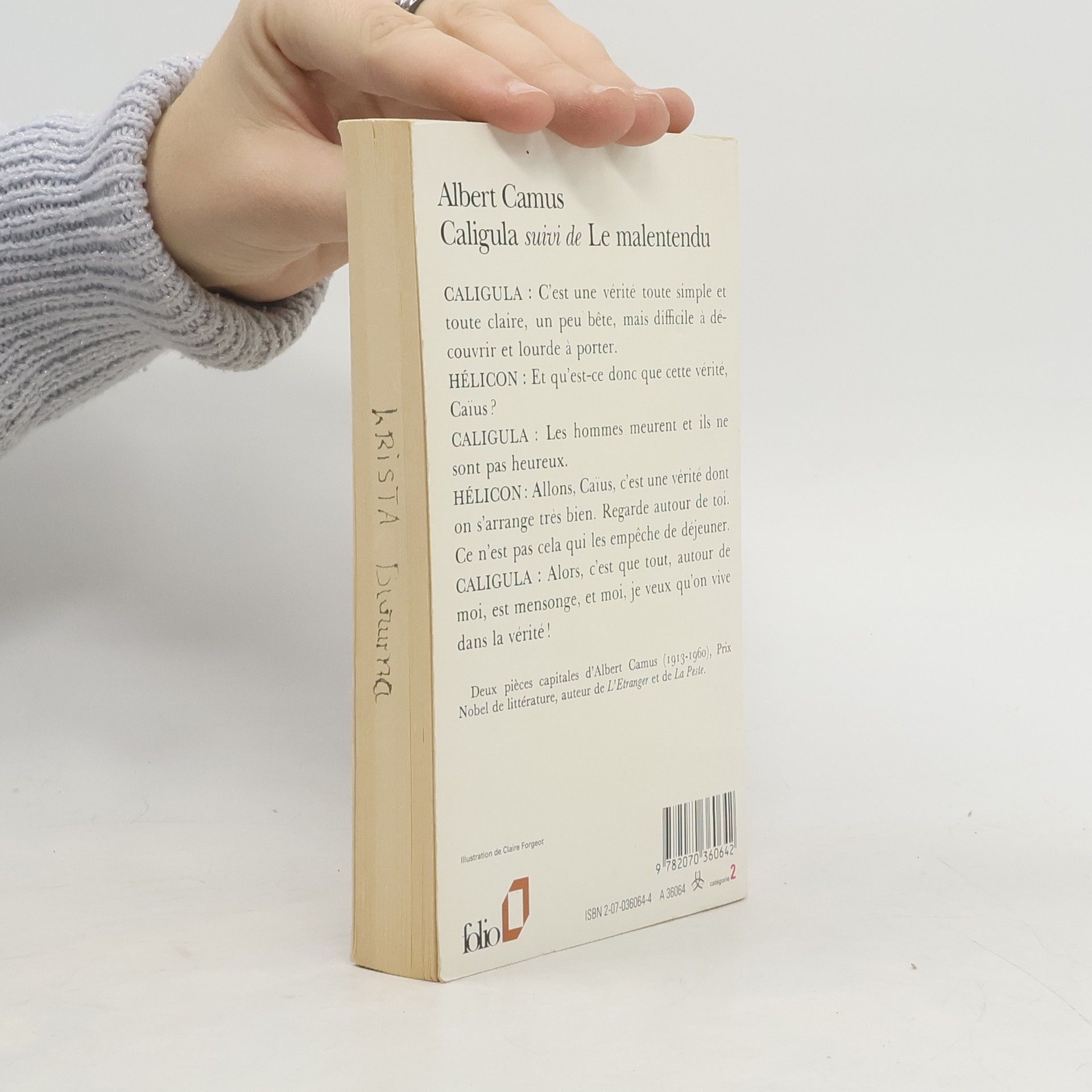 "Caligula : C'est une vérité toute simple et toute claire, un peu bête, mais difficile à découvrir et lourde à porter.Hélicon : Et qu'est-ce donc que cette vérité, Caïus ?Caligula : Les hommes meurent et ils ne sont pas heureux.Hélicon : Allons, Caïus, c'est une vérité dont on s'arrange très bien. Regarde autour de toi. Ce n'est pas cela qui les empêche de déjeuner.Caligula : Alors, c'est que tout, autour de moi, est mensonge, et moi, je veux qu'on vive dans la vérité !"