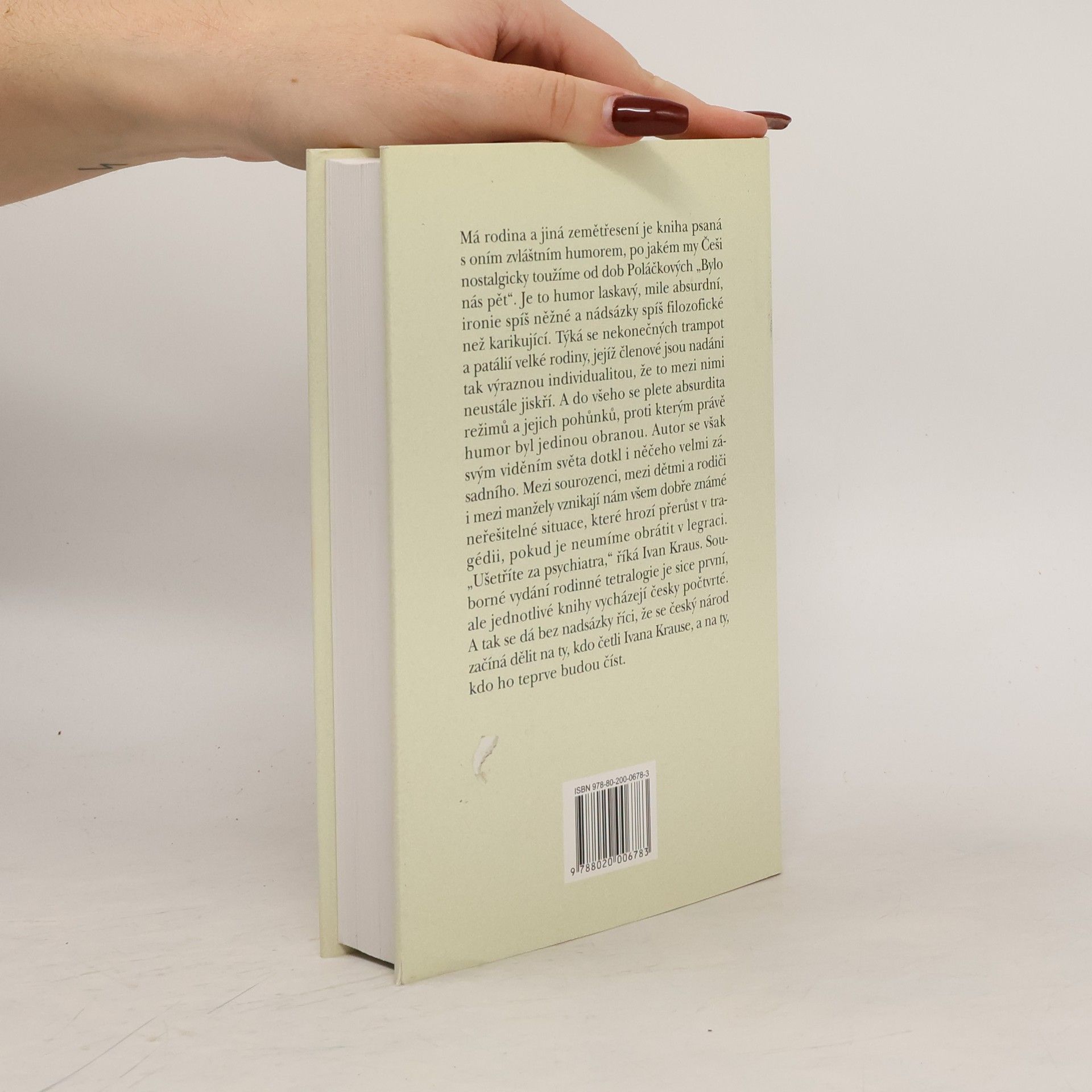 "Má rodina a jiná zemětřesení" je kniha povídek s oním zvláštním humorem, po kterém Češi nostalgicky touží od dob Poláčkova "Bylo nás pět". Tento laskavý, mile absurdní humor s něžnou ironií a filozofickou nadsázkou se zaměřuje na nekonečné trampoty a patálie velké rodiny, jejíž členové mají tak výrazné individuality, že to mezi nimi neustále vře. Absurdní režimy a jejich pohůnci, proti kterým je humor jedinou obranou, se do toho všeho pletou. Autor se svým viděním světa dotýká zásadních věcí, kdy mezi sourozenci, dětmi a rodiči i mezi manžely vznikají nám dobře známé neřešitelné situace, které hrozí přerůst v tragédii, pokud je neumíme obrátit v legraci. "Ušetříte za psychiatra," říká Ivan Kraus. Soudobé vydání rodinné tetralogie, zahrnující knihy "To na tobě doschne," "Prosím tě, neblázni," "Číslo do nebe" a "Rodinný sjezd," je první, ale jednotlivé knihy vyšly čtyřikrát. S nadsázkou líčené osudy početné rodiny plné individualit za různých tuzemských režimů v celkem 82 krátkých povídkách ukazují autorova pravidla konstrukce textu, práci s nadsázkou a ironií, kde vyprávění spíše ukončuje, než uzavírá. Povídky jsou si podobné, přesto lze sledovat jejich vývoj i různou úroveň a spolu s autorem se zpětně zasmát nad minulým režimem, i když to nebude smích nezvladatelný. Bez nadsázky lze říci, že se český národ začíná dělit na ty, kdo četli Krause, a na ty, kdo ho teprve budou číst.