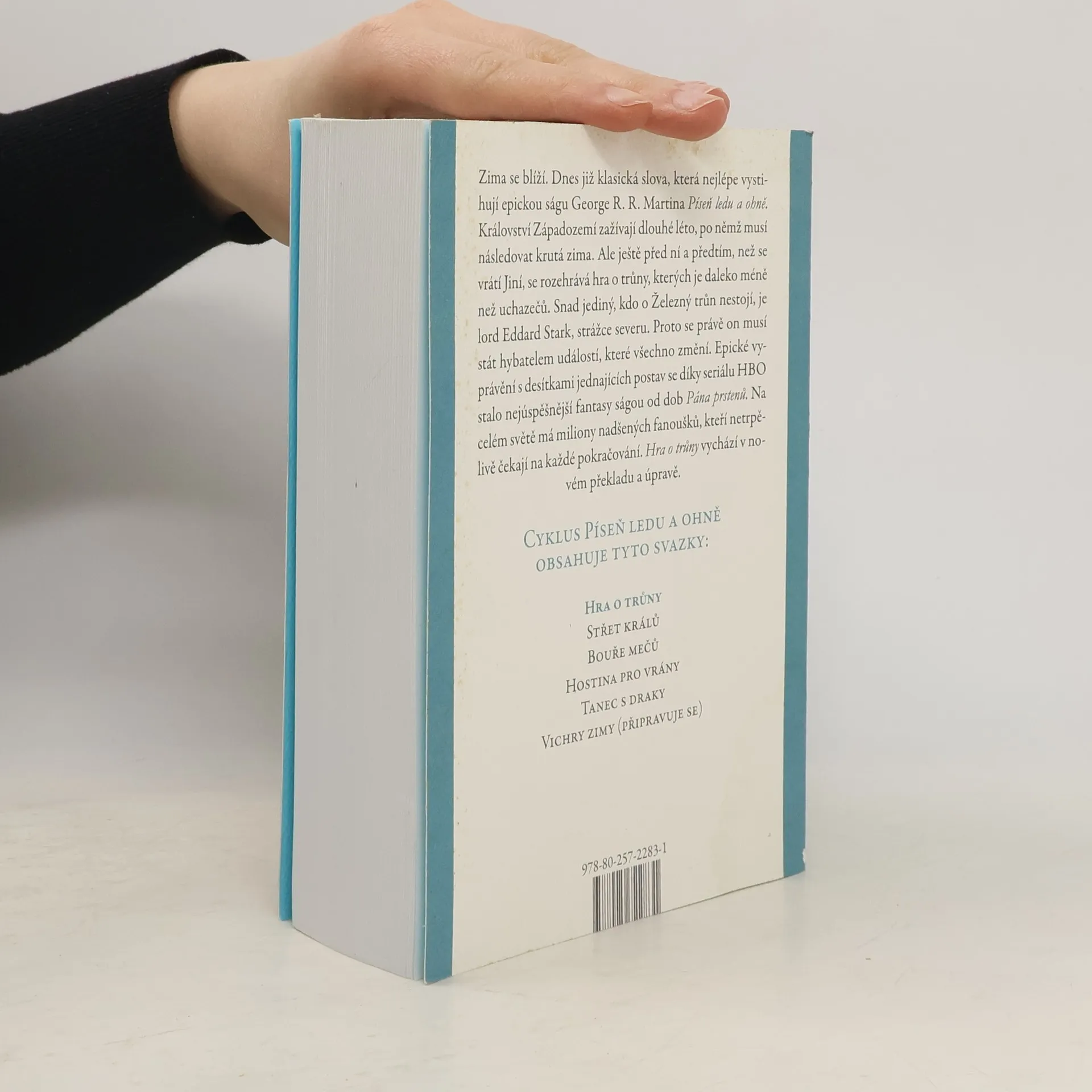 Zima se blíží. Dnes již klasická slova, která nejlépe vystihují epickou ságu George R. R. Martina Píseň ledu a ohně. Království Západozemí zažívají dlouhé léto, po němž musí následovat krutá zima. Ale ještě před ní a předtím, než se vrátí Jiní, se rozehrává hra o trůny, kterých je daleko méně než uchazečů. Snad jediný, kdo o Železný trůn nestojí, je lord Eddard Stark, strážce severu. Proto se právě on musí stát hybatelem událostí, které všechno změní. Epické vyprávění s desítkami postav se díky seriálu HBO stalo nejúspěšnější fantasy ságou od dob Pána prstenů. Na celém světě má miliony nadšených fanoušků, kteří netrpělivě čekají na každé pokračování. Hra o trůny vychází česky v novém překladu a úpravě.