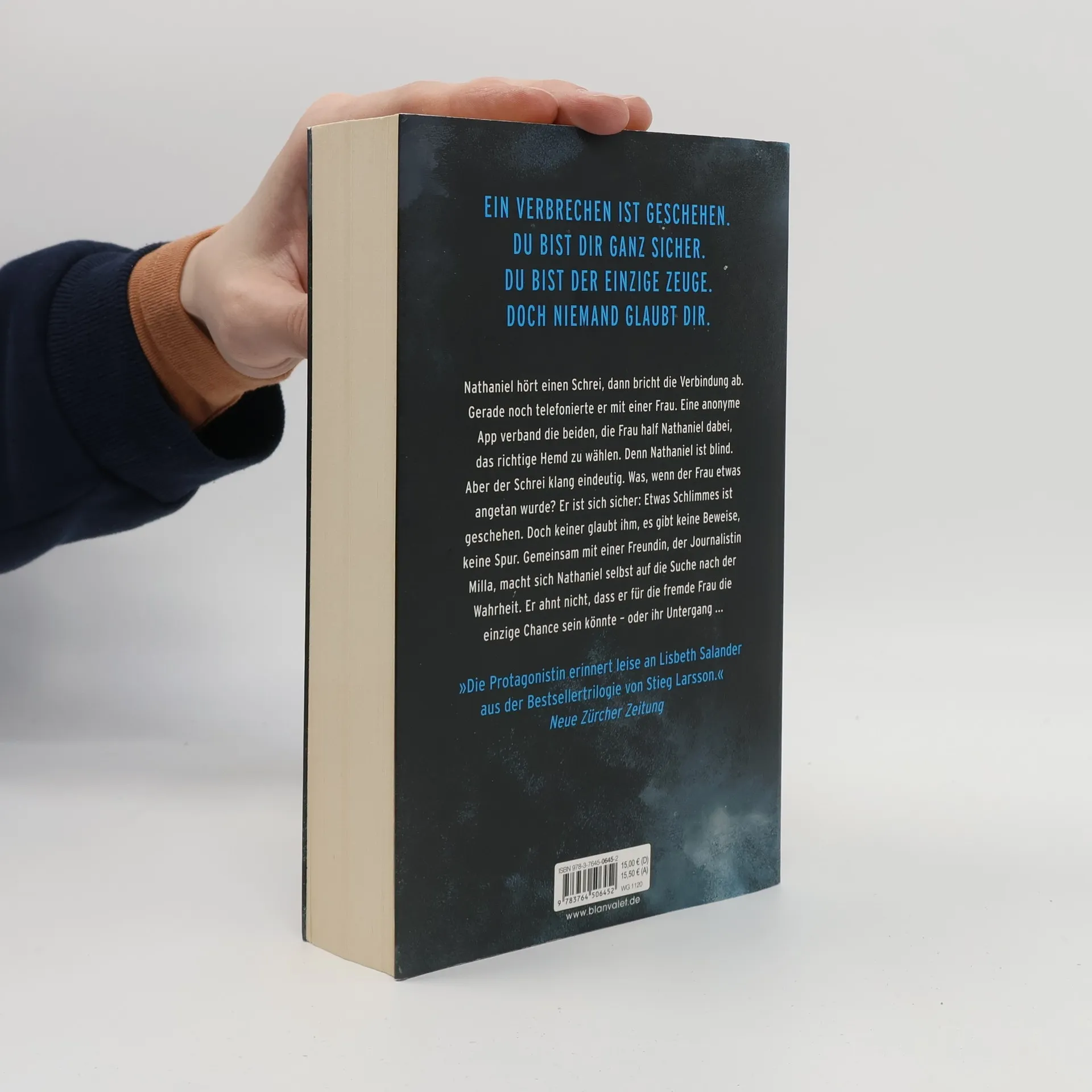 »Eine genial spannende Idee meisterhaft umgesetzt. Krimikunst vom Feinsten!« Sebastian Fitzek Nathaniel hört einen Schrei, dann bricht die Verbindung ab. Gerade noch telefonierte er mit einer Frau. Eine anonyme App verband die beiden, die Frau half Nathaniel dabei, das richtige Hemd zu wählen. Denn Nathaniel ist blind, doch der Schrei klang eindeutig. Was, wenn der Frau etwas angetan wurde? Er ist sich sicher: Es muss ein Verbrechen sein. Doch keiner glaubt ihm, es gibt keine Beweise, keine Spur. Gemeinsam mit einer Freundin, der Journalistin Milla, macht sich Nathaniel selbst auf die Suche nach der Wahrheit. Er ahnt nicht, dass er für die fremde Frau die einzige Chance sein könnte – oder ihr Untergang ...