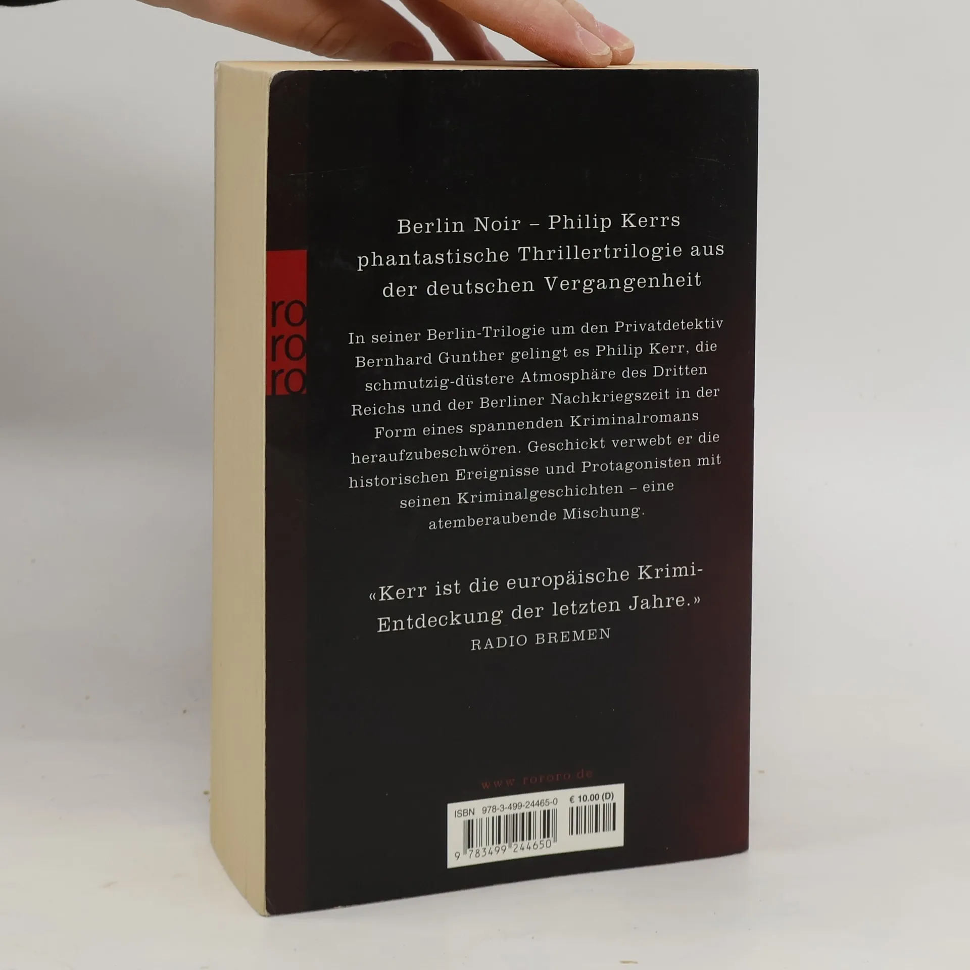 Berlin Noir – Philip Kerrs phantastische Thrillertrilogie aus der deutschen Vergangenheit In seiner Berlin-Trilogie um den Privatdetektiv Bernhard Gunther gelingt es Philip Kerr, die schmutzig-düstere Atmosphäre des Dritten Reichs und der Berliner Nachkriegszeit in der Form eines spannenden Kriminalromans heraufzubeschwören. Geschickt verwebt er die historischen Ereignisse und Protagonisten mit seinen Kriminalgeschichten – eine atemberaubende Mischung. «Kerr ist die europäische Krimi Entdeckung der letzten Jahre.» RADIO BREMEN