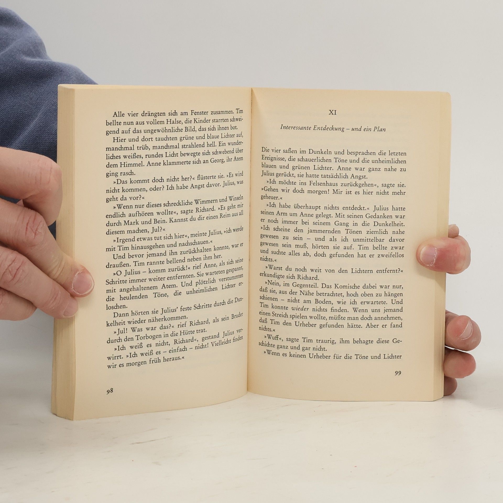 Beim Zelten entdecken Anne und George eine verfallene Hütte. Sie scheint unbewohnt, doch als Anne sich in der Nacht etwas zu trinken holen will, beobachtet sie, wie dort immer wieder ein Licht an- und ausgeschaltet wird. Kann damit der seltsame Junge etwas zu tun haben, dem die Freunde immer wieder begegnen, der sich aber nicht immer an sie erinnert? Als sie anfangen, die Hütte näher in Augenschein zu nehmen, entdecken sie einen Geheimgang ... Ausstattung: Mit s/w Illustrationen