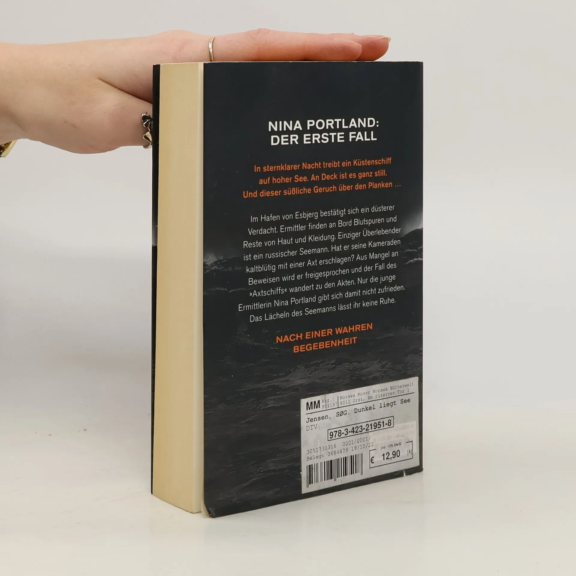 Die junge Frau und das Meer – Nina Portlands erster Fall Verlassen treibt ein Küstenschiff auf hoher See. An Deck ist es ganz still. Und dieser süßliche Geruch über den Planken … Im Hafen von Esbjerg scheint sich ein düsterer Verdacht zu bestätigen. Ermittler finden an Bord Blutspuren und Reste von Haut und Kleidung. Einziger Überlebender ist der Seemann Vitali Romaniuk. Hat der Russe seine Kameraden kaltblütig mit einer Axt ermordet? Aus Mangel an Beweisen wird er freigesprochen. Der Fall des »Axtschiffs« wandert zu den Akten. Nur die junge Ermittlerin Nina Portland gibt sich damit nicht zufrieden. Das Lächeln des Seemanns lässt ihr keine Ruhe. Als sie ihm viel später zufällig begegnet, setzt sie sich auf seine Spur. Und findet heraus, dass das, was damals nachts auf der MS Ursula geschah, erst der Anfang war.