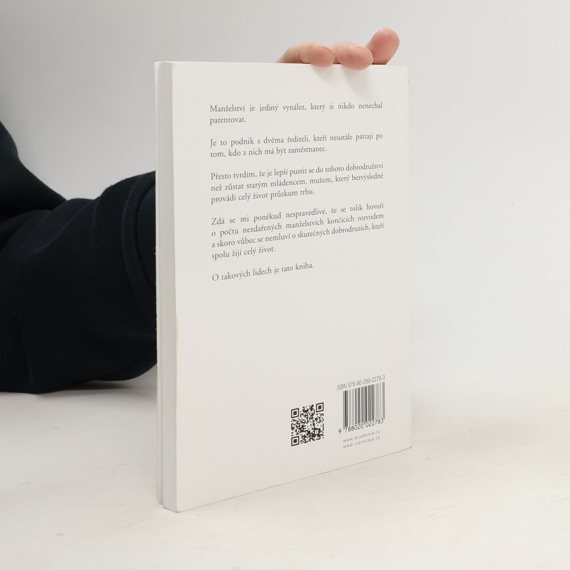Manželství je jediný vynález, který si nikdo nenechal patentovat. Je to podnik s dvěma řediteli, kteří neustále pátrají po tom, kdo z nich má být zaměstnanec. Přesto tvrdím, že je lepší pustit se do tohoto dobrodružství než zůstat starým mládencem, mužem, který bezvýsledně provádí celý život průzkum trhu. Zdá se mi poněkud nespravedlivé, že se tolik hovoří o počtu nezdařených manželství končících rozvodem a skoro vůbec se nemluví o skutečných dobrodruzích, kteří spolu žijí celý život. O takových lidech je tato kniha.
