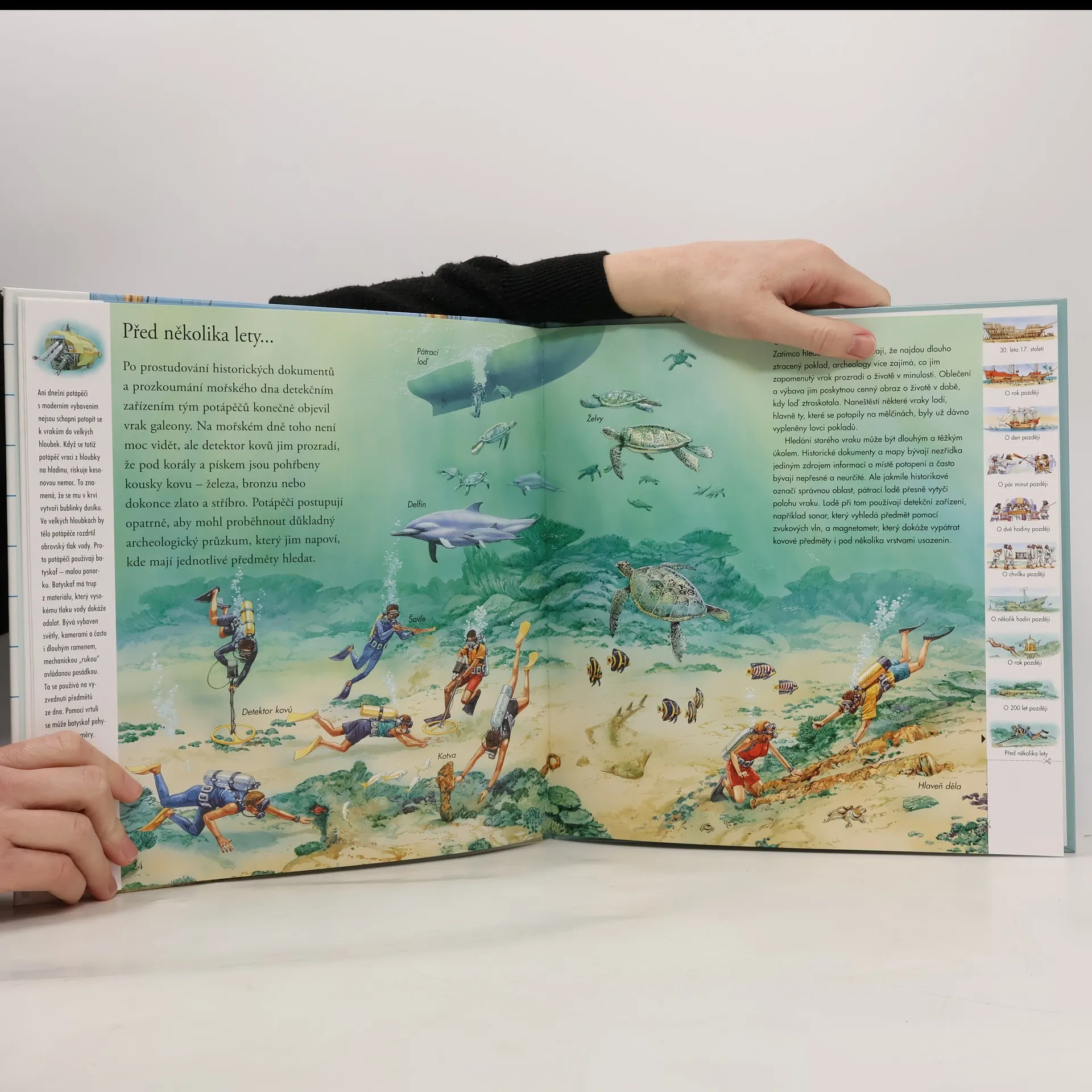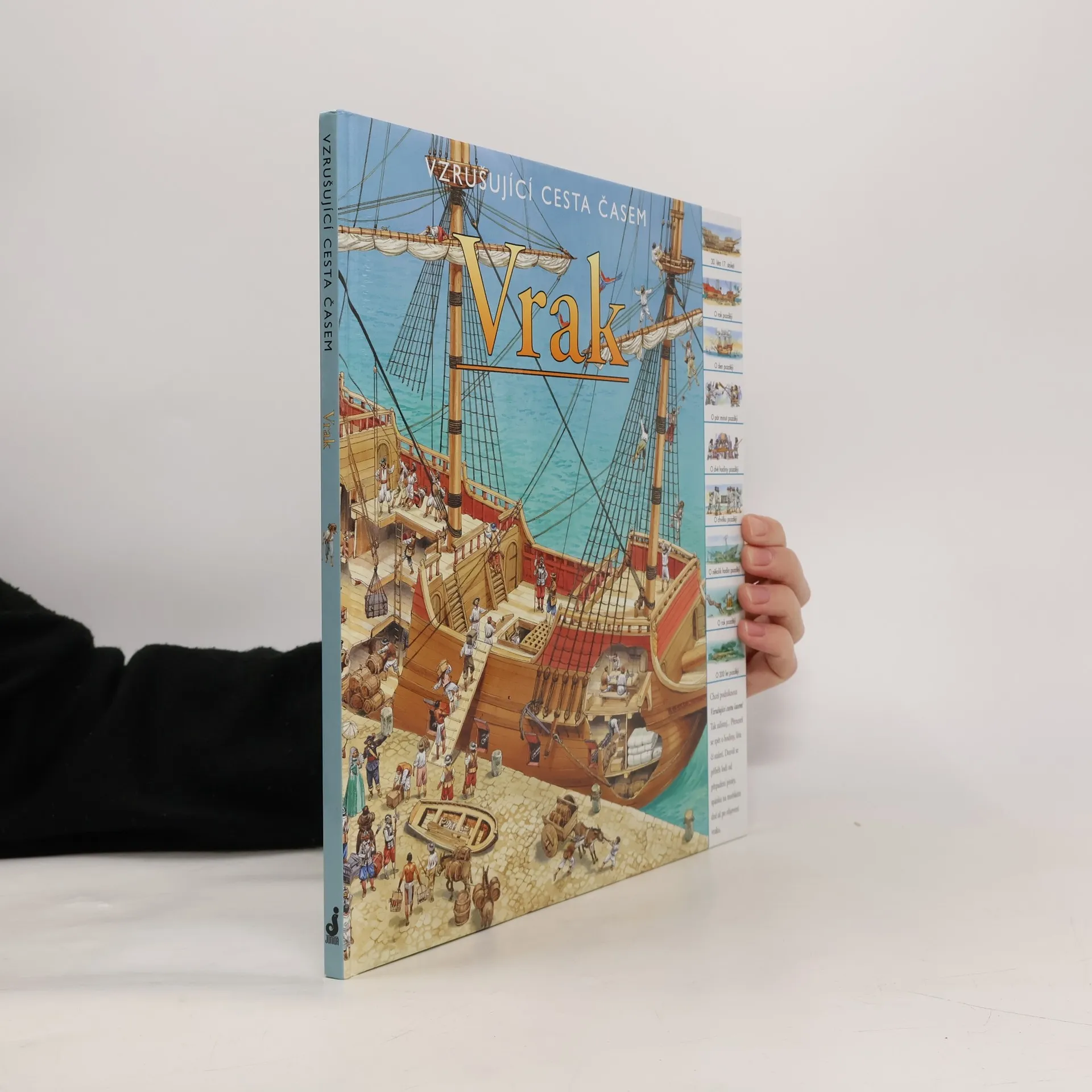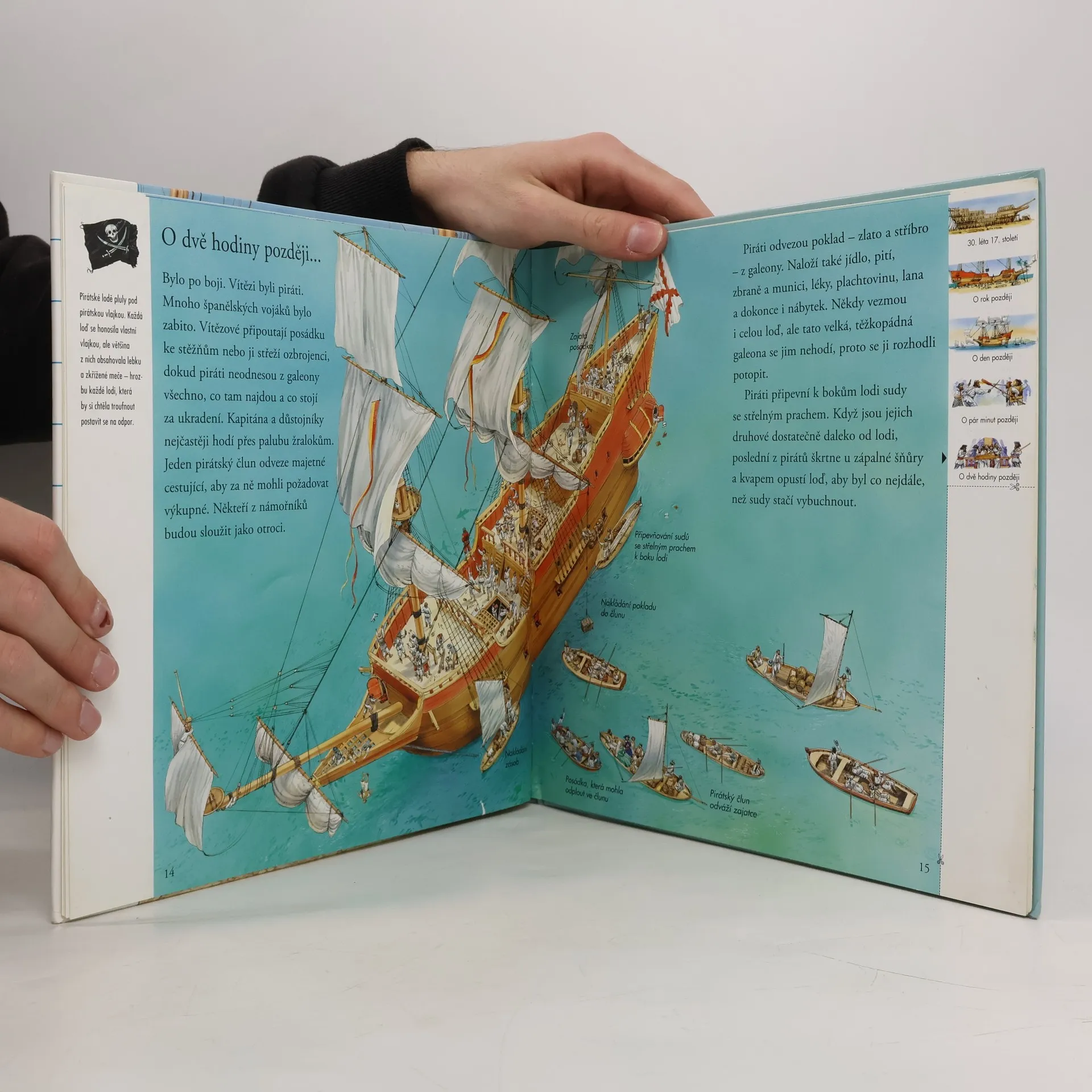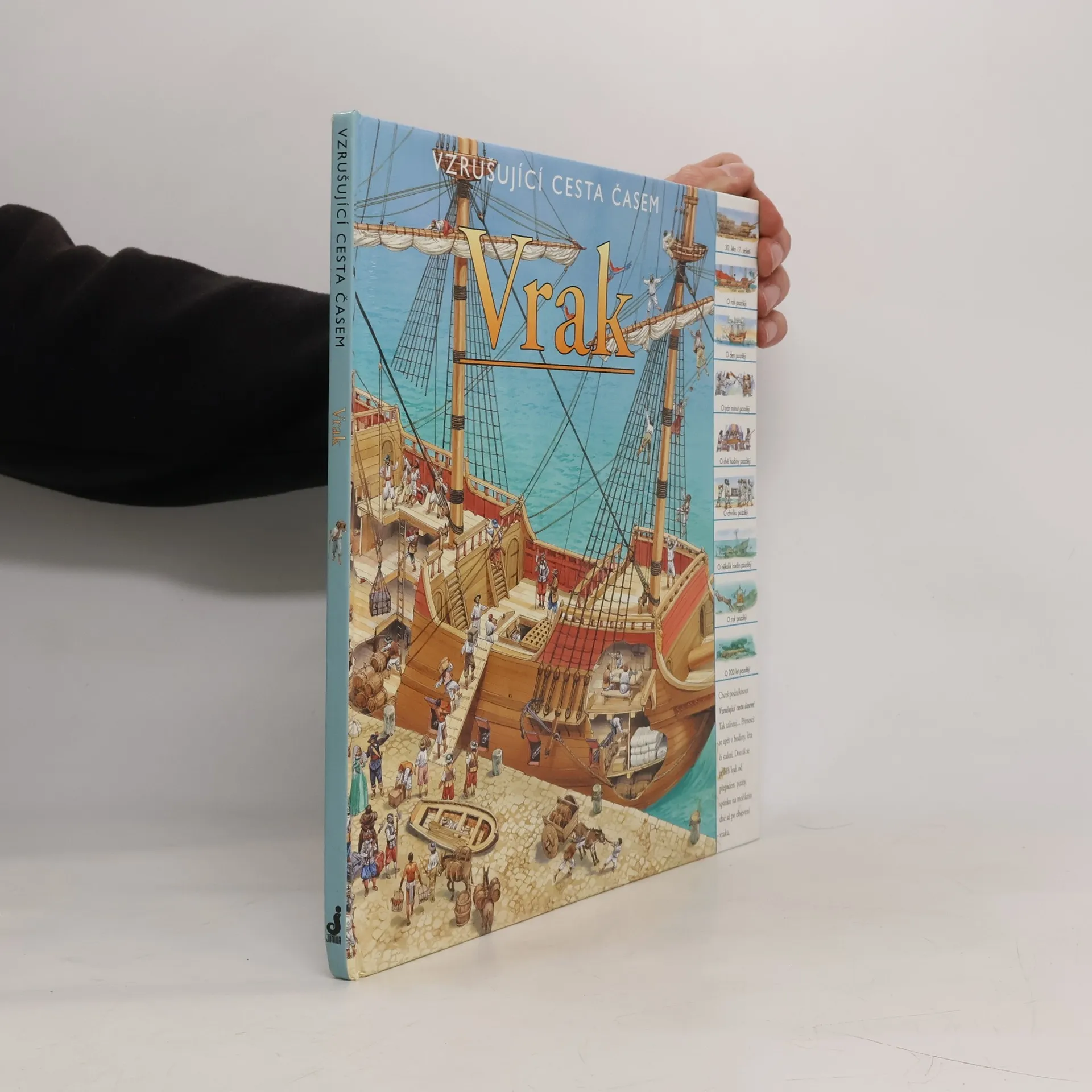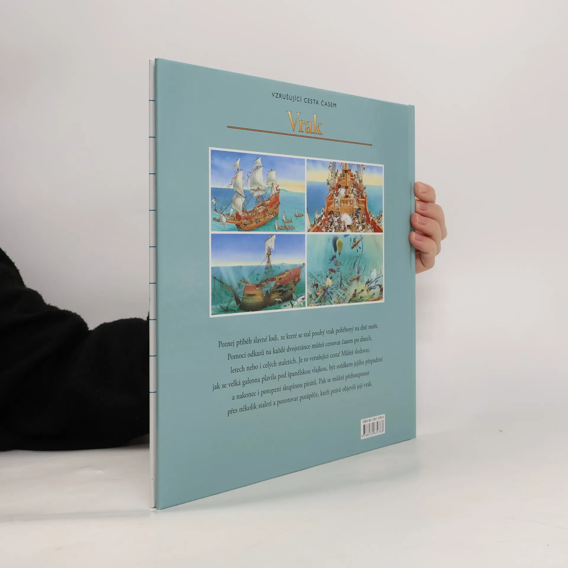 Chceš podniknout Vzrušující cestu časem? Tak zalistuj. Přeneseš se zpět o hodiny, léta či staletí. Poznej příběh slavné lodi, ze které se stal pouhý vrak pohřbený na dně moře. Pomocí odkazů na každé dvojstránce můžeš cestovat časem po dnech, letech nebo i celých staletích. Je to vzrušující cesta! Můžeš sledovat, jak se velká galeona plavila pod španělskou vlajkou, být svědkem jejího přepadení a nakonec i potopení skupinou pirátů. Pak se můžeš přehoupnout přes několik staletí a pozorovat potápěče, kteří právě objevili její vrak.