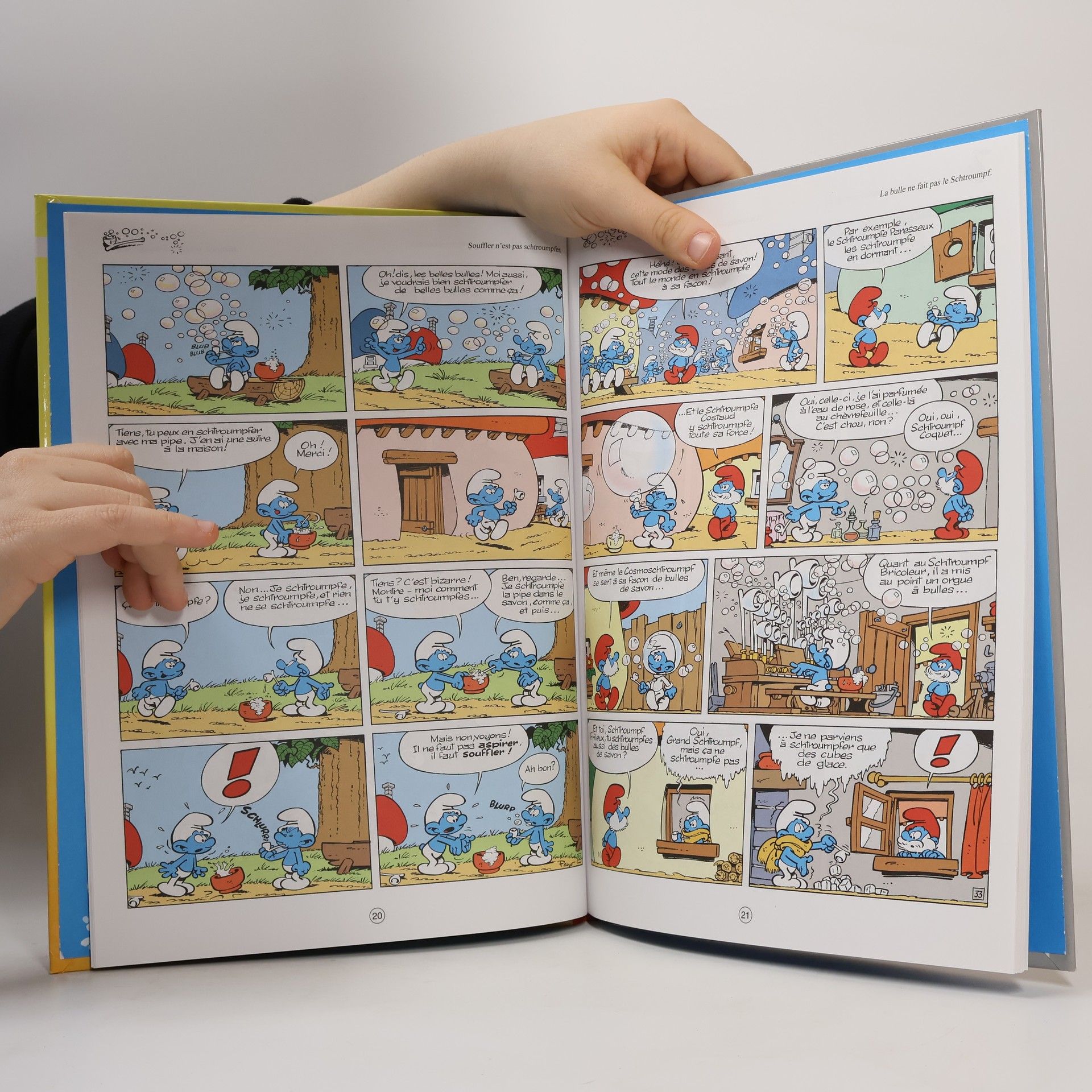 Ce tome est différent du reste de la série "classique" car au lieu de mettre en scène une ou plusieurs histoires de nos amis bleus, il nous propose une cinquantaine de gags qui tiennent chacun en une planche ...Chacune de ces mini-histoires tourne autour d'un thème précis que le titre illustre parfaitement : on a droit à des proverbes connus de notre belle langue transposés dans le langage schtroumpf.