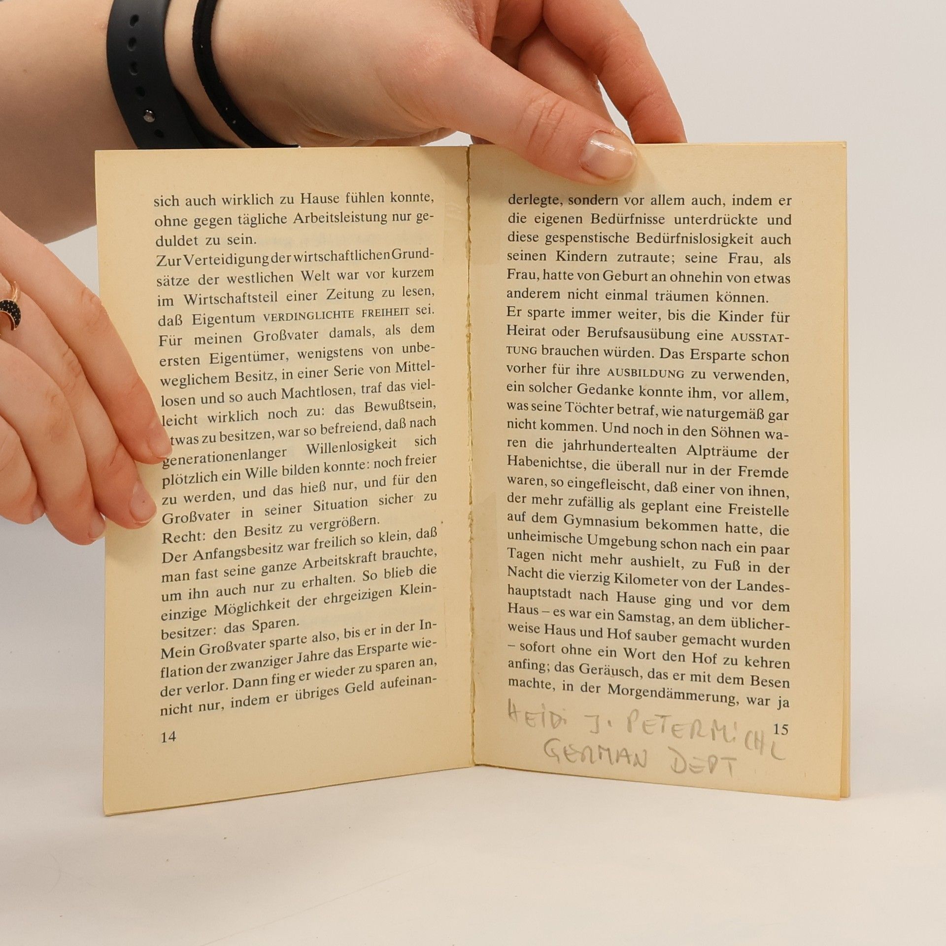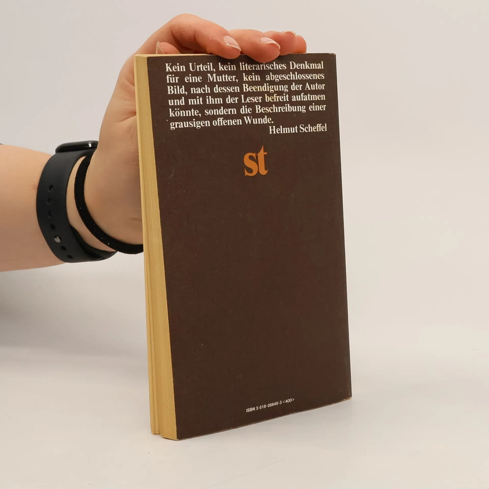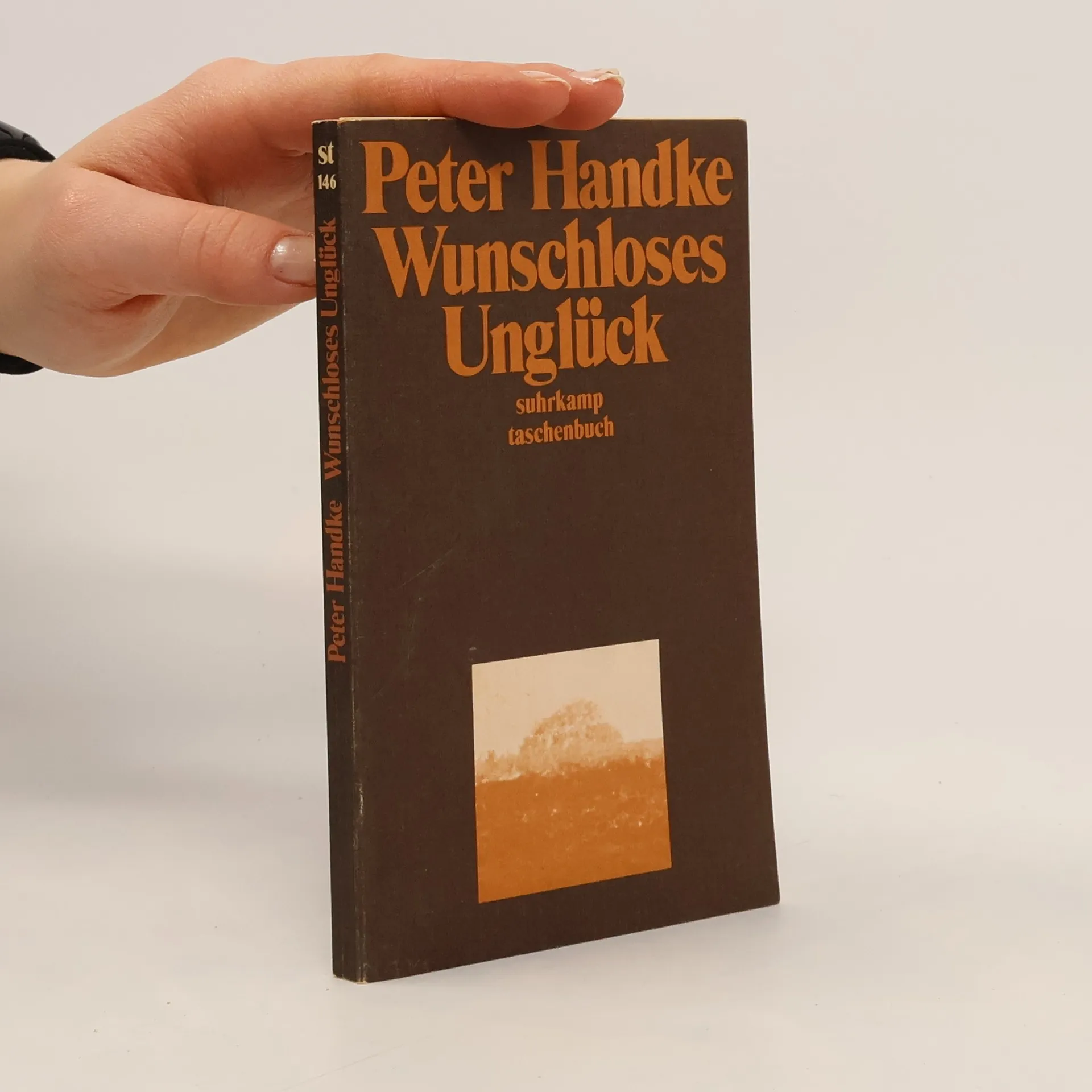 Ausgabe in großer Schrift „Unter der Rubrik VERMISCHTES stand in der Sonntagsausgabe der Kärntner ‚Volkszeitung’ folgendes: ‚In der Nacht zum Samstag verübte eine 51jährige Hausfrau aus A. (Gemeinde G.) Selbstmord durch Einnehmen einer Überdosis von Schlaftabletten.’ Es ist inzwischen fast sieben Wochen her, seit meine Mutter tot ist, und ich möchte mich an die Arbeit machen, bevor das Bedürfnis, über sie zu schreiben, das bei der Beerdigung so stark war, sich in die stumpfsinnige Sprachlosigkeit zurückverwandelt, mit der ich auf die Nachricht von dem Selbstmord reagierte.“ Peter Handke, geboren 1942 in Griffen (Kärnten), lebt heute in Paris.
